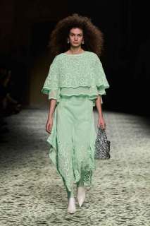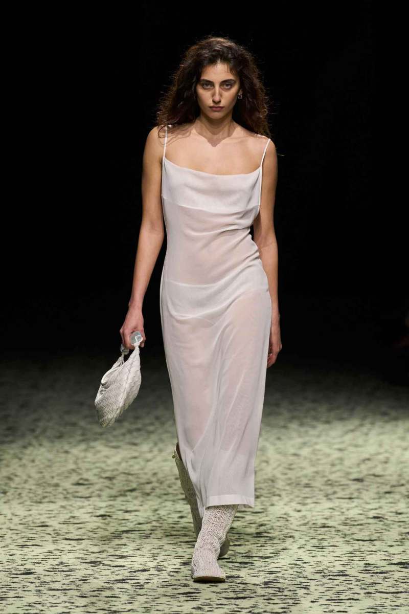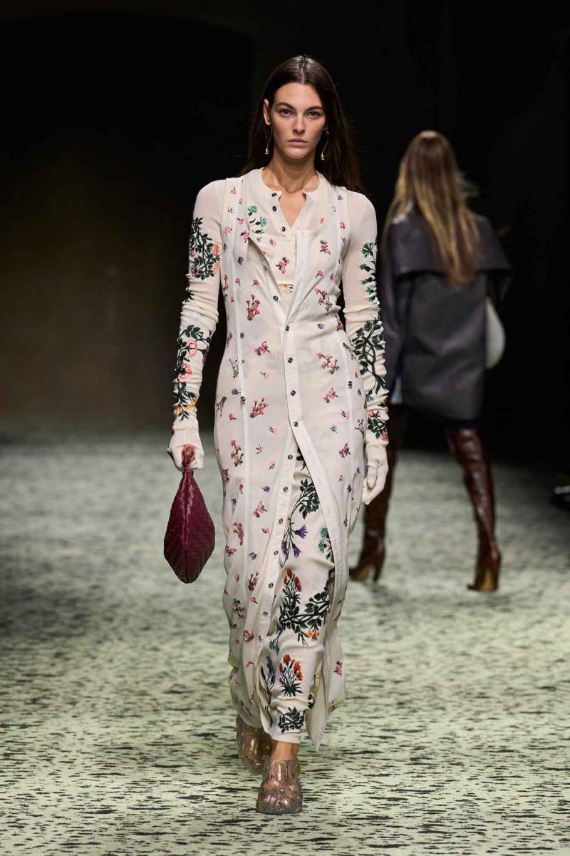 La location accoglie i due corridori di Ercolano che emanano un forte richiamo alle origini, all’antichità, ma anche al movimento. Un flusso di abiti che portano con sé l’heritage di Bottega Veneta verso un futuro che traccia nuove direzioni per la maison. Le celebri Clori e Flora, protagoniste della primavera di Botticelli, vengono reinventate e vestite di abiti in seta con dettagli ricamati minuziosamente a mano.