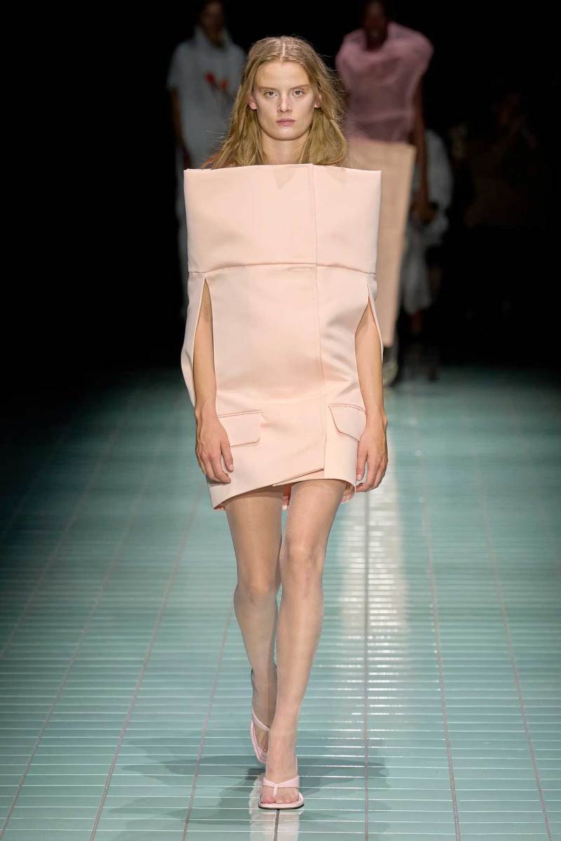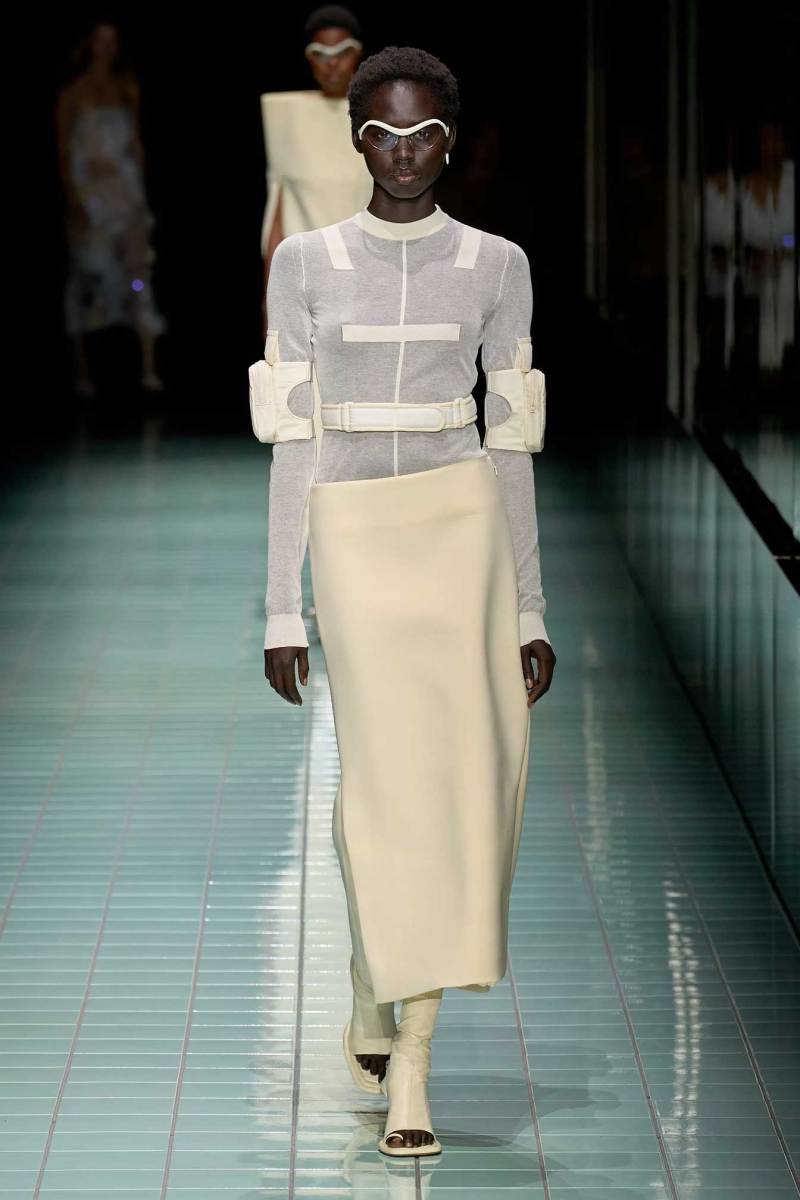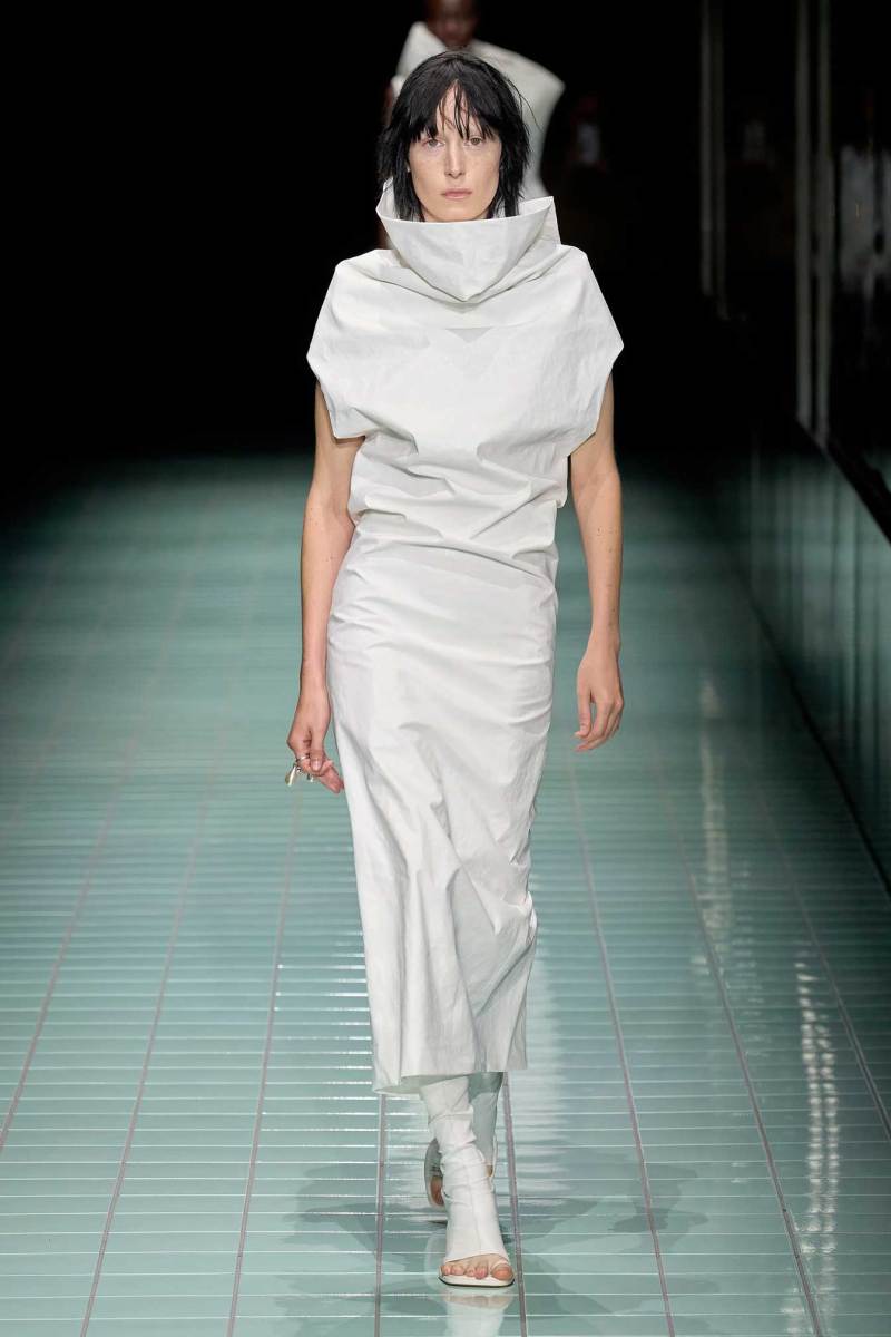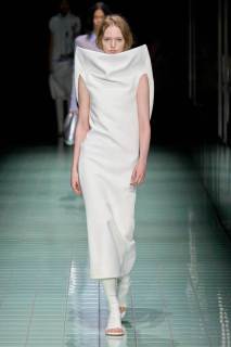 Il bianco è il colore principale e si manifesta attraverso svariate sfumature; è poi animato da cromie più acide e delicate. Anche i materiali si alternano in contrasto, alcuni strutturati e imbottiti, altri più leggeri, come raso lucido e PVC. Una passerella all’insegna di astrazione, controllo, purezze e contrasti.