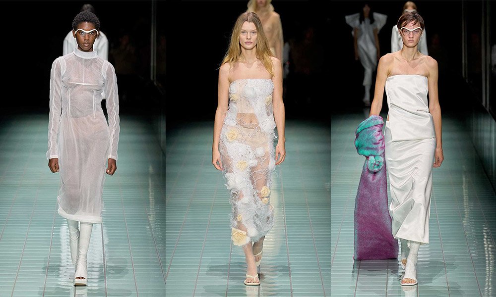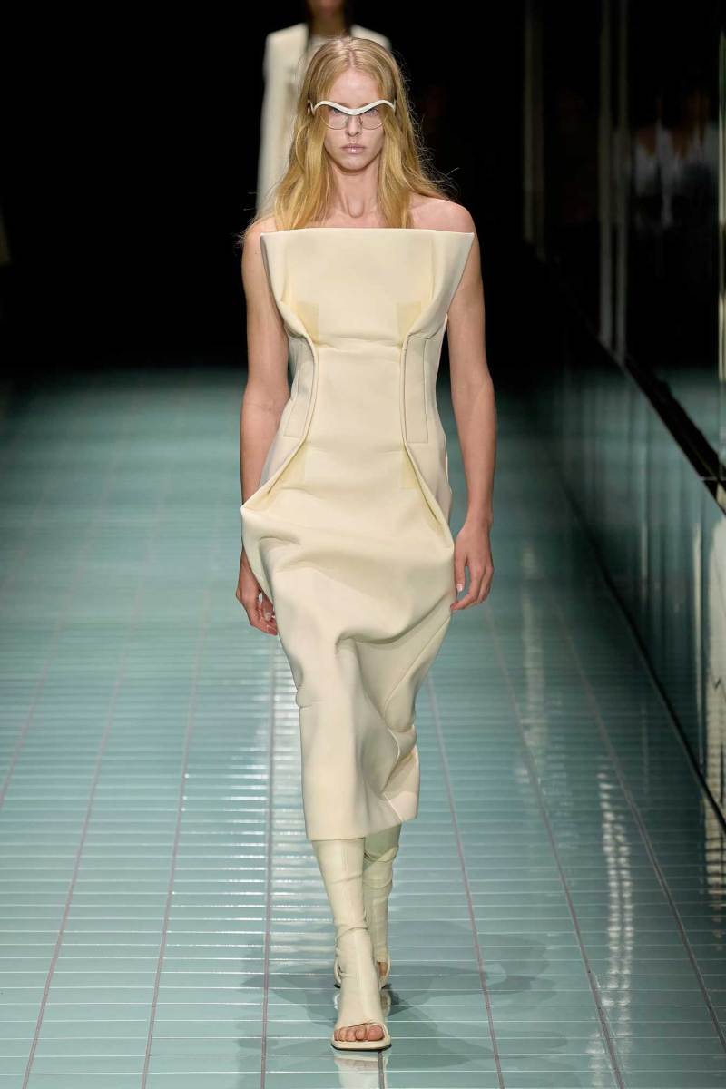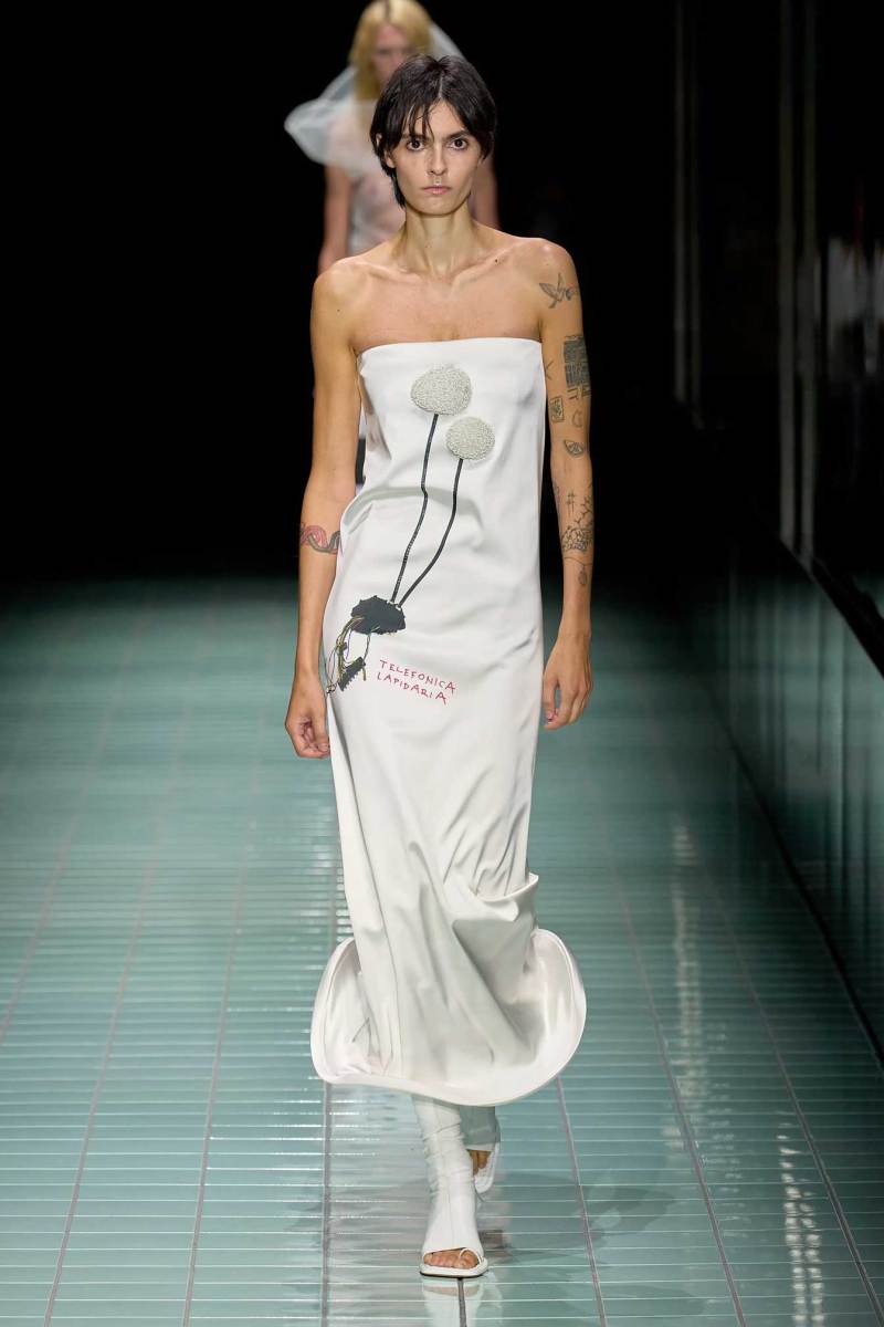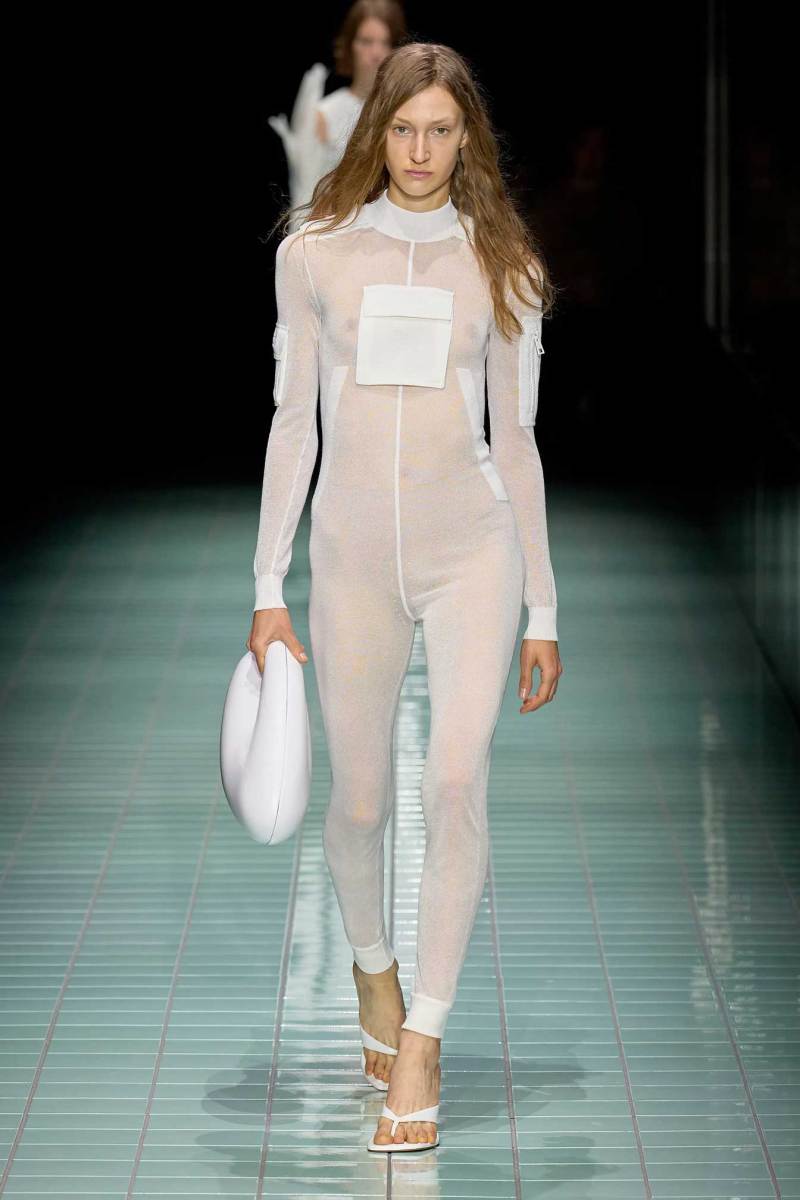 Il bianco è il colore principale e si manifesta attraverso svariate sfumature; è poi animato da cromie più acide e delicate. Anche i materiali si alternano in contrasto, alcuni strutturati e imbottiti, altri più leggeri, come raso lucido e PVC. Una passerella all’insegna di astrazione, controllo, purezze e contrasti.