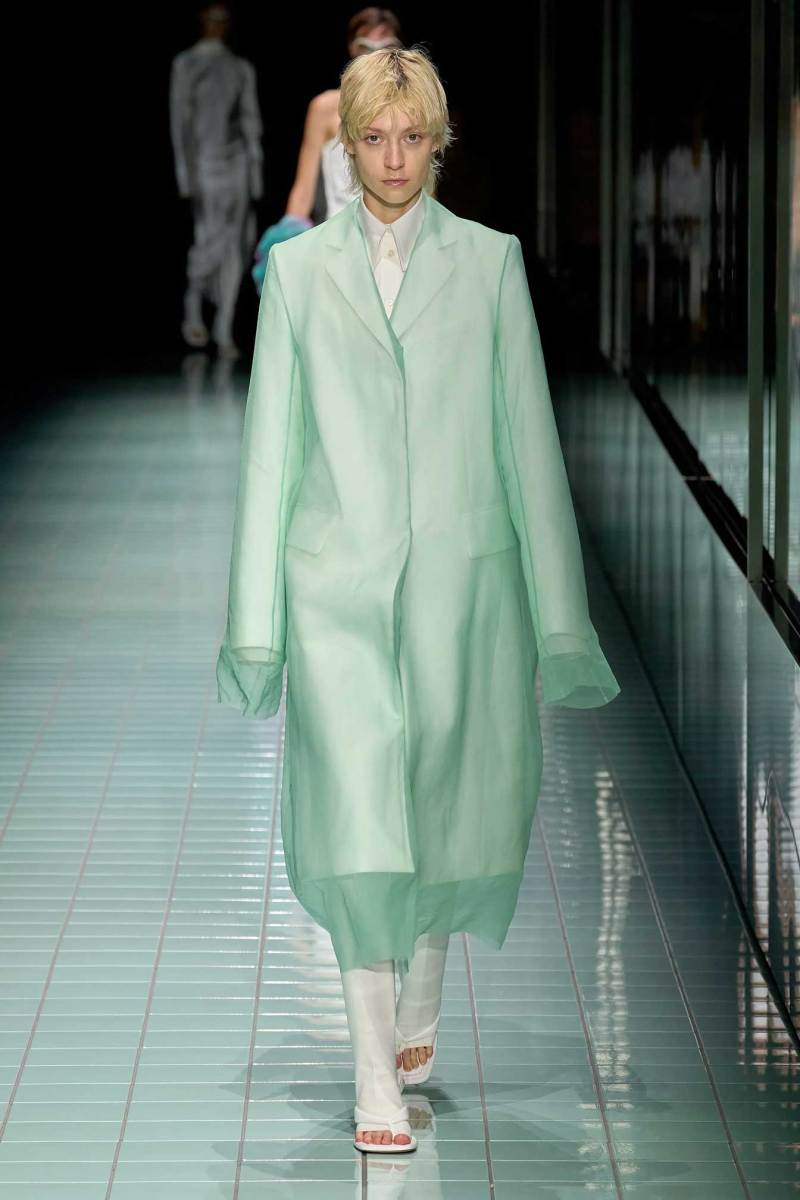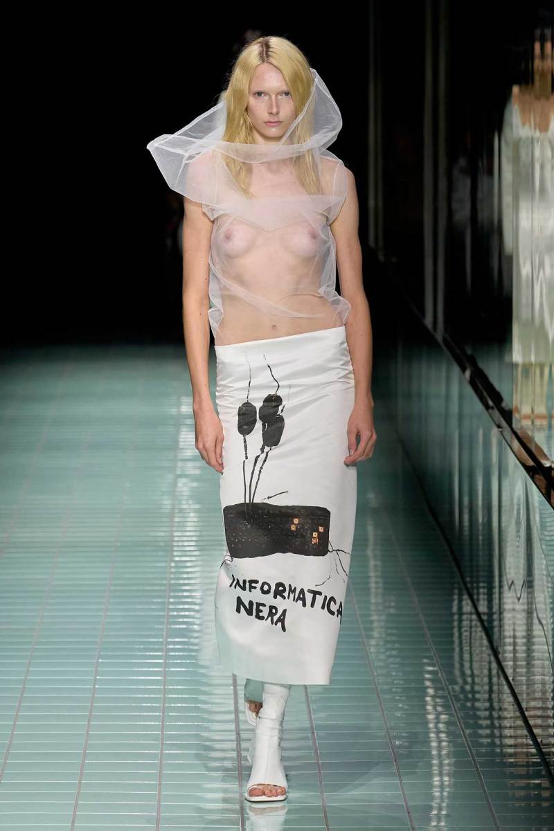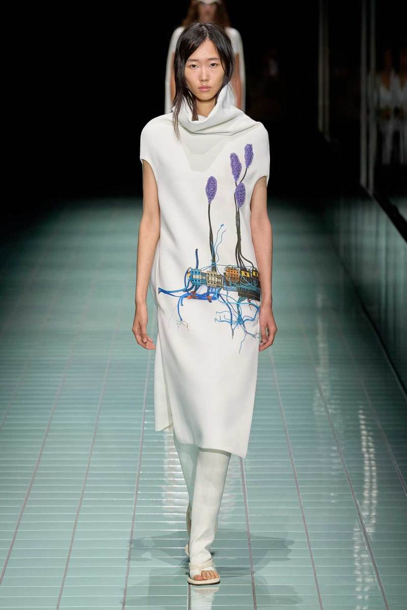 La sfilata Spring/Summer 2024 di Sportmax riflette sulla natura del cambiamento, il legame tra passato, presente e futuro, e su un futuro sospeso tra naturale e artificiale, scienza e poesia. Un mondo distopico, si può dire, dove la naturalezza diventa un po’ più artificiale.