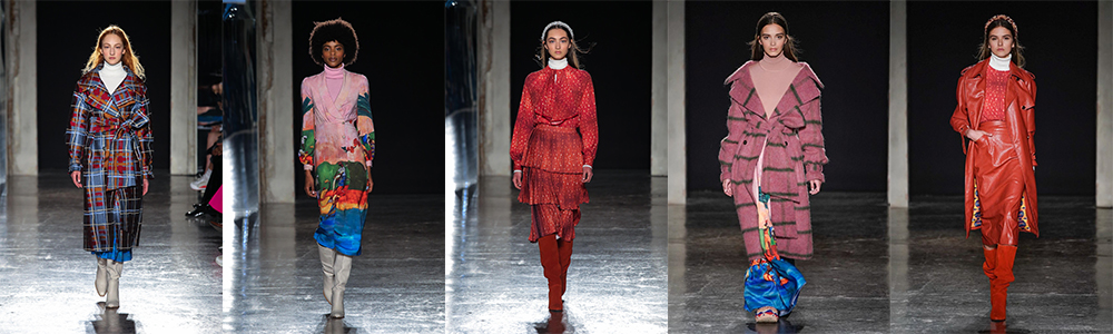 Le silhouette sono morbide, con tagli a volte maschili. Le lunghezze midi o maxi. Trench e gonne a ruota sono annodati in vita, cappotti, maglioncini a collo alto, blazer, abiti lunghi, pantaloni a zampa di elefante, abitini con volant e gonne e giacche in ecopelle si alternano in una danza di colori armonica e mai noiosa. I tessuti diventano tele su cui compaiono pennellate che seguono un’idea di tartan o vere e proprie illustrazioni che ricordano vagamente Gauguin.