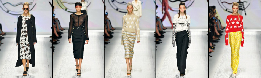 Saltano subito all’occhio il bianco ottico e il giallo intenso che ci trasportano immediatamente in un mood vacanziero ma di tendenza, le stampe a stelle e strisce rendono divertenti maglioni e gonne, le sovrapposizioni di tessuti e spessori rendono giovanili e disinvolte t-shirt e maglie, bottoni dorati danno carattere a giacche scivolate e pantaloni ampi dalla vita altissima. Parola d’ordine è spensieratezza e stile minimale.