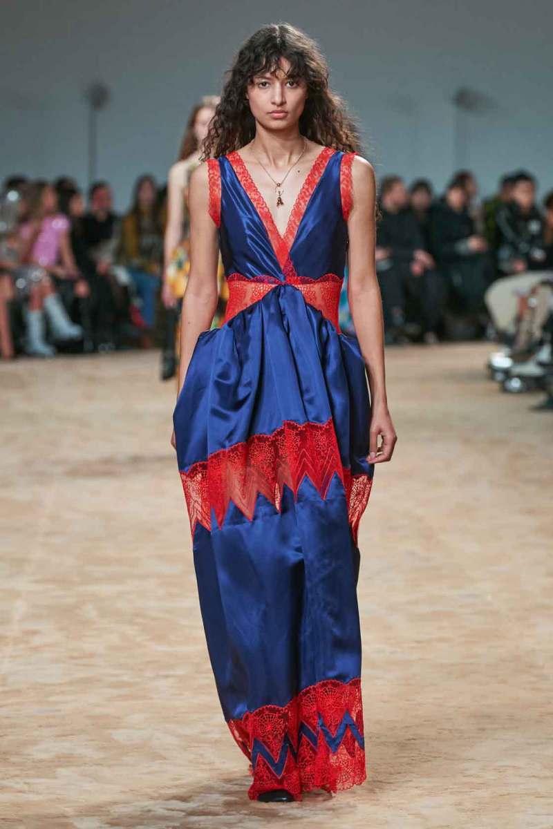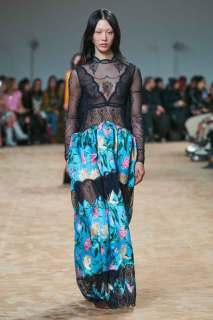 La donna che aveva previsto è certamente quella vista sulla passerella, fiera sulle sneakers dei primi undici look, compresi di pelliccia e lurex presentano un daily-wear composto da look monocromatici, morbidi e seducenti, avvolti in lunghi cappotti dai dettagli metallici. Si susseguono poi la prima serie degli abiti lunghi che compongono la collezione, fatti di stampe floreali e pizzo, che ricordano le origini basche di Francisco Rabaneda y Cuervo, nome di nascita di Paco Rabanne. I fiori lasciano spazio ai paesaggi onirici e senza orizzonte di Salvador Dalì. Su un abito celeste l’opera Sogno causato dal volo di un’ape, con le tigri protagoniste; una serie di abiti venuti fuori da una tela che ha visto i colori di Dalì e quasi anche i tagli di Lucio Fontana, che caratterizzano le diverse scollature.