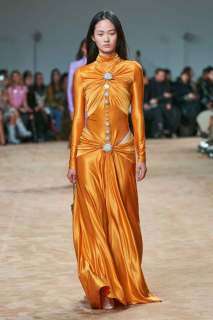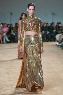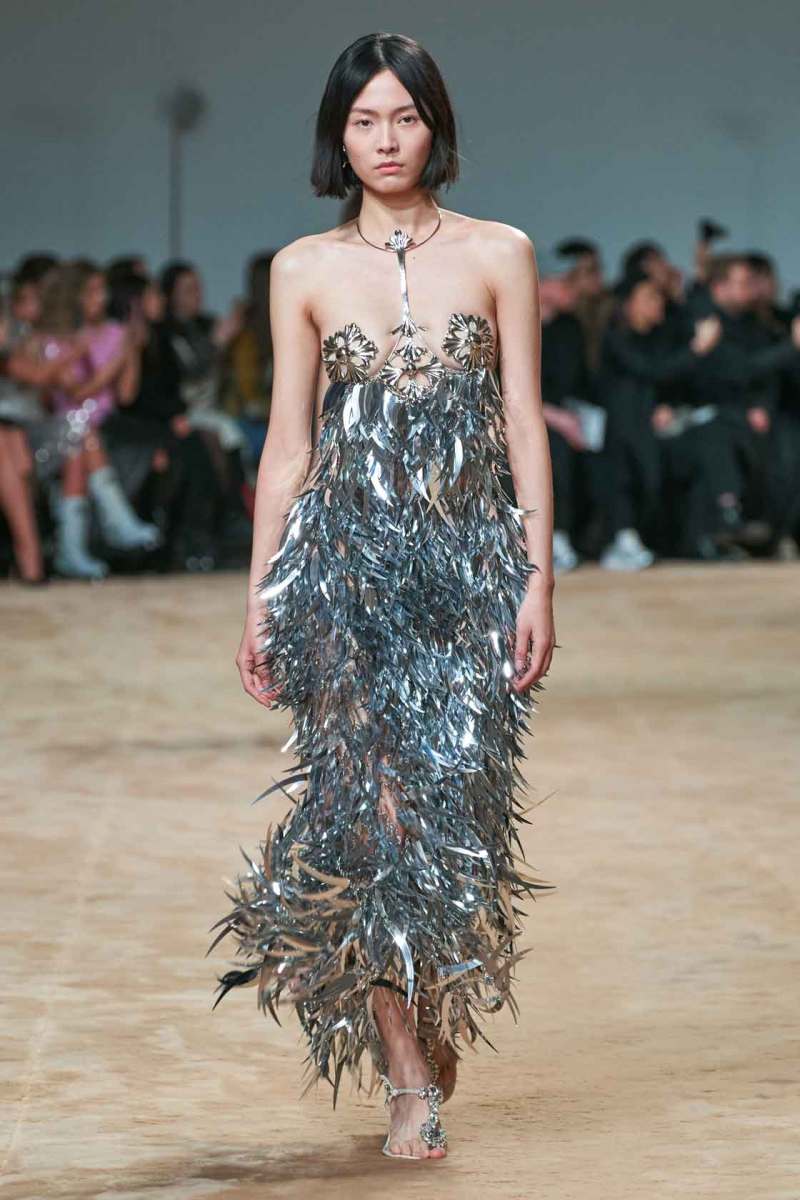 Thank you monsieur Rabanne, you were among those who changed our view of the world recitava il biglietto lasciato sulle sedute dello show, firmato dall’attuale direttore creativo della maison, Julien Dossena. Ha scavato a fondo per onorare la memoria del fondatore della casa di moda, scoprendo la sua amicizia con lo stilista Salvador Dalì, al quale si devono gli abiti stampati della collezione che anticipano il tripudio di oro e argento. La donna del futuro sarà potente, estremamente seduttiva e senza dubbio superiore all’uomo. È per questa donna che immagino le mie creazioni, affermava alla fine degli anni Sessanta Paco Rabanne.