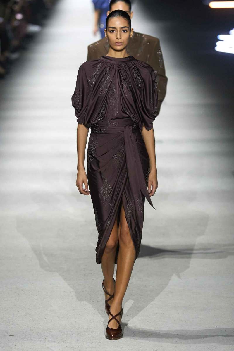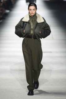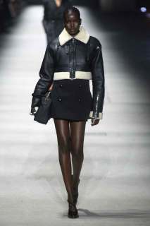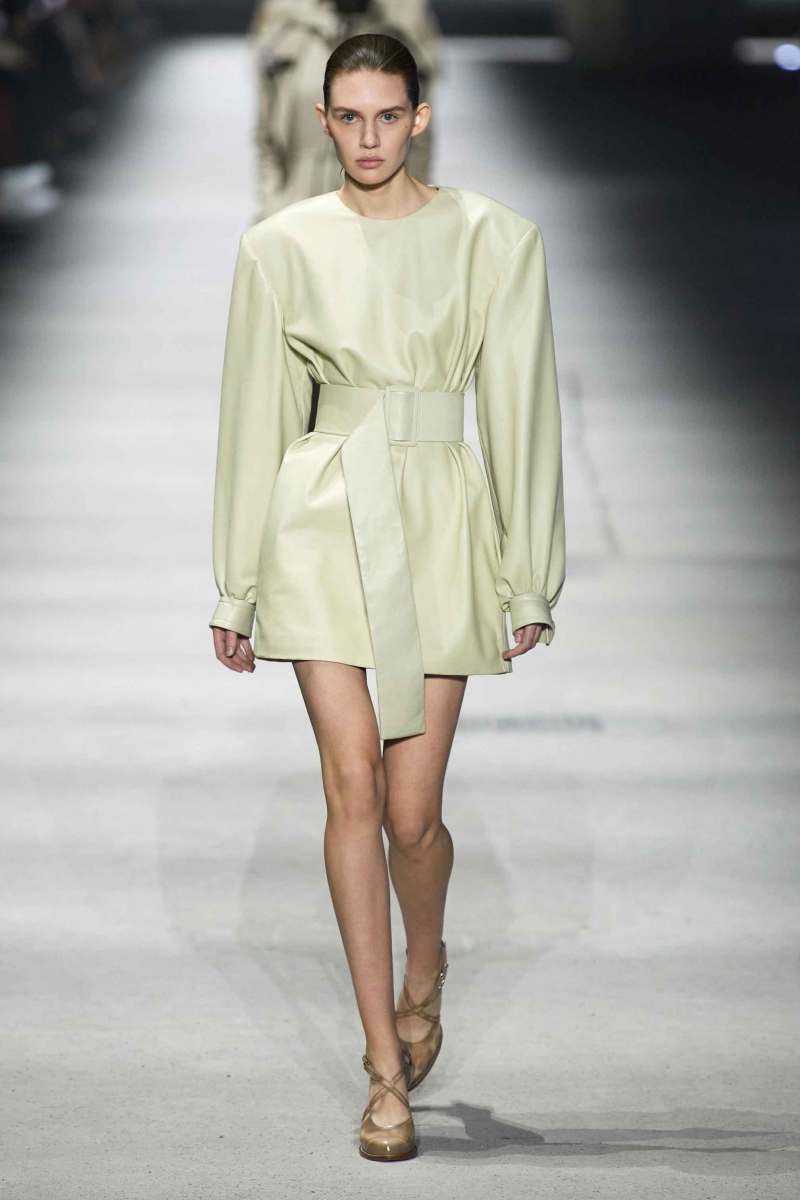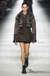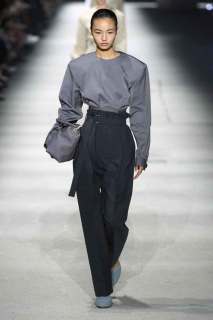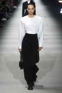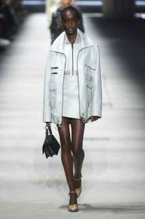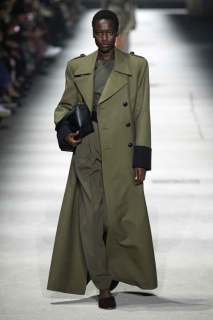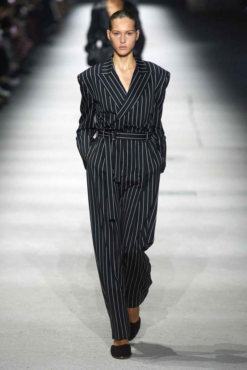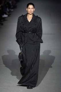 A chiudere lo show Laetitia Casta, ex top model francese, che a un accenno di trucco effetto no-make-up ha abbinato un trench dress gessato oversize ripreso in vita da una cintura. Finale perfetto per uno show netto e centrato.