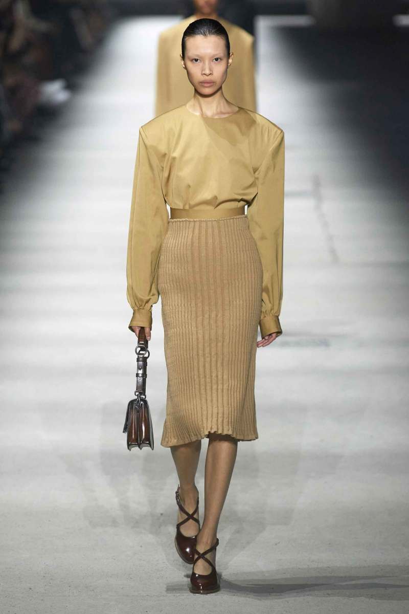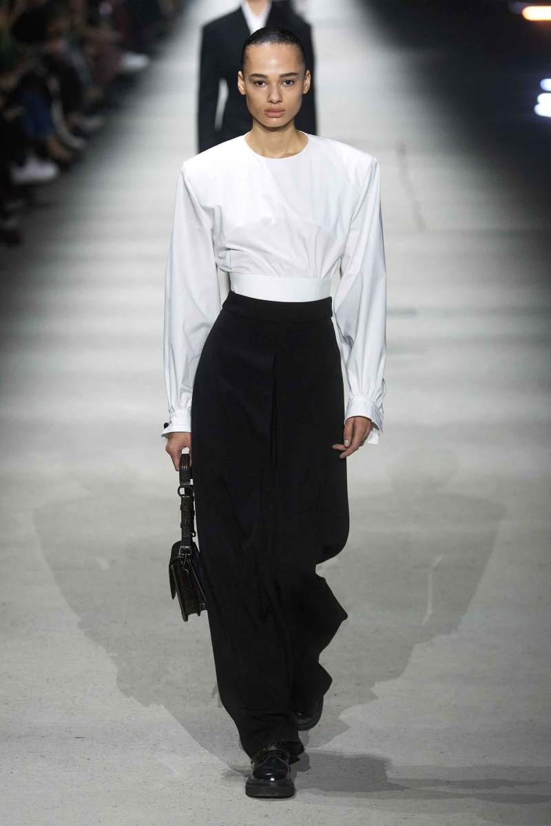 Tod’s riserva particolari attenzioni alle spalle e ai volumi over, che non sono mai troppo eccessivi, ma che devono essere definiti per valorizzare e riempire abiti che pretendono di essere indossati. L’identità della Maison si ritrova nei dettagli di items severe, che raccontano una quotidianità professionale e con cui è difficile stare al passo.
