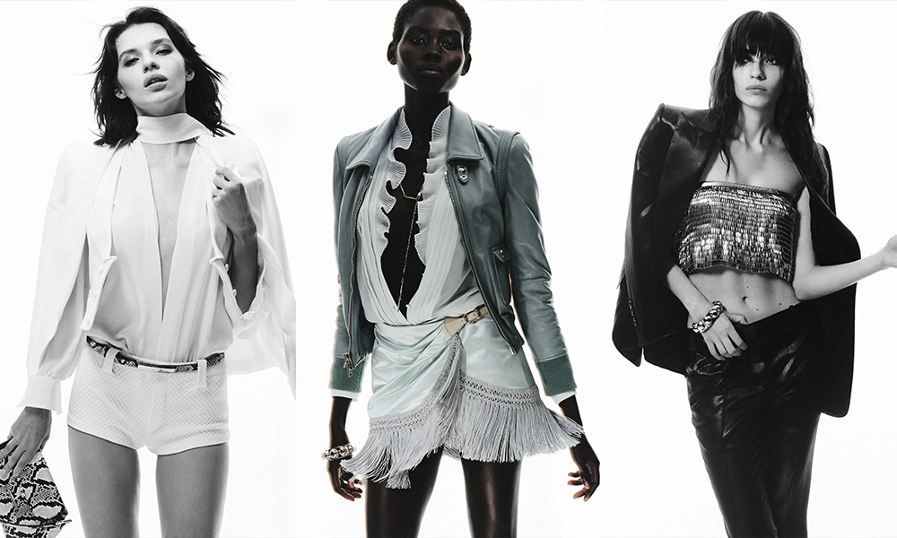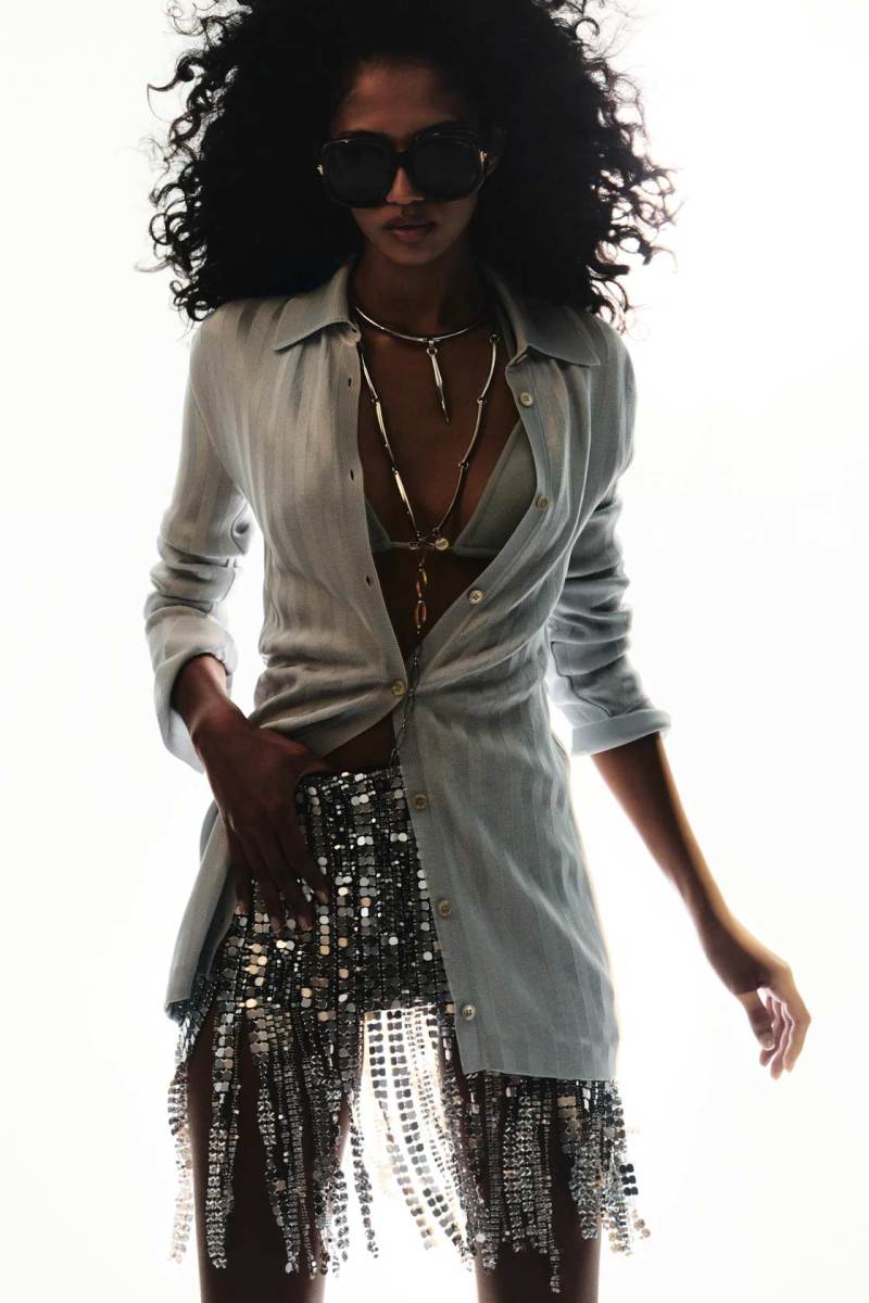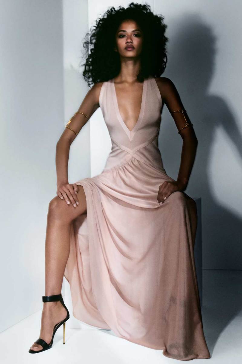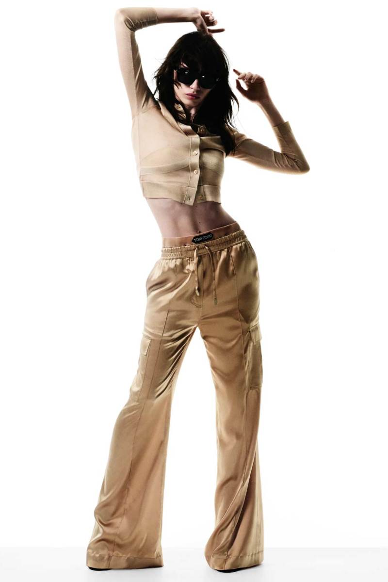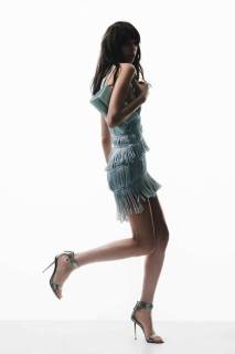 Gli abiti che più ci saltano agli occhi sono gli abiti corti con le paillettes e i mini shorts sotto giacche slim. Frequente body jewelry molto evocativa di un immaginario anni ’70 con annessi pantaloni lunghi con coulisse e un tocco metallico dei materiali. I tacchi sono vertiginosi e spesso pitonati, li vediamo abbinati a evanescenti camicie aperte di raso e abiti morbidi che abbracciano quasi aggressivamente le forme delle donne che li indossano. Più Tom Ford di così non si può.