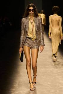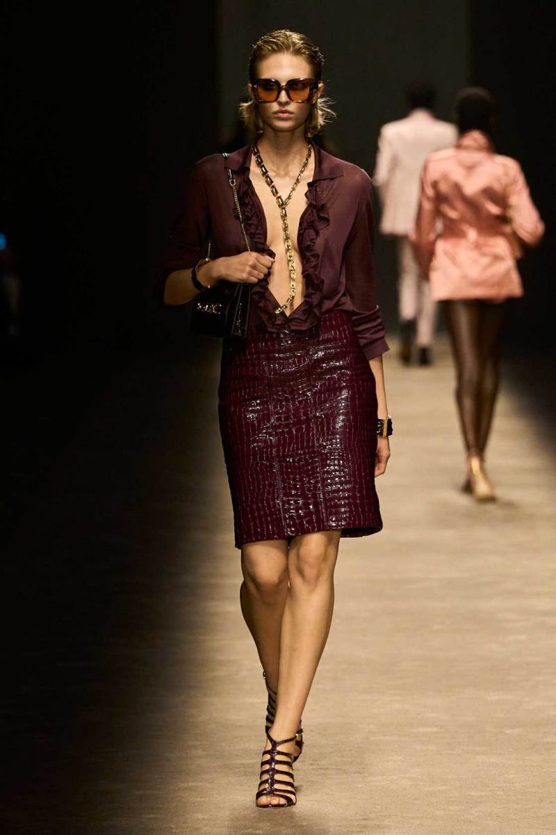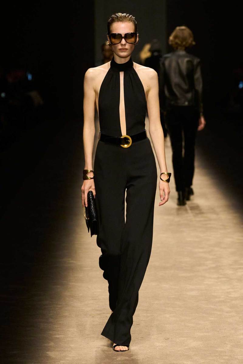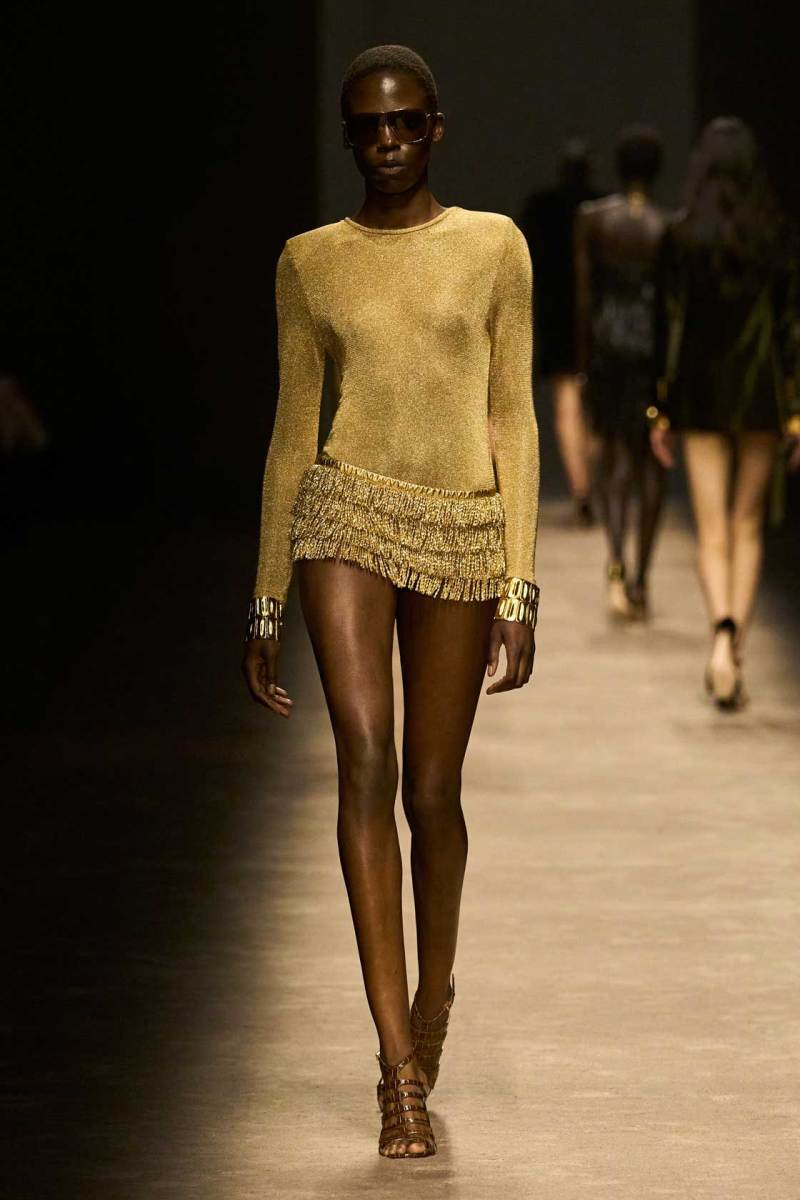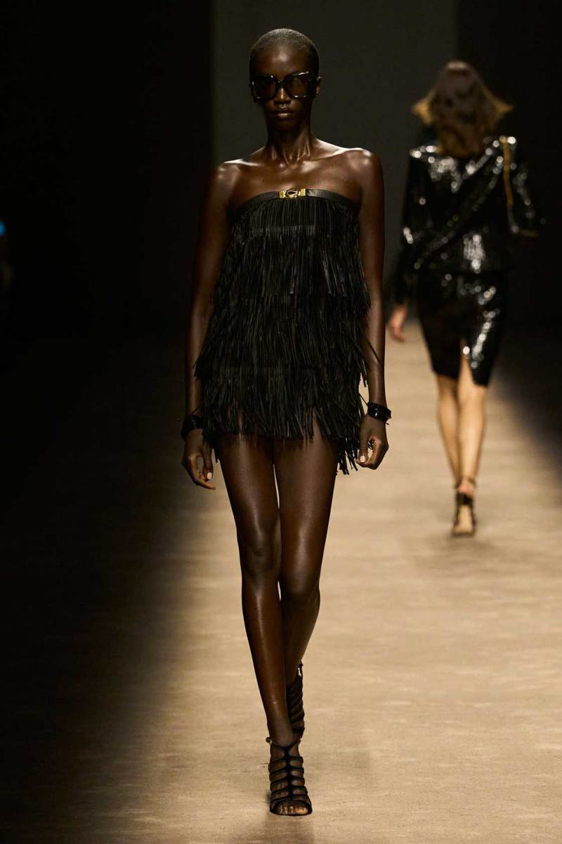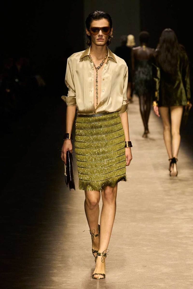 I modelli e le modelle sfilano disinvolti sulla passerella indossando pantaloni lunghi, micro shorts, mini abiti in pelle e altri lunghi e scivolosi. La contaminazione degli anni ’70 è evidente e dona alla passerella quello stile un po’ retrò che riesce però a stare al passo coi tempi moderni.