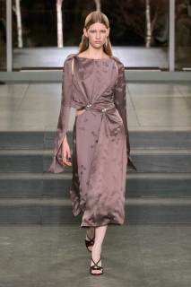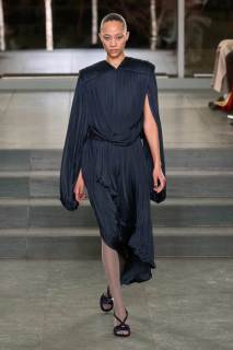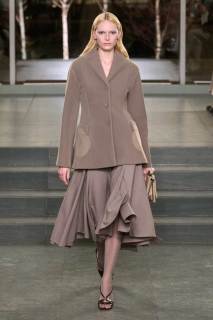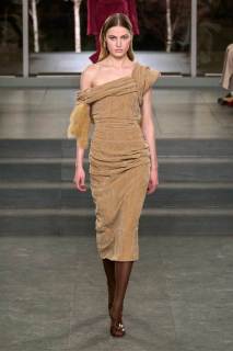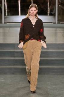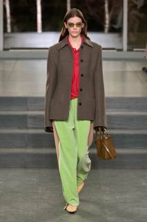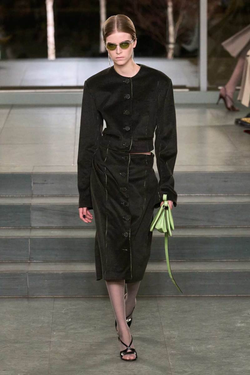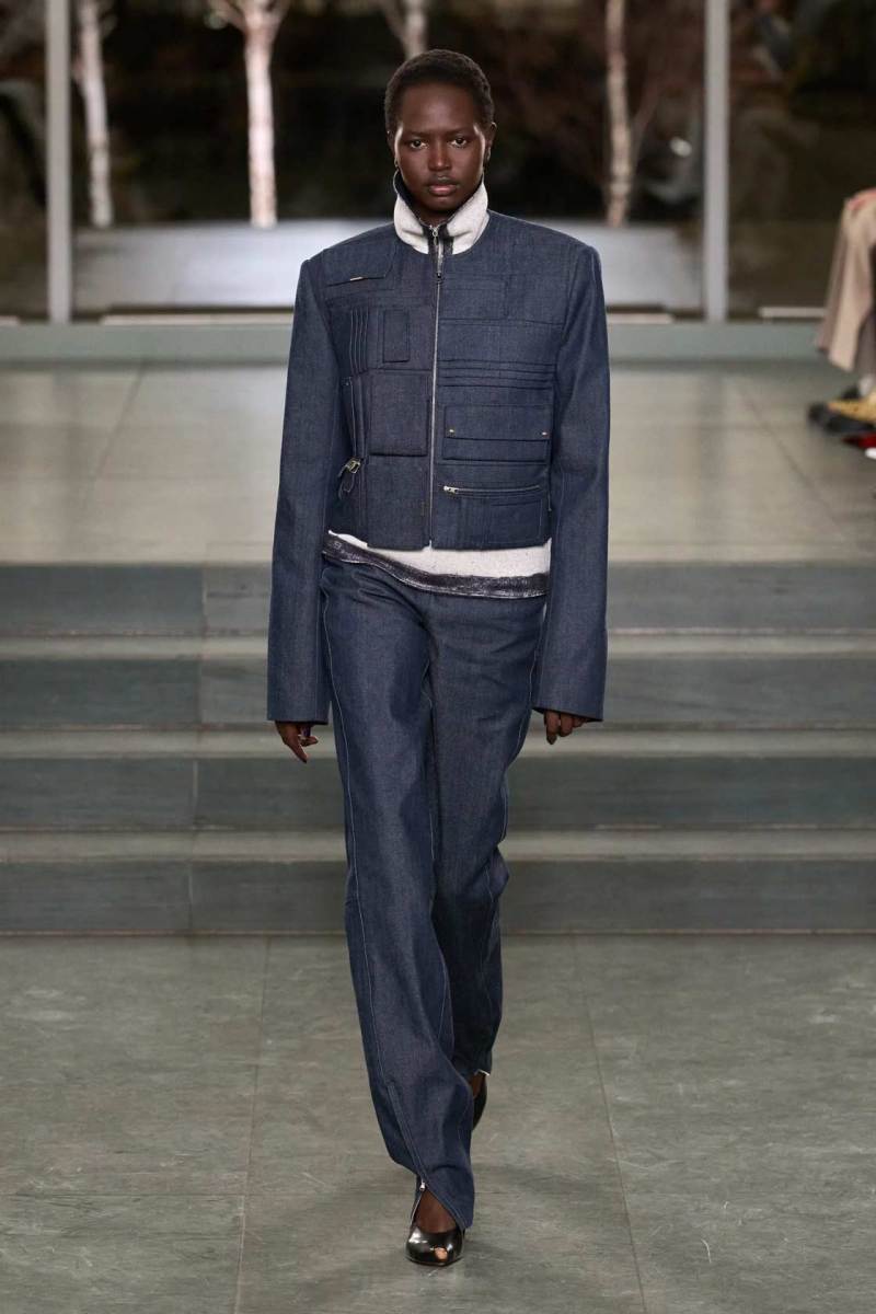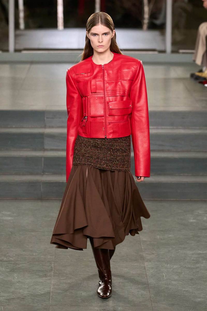 Uno dei pezzi chiave è la “handbag jacket”, una giacca funzionale con molteplici tasche, proposta in pelle nera, denim e in un audace rosso fuoco, abbinata a gonne midi dalle linee pulite. Le camicie e le giacche presentano maniche e polsini oversize, un richiamo all’estetica maschile reinterpretata in chiave femminile. Immancabili gli abiti in velluto e jersey dalle texture avvolgenti, perfetti per passare con disinvoltura dal giorno alla sera.
