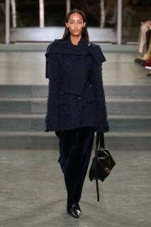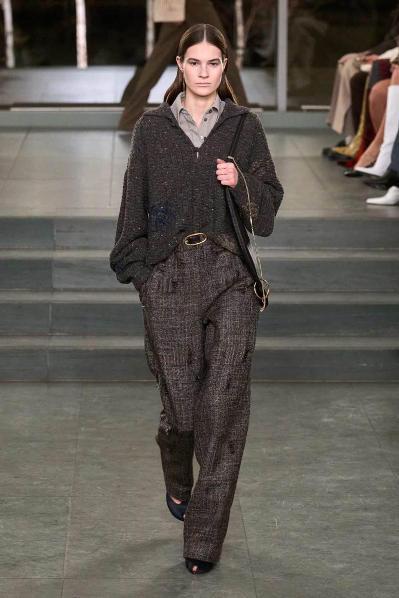 La collezione si distingue per l’uso sapiente degli strati: maglioni drappeggiati su cappotti, camicie che emergono da sotto pullover e blazer oversize che avvolgono la silhouette in un abbraccio strutturato. I pantaloni sportivi vengono reinterpretati in lana spazzolata e cotone, accostati con eleganza a giacche sartoriali e maglie avvolgenti.