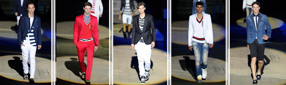 A poco a poco i modelli iniziano a sfilare sulla passerella a bordo piscina indossando la collezione ispirata al “Water World” pensata dallo stilista per un uomo sicuro di sé, avventuroso e ironico, un capitano moderno alla conquista del mondo.