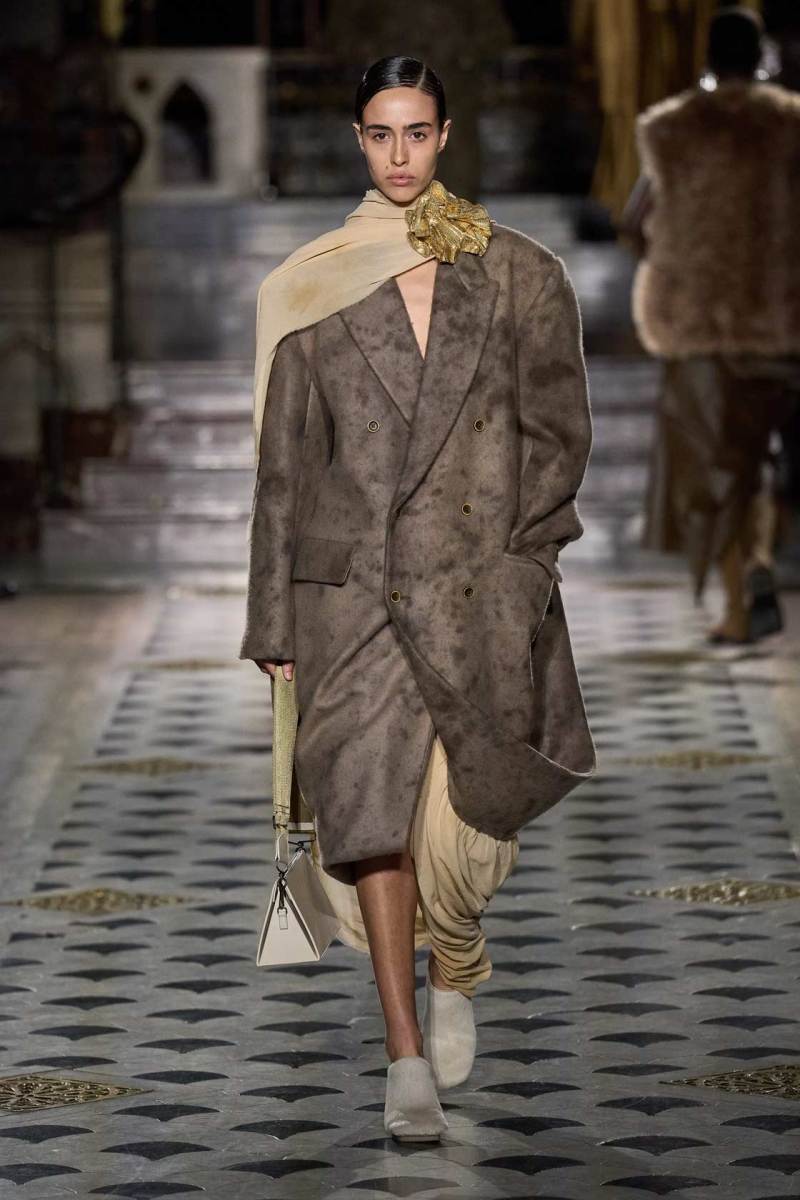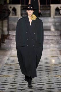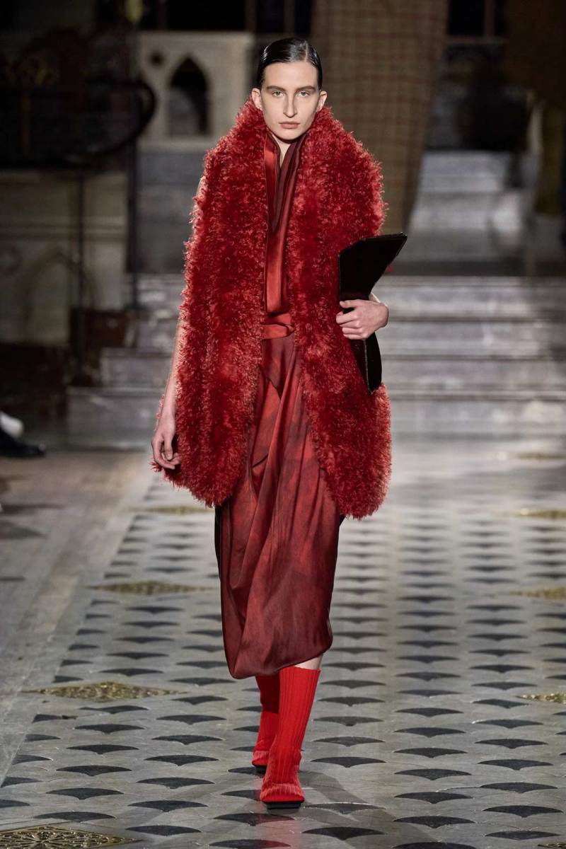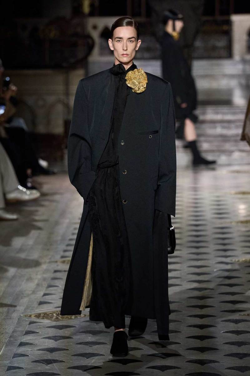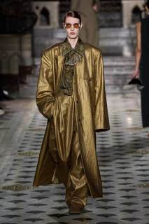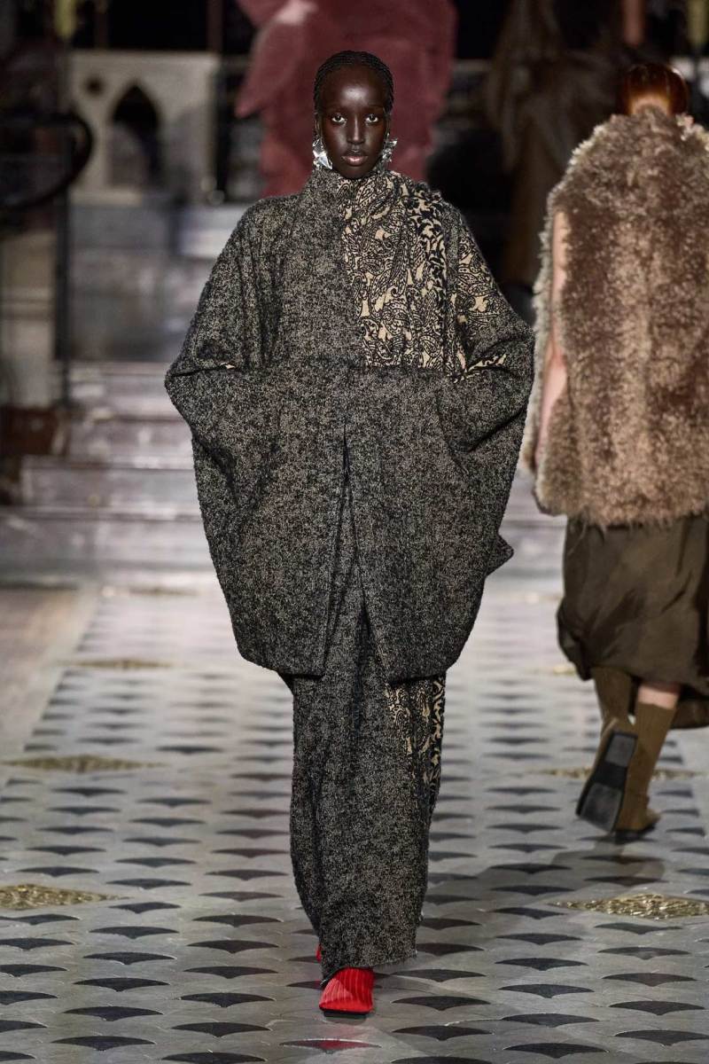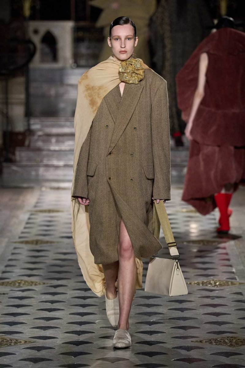 Anche le strutture, le silhouettes e gli stessi capi vengono ribaltati, sovrapposti e ricreati: giacche che diventano top, abiti che si trasformano in cappotti. Il tocco un po’ vintage della collezione è dato dal jacquard sbiadito, dal tweed e dalle dorature antiche degli abiti oversize. Un guardaroba a tratti impegnativo, particolare, a tratti più accessibile e versatile grazie ai capi easy chic come i lunghi abiti chemisier in seta ornati da bottoni.