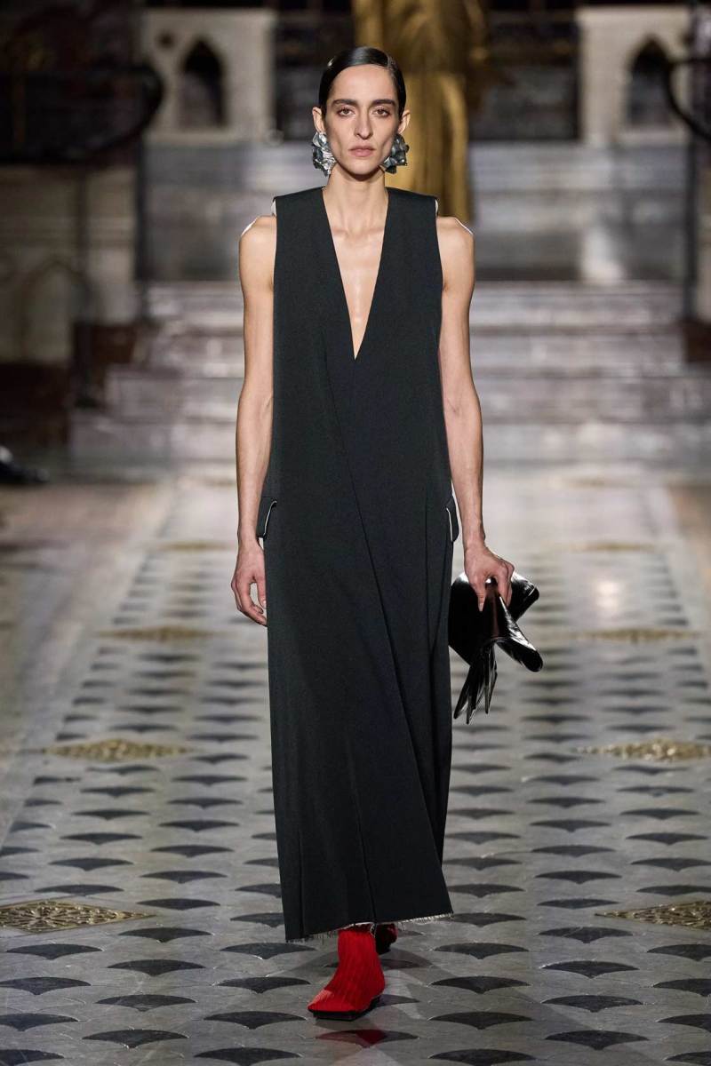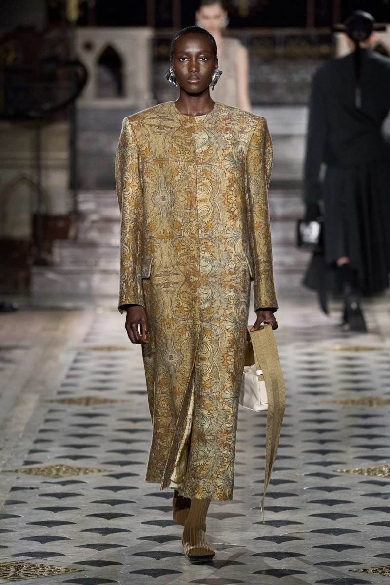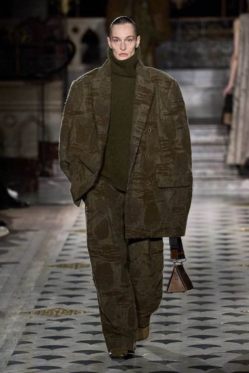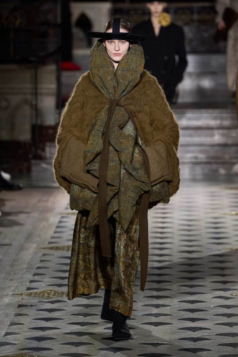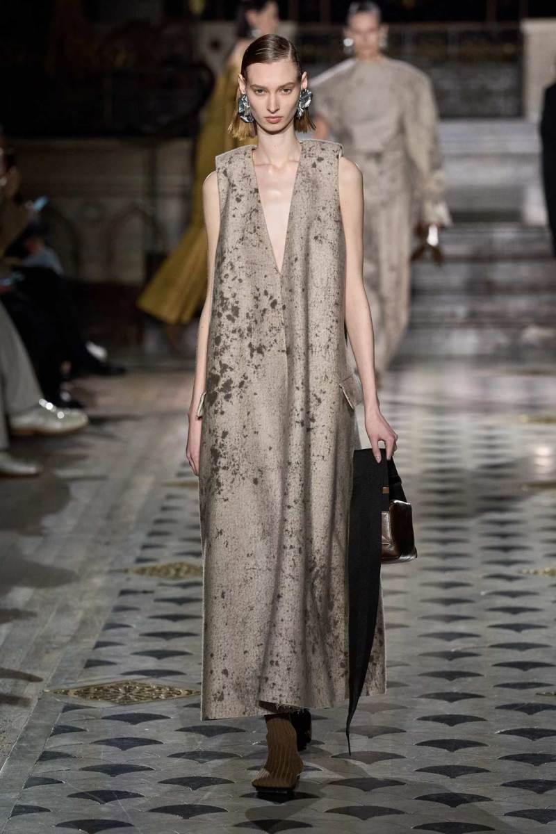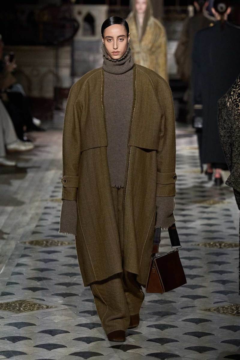 Anche le strutture, le silhouettes e gli stessi capi vengono ribaltati, sovrapposti e ricreati: giacche che diventano top, abiti che si trasformano in cappotti. Il tocco un po’ vintage della collezione è dato dal jacquard sbiadito, dal tweed e dalle dorature antiche degli abiti oversize. Un guardaroba a tratti impegnativo, particolare, a tratti più accessibile e versatile grazie ai capi easy chic come i lunghi abiti chemisier in seta ornati da bottoni.