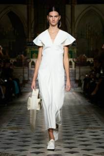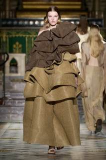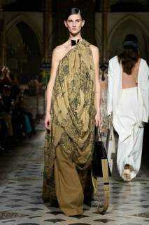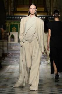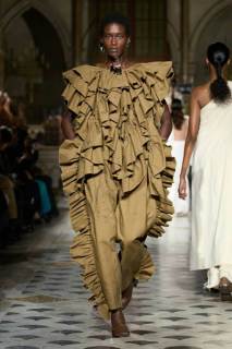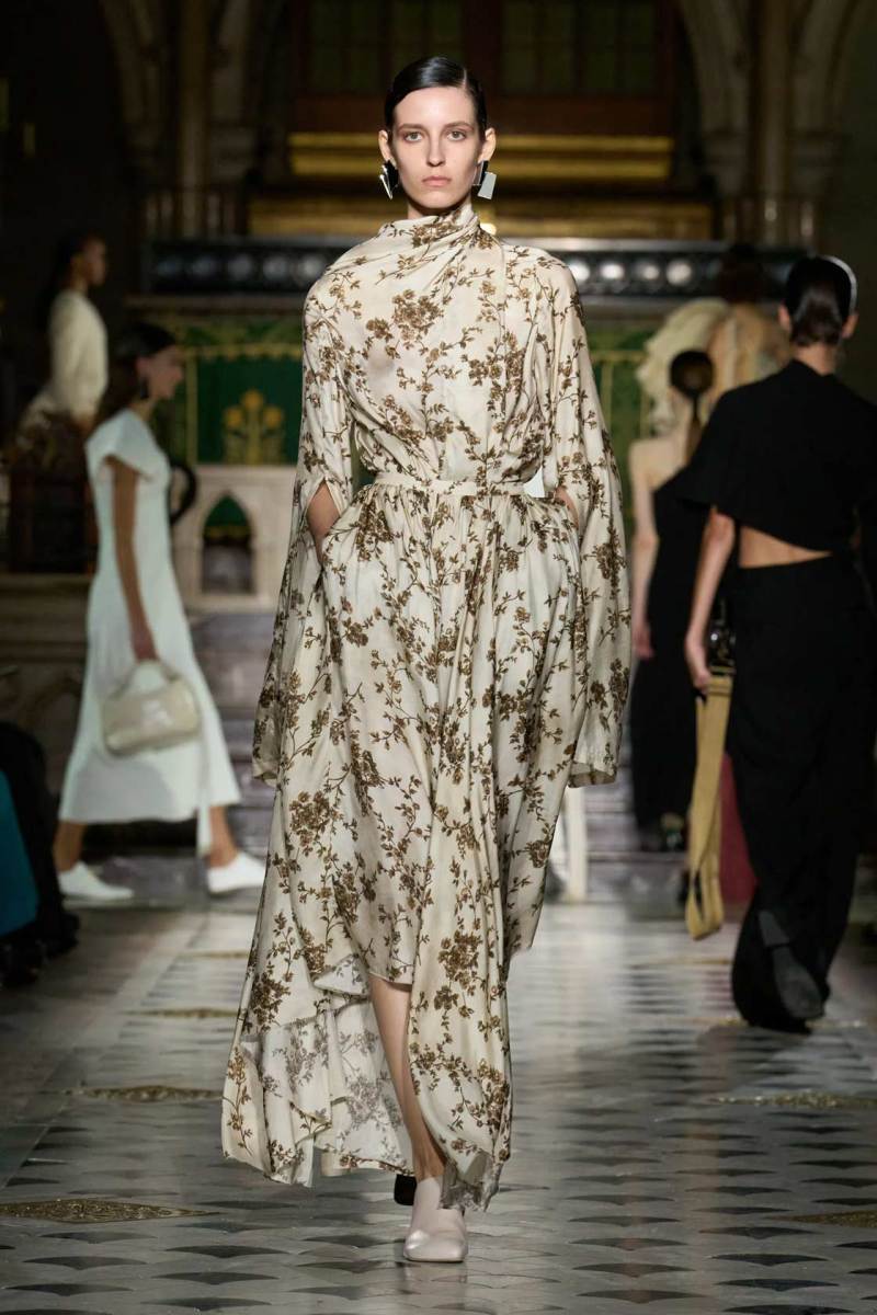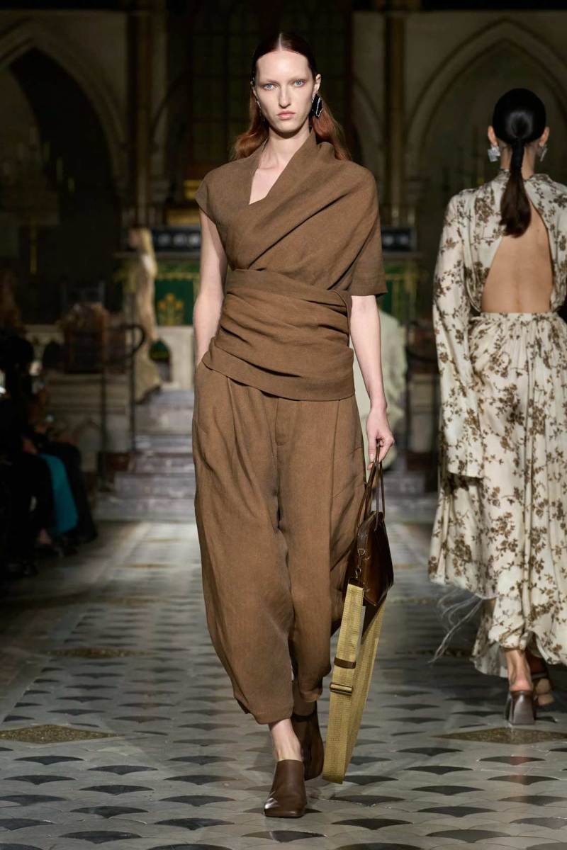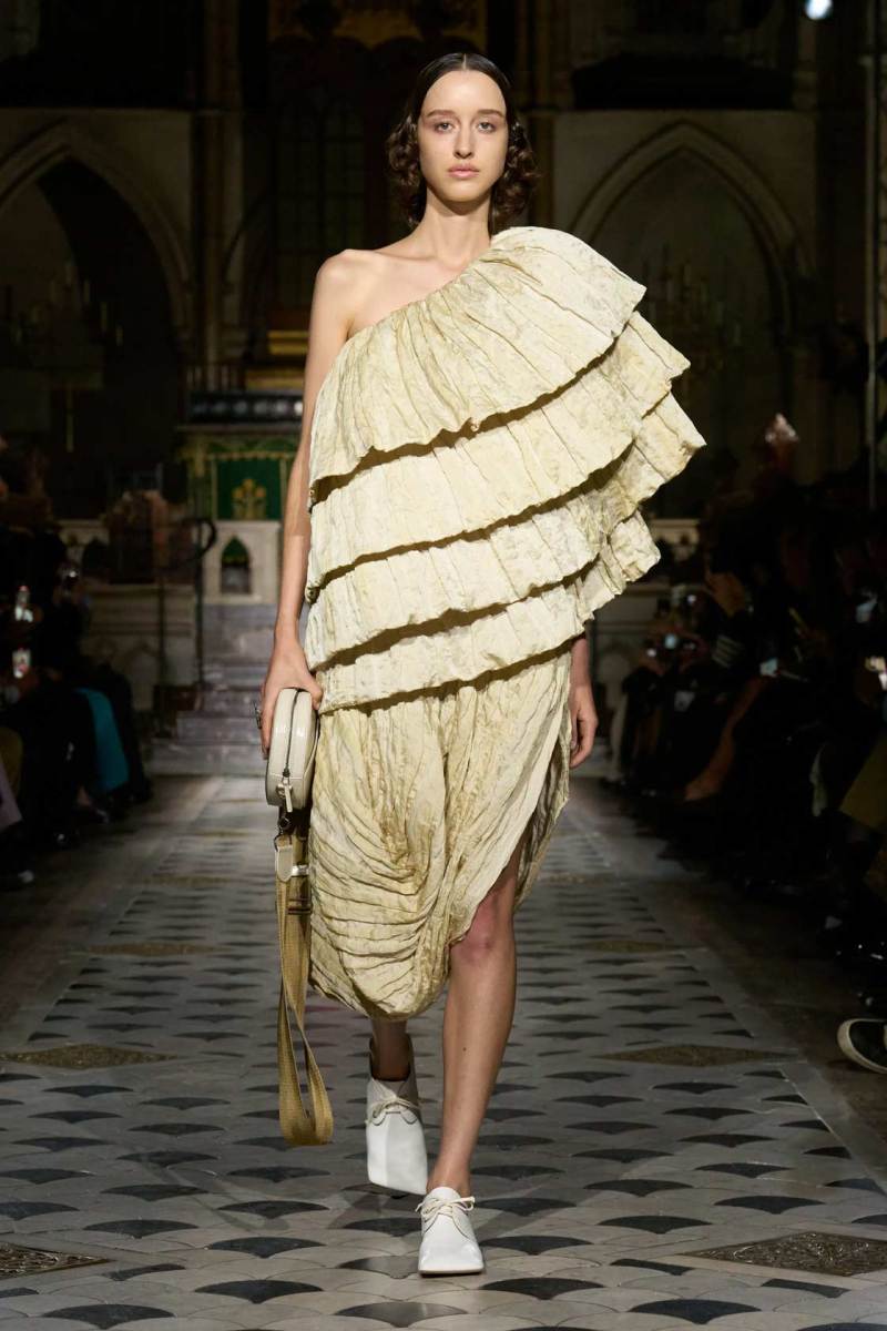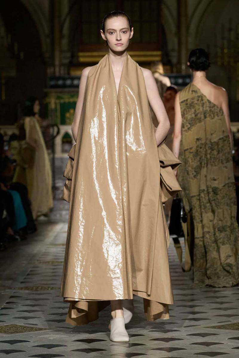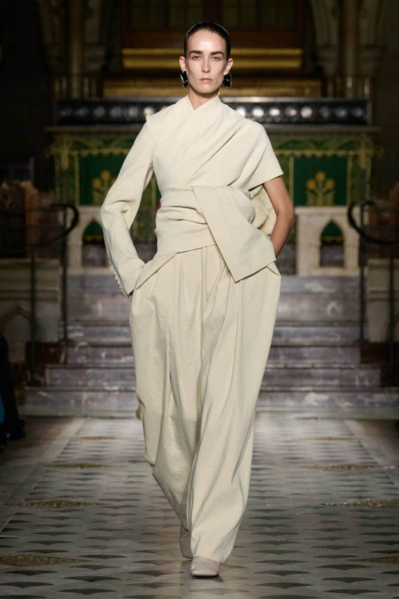 Al centro della scena, le tonalità neutre e terrose hanno dominato la palette, con qualche tocco di nero. Tuttavia, non sono stati i colori a catturare maggiormente l’attenzione, ma le silhouette. Tessuti come cotone, seta e lino si sono trasformati in drappeggi e sovrapposizioni fluide, che scivolavano leggeri sulle modelle, creando un equilibrio tra volumi oversize e dettagli più strutturati. Intricati intrecci e rouche sottili hanno contribuito a una visione di calma e sobria eleganza, riflettendo una bellezza minimalista e misurata.