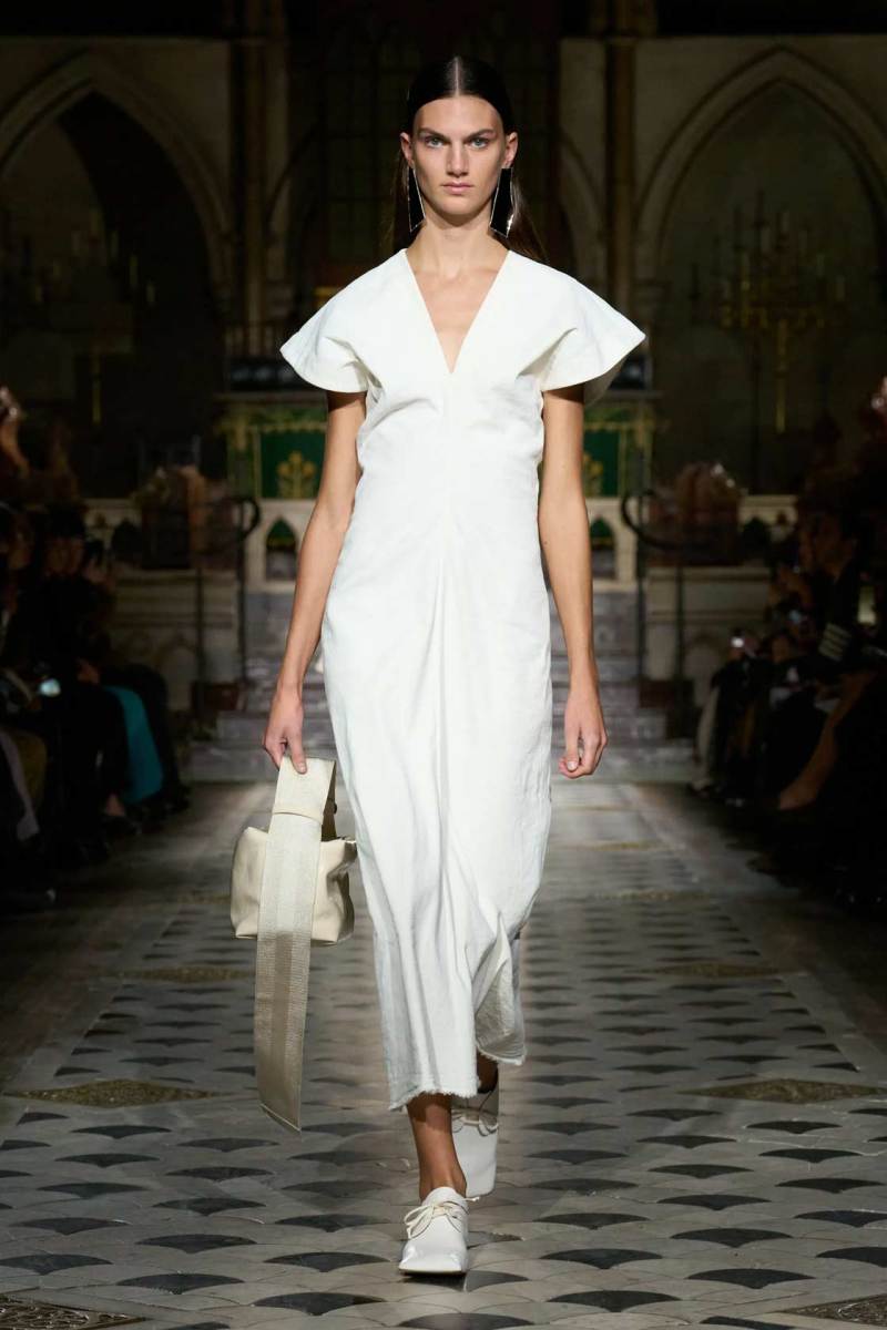 Le sfilate di moda sono spesso ospitate in luoghi iconici, capaci di amplificare il messaggio artistico del designer. Per la collezione di Uma Wang SS25, l’ambientazione ha raggiunto un nuovo livello di suggestione: una chiesa sconsacrata, dove le modelle hanno calcato la navata centrale come fosse una passerella. Il contrasto tra la sacralità del luogo e l’austerità raffinata della collezione ha creato un’atmosfera unica e quasi mistica.