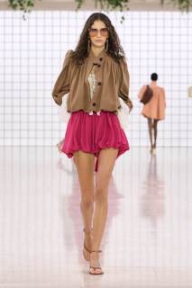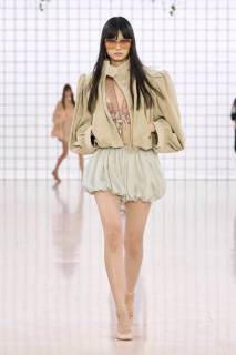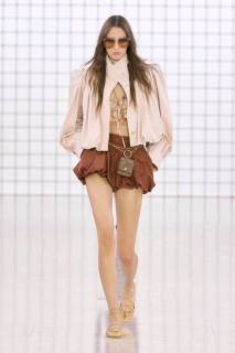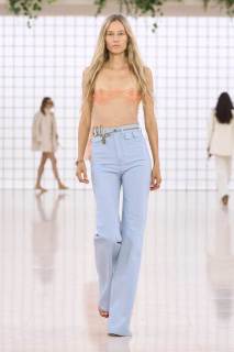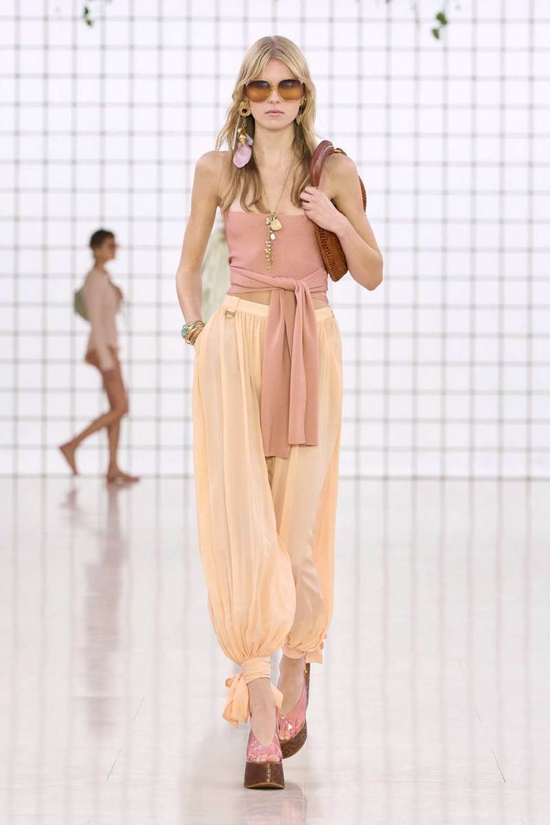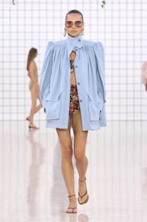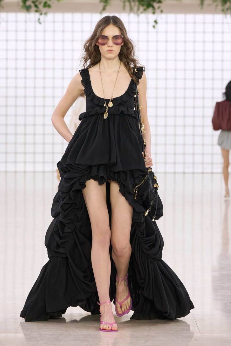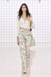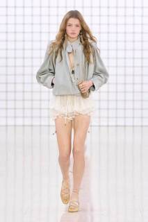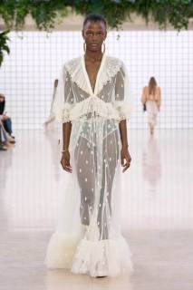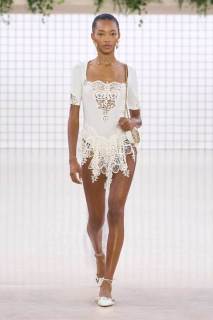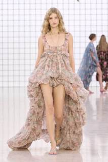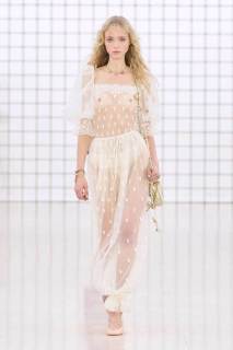 La Maison francese ha rielaborato il concetto di primavera/estate avvalendosi di look eterei e fiabeschi. Quasi come se si trattasse di un ritorno nel lontano Ottocento, vengono riproposti outfit leggiadri e svolazzanti che risultano perfetti per chi ama la moda cottagecore. Il primo abito che sfila si compone di una serie di trasparenze vedo non vedo poi unite a maniche a sbuffo, il tutto completato da un corpetto e da un pantalone a fantasia ton sur ton: la modella sembra essere appena uscita da un quadro di Michelangelo grazie ai suoi tratti angelici e alla sua pelle diafana.