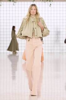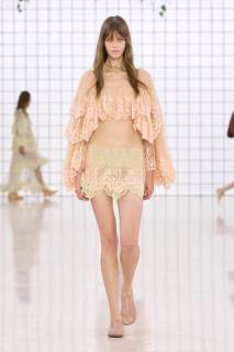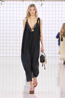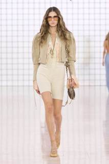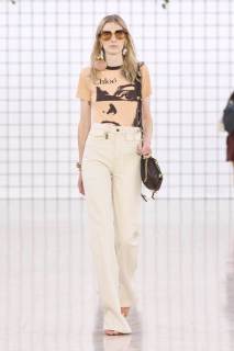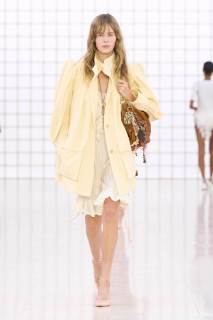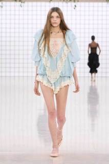 A partire dal secondo look, un body bianco con inserti di pizzo e, ancora una volta, manica a palloncino, si intuisce come il bianco sia il colore centrale della nuova stagione di Chloé. Il bianco, un colore non-colore che affascina da sempre il genere umano e che è simbolo di candore, di purezza e di integrità morale. Le figure femminili vengono, così, rappresentate come se fossero delle donne angelo (tanto per citare Dante), ovvero le uniche capaci di salvare l’animo maschile dai suoi peccati terreni e di condurlo alla vita eterna.