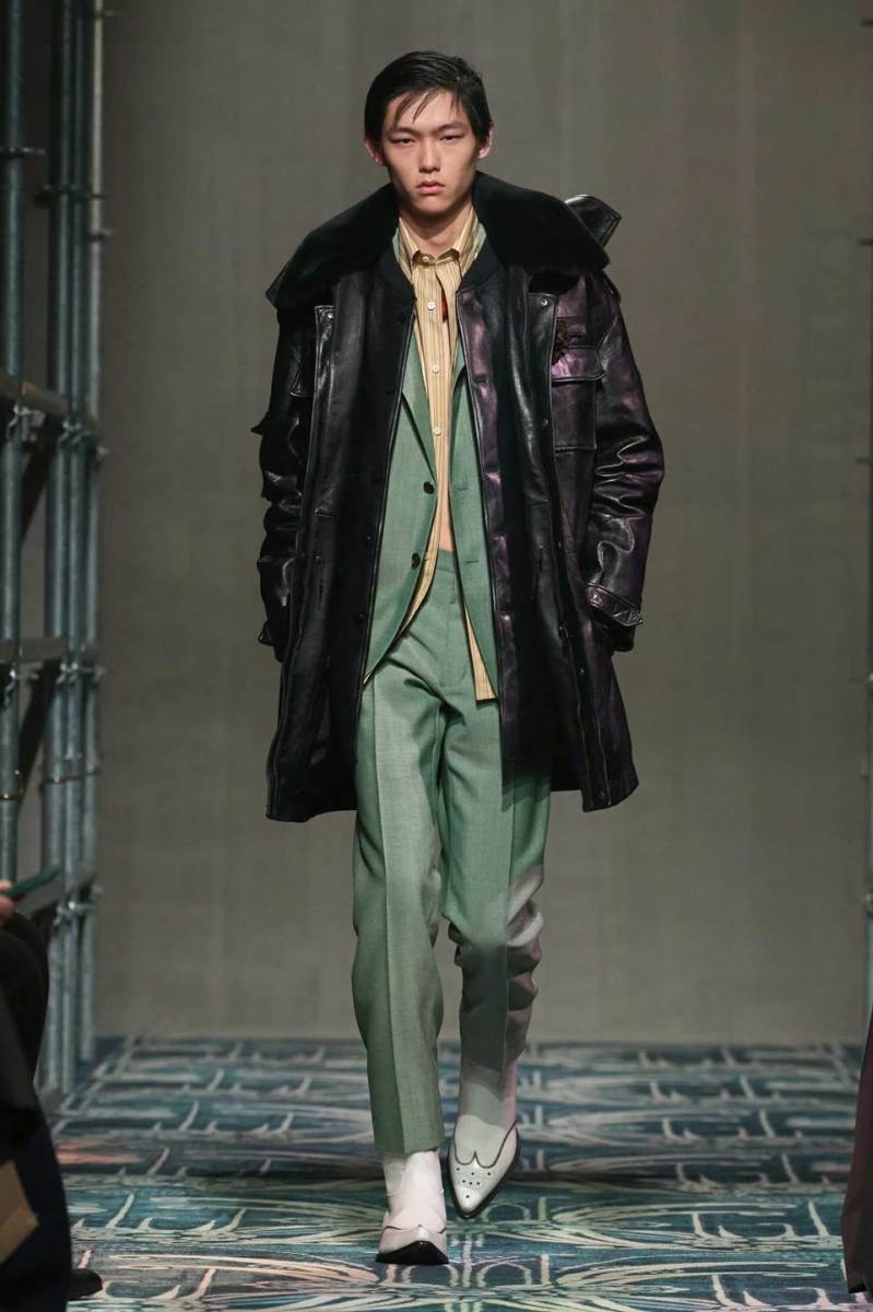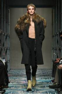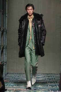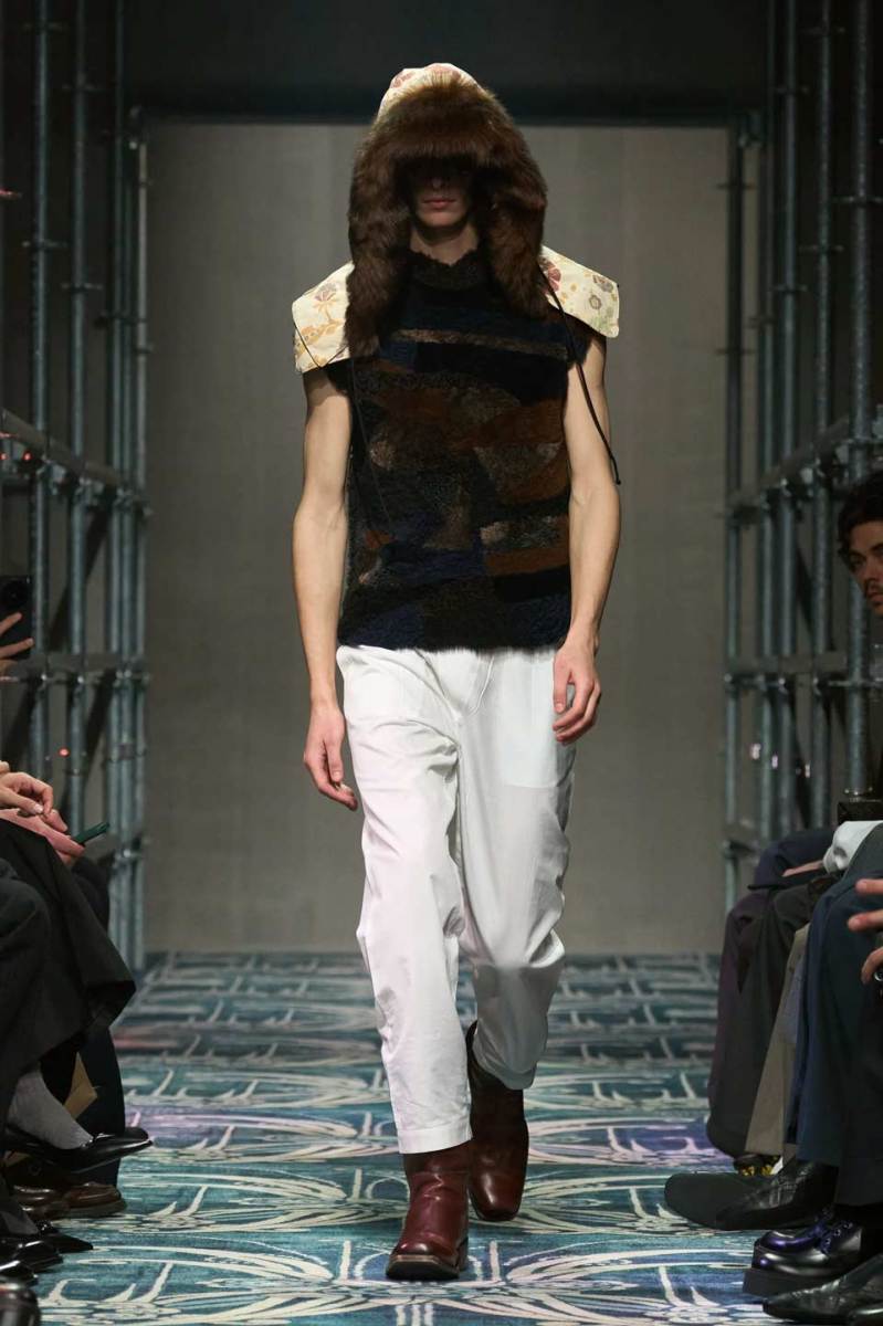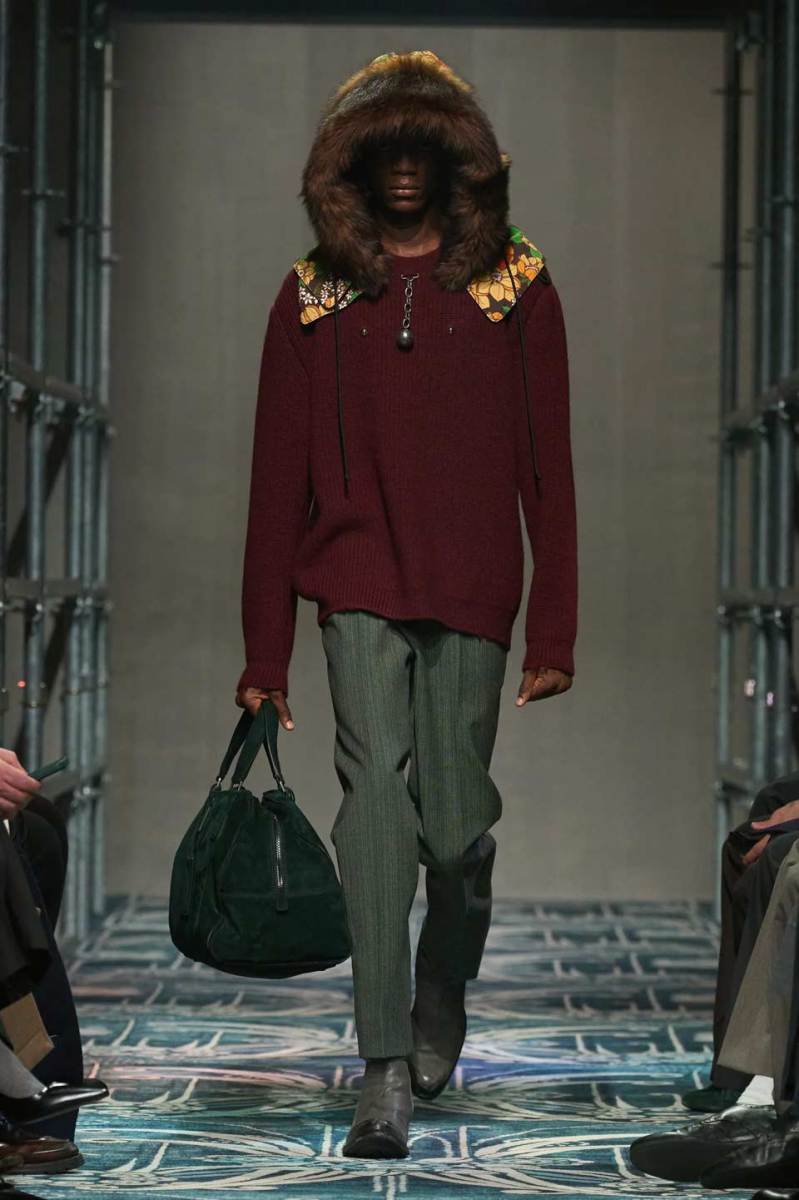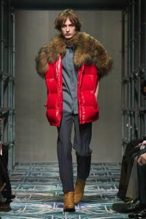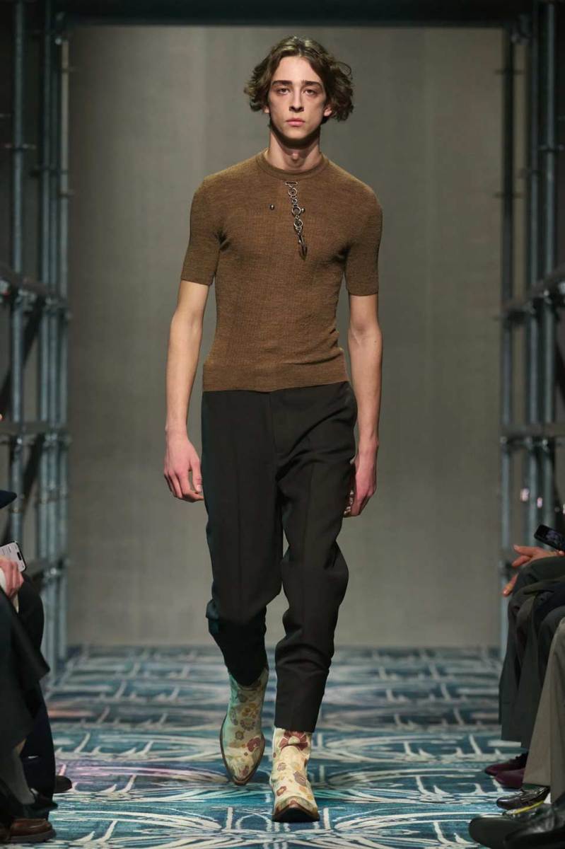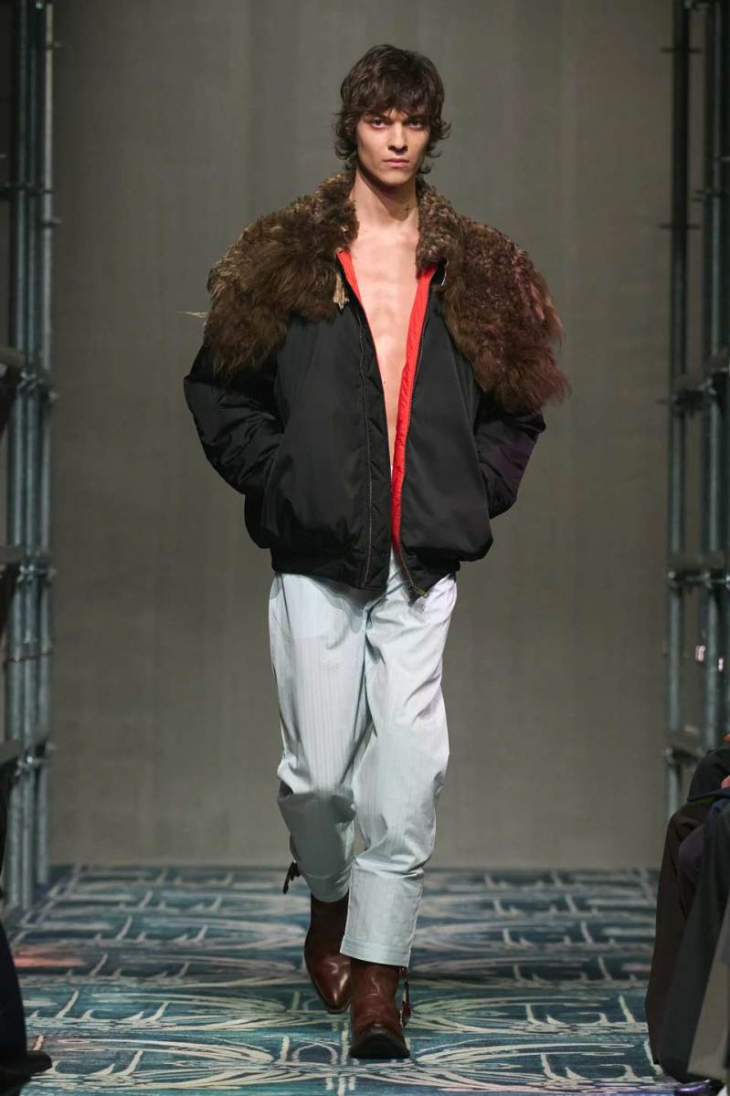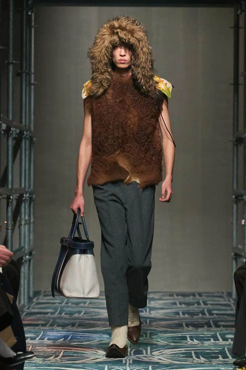 La collezione si configura come un’indagine sulla natura umana, un viaggio attraverso quegli impulsi primordiali che alimentano la creatività. Tra le impalcature dello scenario si declina una passerella cruda, fatta da capi con pelli conciate in modo selvaggio, stivali sotto pantaloni quasi forzati e accessori maxi. Per Prada e Simons, la moda non è solo estetica, ma un mezzo per ricercare sicurezza, espressione e identità. I due co-direttori creativi definiscono queste pulsioni primitive come la chiave per elevare la passione al di sopra della ragione. Come sottolineano: «Nell’istintivo possono rivelarsi una nuova raffinatezza e un’eleganza intima, selvaggia. I contrasti involontari danno vita a combinazioni inaspettate e seducenti».