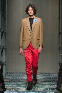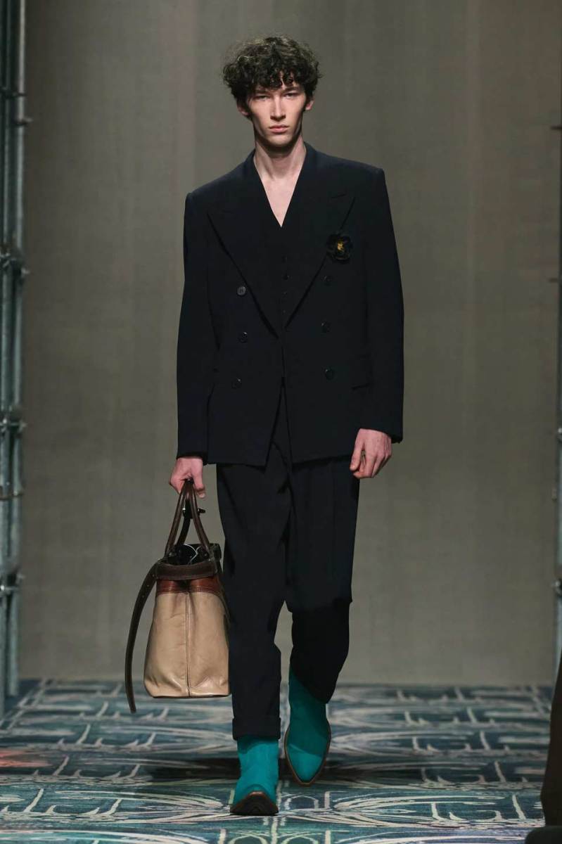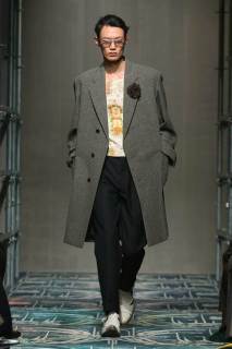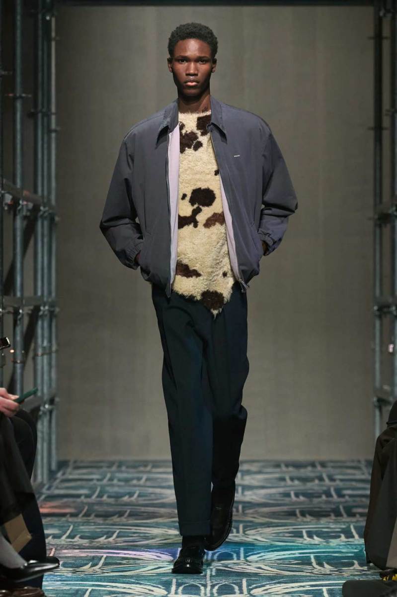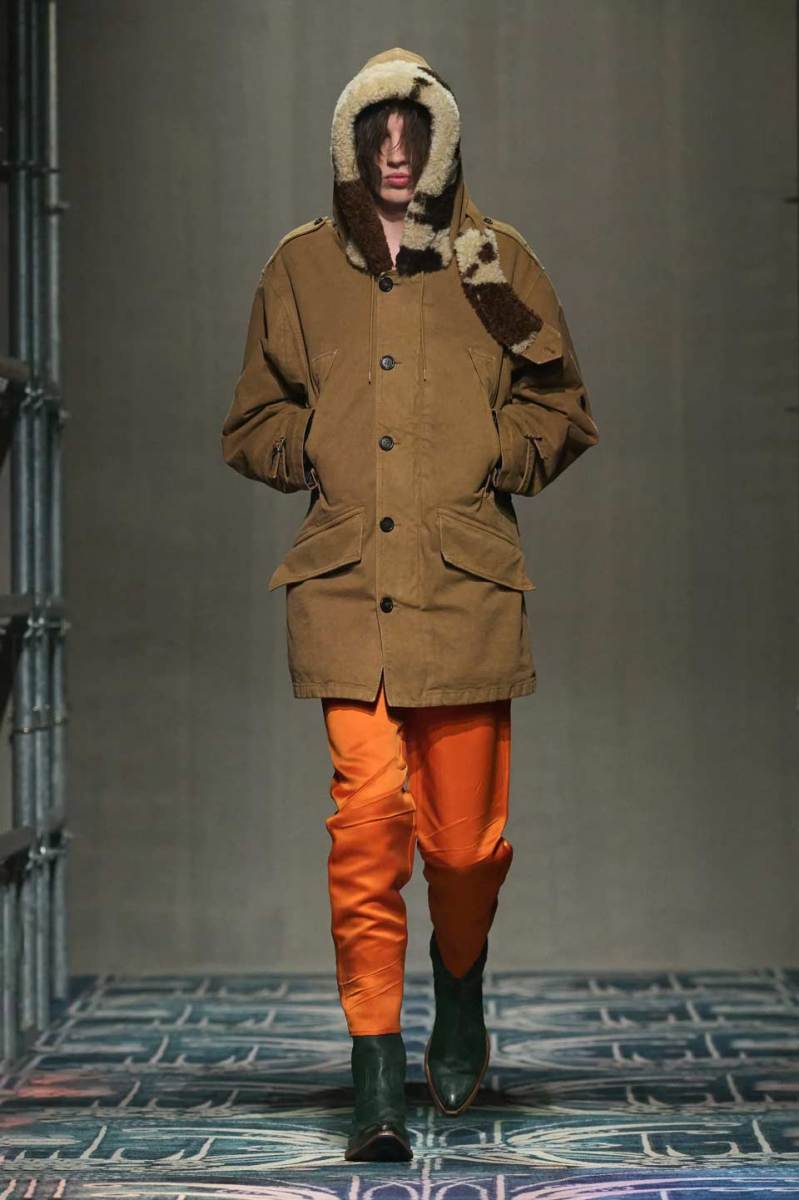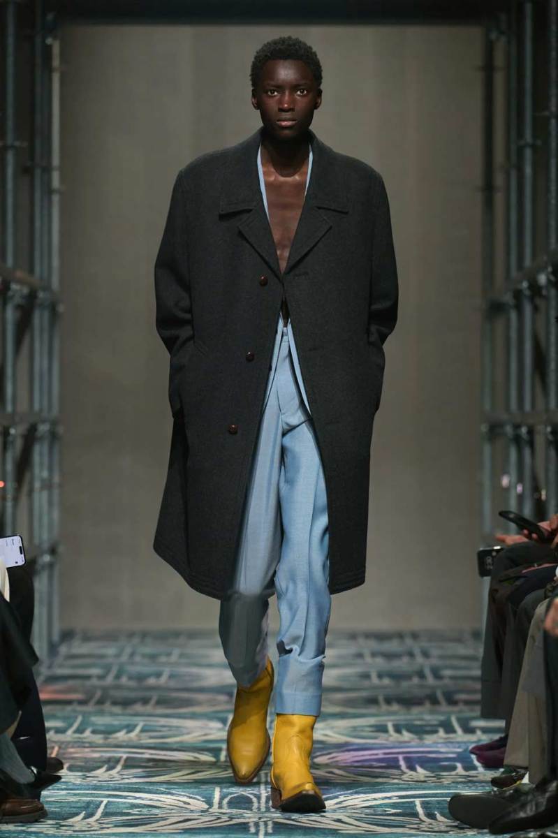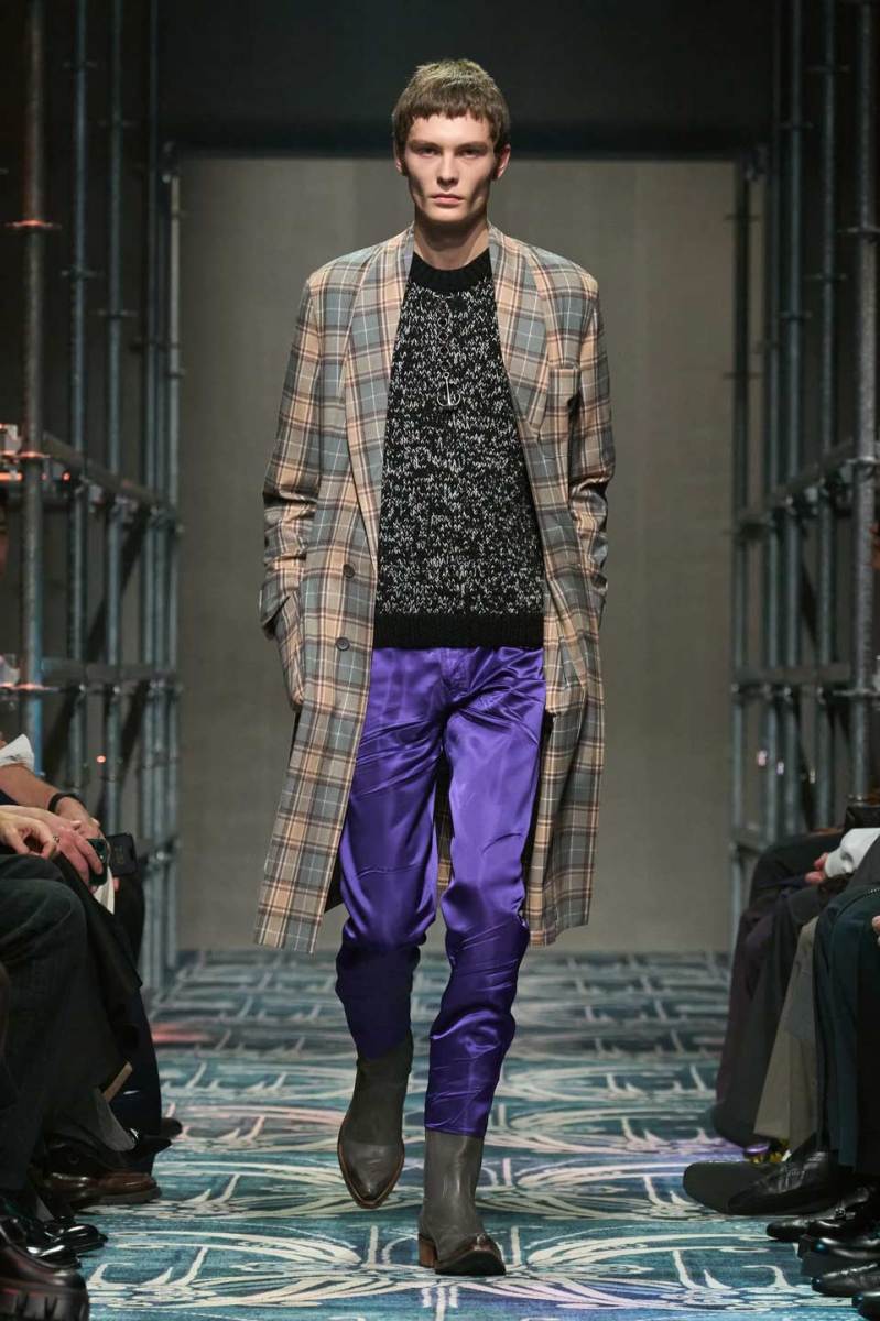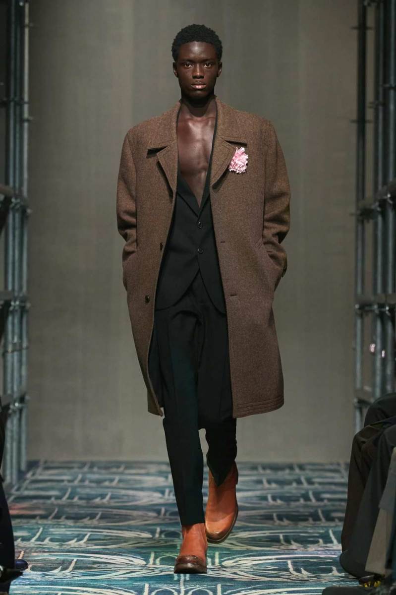 La collezione si configura come un’indagine sulla natura umana, un viaggio attraverso quegli impulsi primordiali che alimentano la creatività. Tra le impalcature dello scenario si declina una passerella cruda, fatta da capi con pelli conciate in modo selvaggio, stivali sotto pantaloni quasi forzati e accessori maxi. Per Prada e Simons, la moda non è solo estetica, ma un mezzo per ricercare sicurezza, espressione e identità. I due co-direttori creativi definiscono queste pulsioni primitive come la chiave per elevare la passione al di sopra della ragione. Come sottolineano: «Nell’istintivo possono rivelarsi una nuova raffinatezza e un’eleganza intima, selvaggia. I contrasti involontari danno vita a combinazioni inaspettate e seducenti».