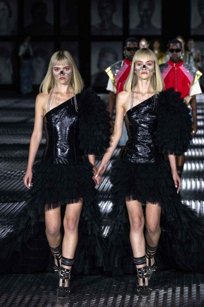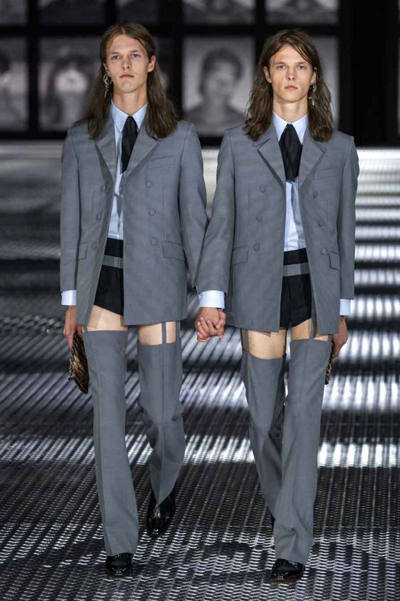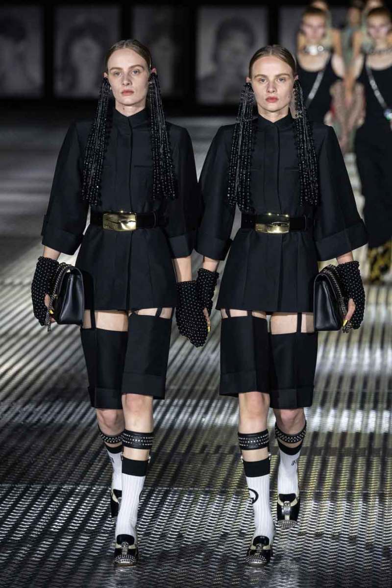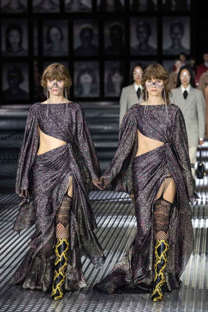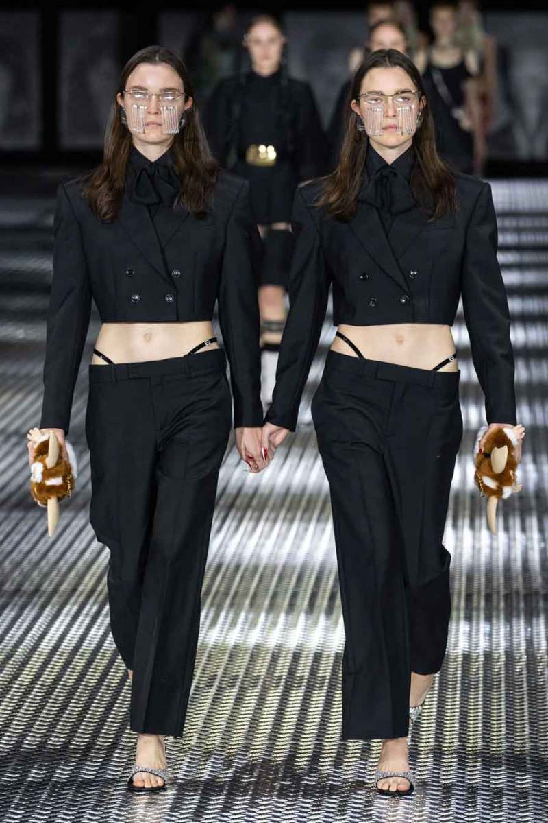 Ci troviamo di fronte ad una location divisa in due da un muro di ritratti fotografati da Mark Peckmezian che presentano l’intero cast di modelli che sfilerà in passerella. In apertura, la voce calda di Marianne Faithfull recita le parole di Identical Twins di John Forster “Io sono io. Lei è lei. Tranne quando pretendo di essere lei. E quando ci scambiamo, non è possibile riconoscere chi è chi. Non sai a chi stai parlando, perché siamo identiche. Gemelle identiche.” La gemellarità era un tema facilmente intuibile del leitmotiv dello show, ma nessuno si sarebbe mai aspettato il coup de théâtre messo in scena dal direttore creativo.