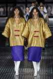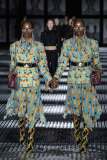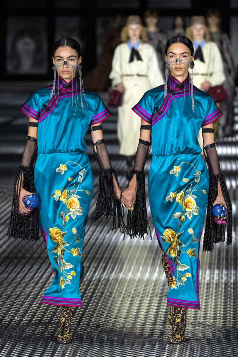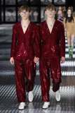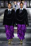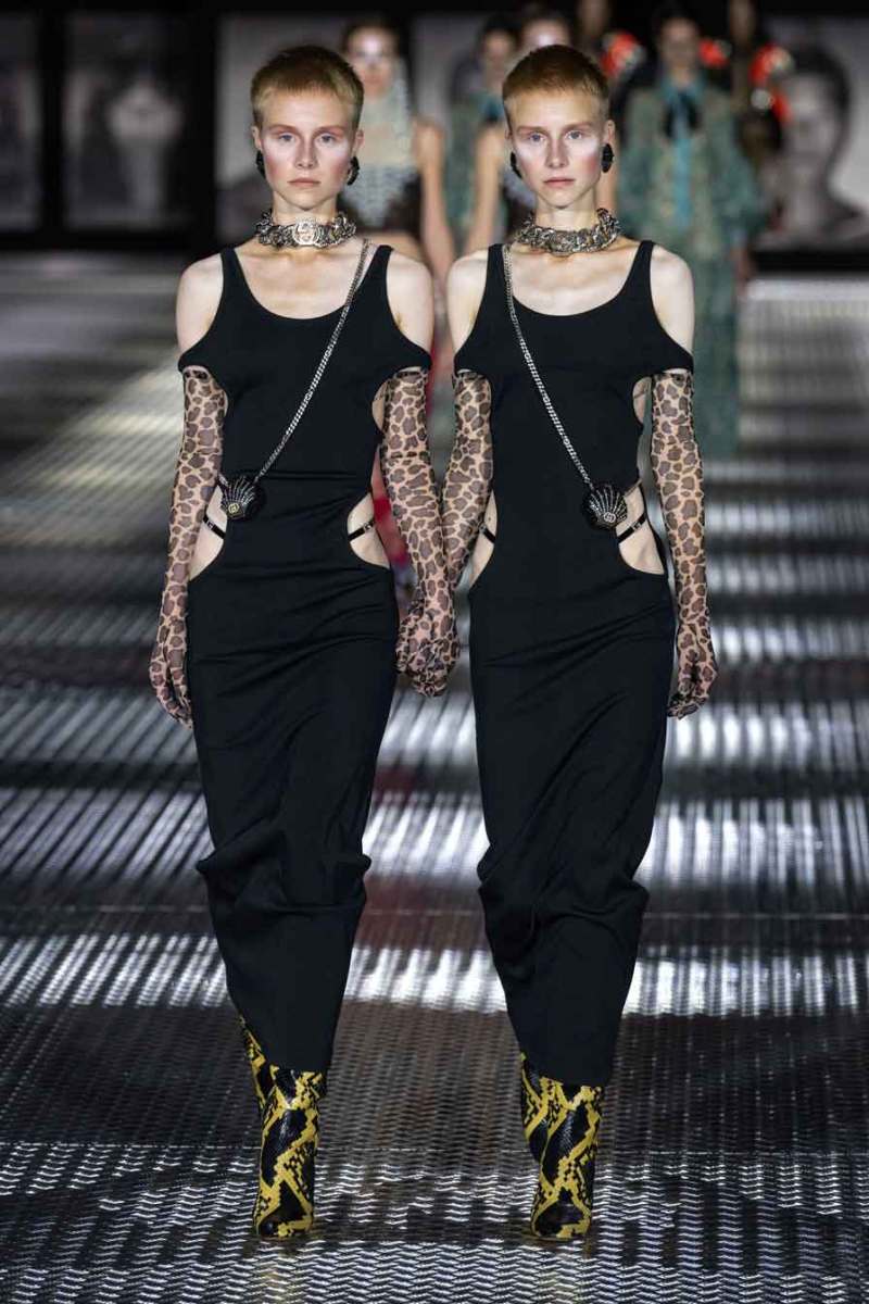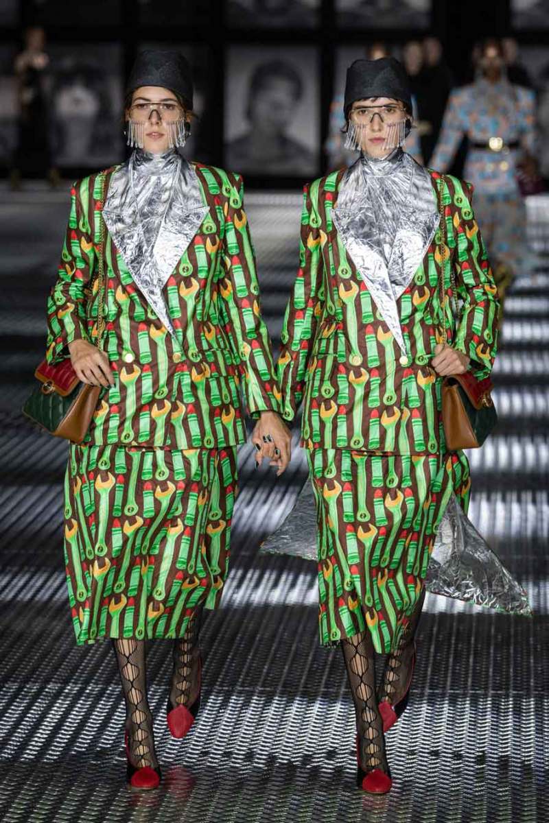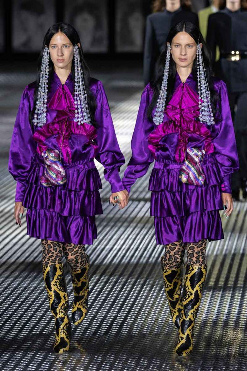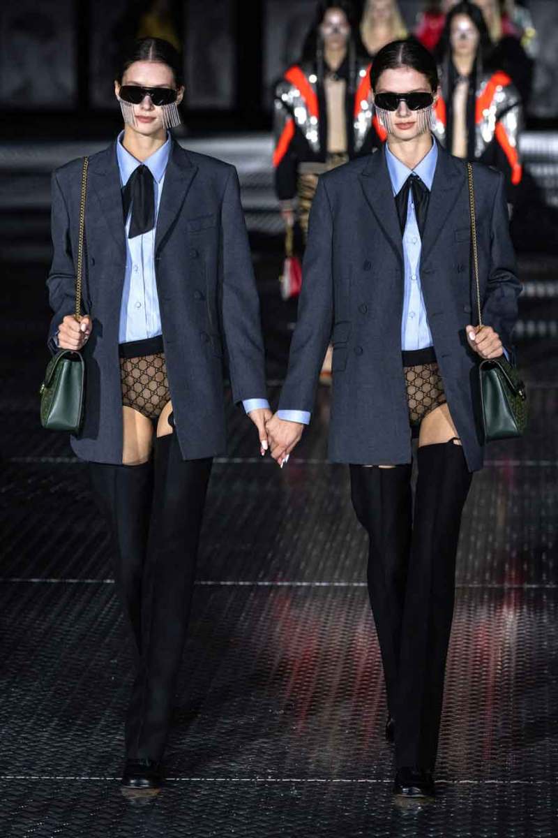 Ci troviamo di fronte ad una location divisa in due da un muro di ritratti fotografati da Mark Peckmezian che presentano l’intero cast di modelli che sfilerà in passerella. In apertura, la voce calda di Marianne Faithfull recita le parole di Identical Twins di John Forster “Io sono io. Lei è lei. Tranne quando pretendo di essere lei. E quando ci scambiamo, non è possibile riconoscere chi è chi. Non sai a chi stai parlando, perché siamo identiche. Gemelle identiche.” La gemellarità era un tema facilmente intuibile del leitmotiv dello show, ma nessuno si sarebbe mai aspettato il coup de théâtre messo in scena dal direttore creativo.