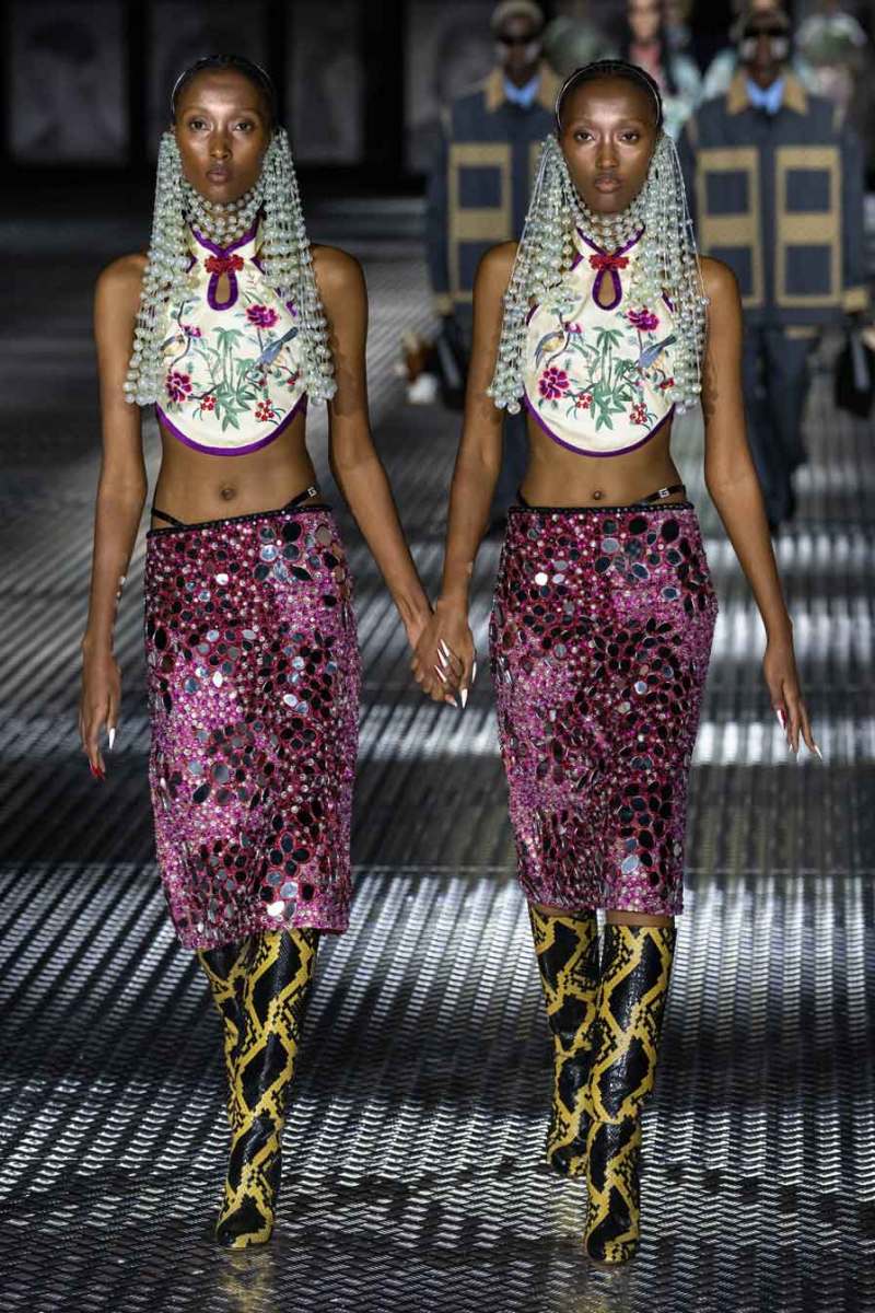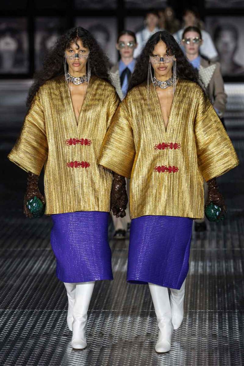 23 settembre 2022, Alessandro Michele non manca di stupire i suoi ospiti con una creatività sopraffina, irriverente. La collezione Primavera/Estate della prossima stagione sfila permeata da tutto il vocabolario ormai consolidato del direttore creativo: un’aura bizzarra, eccentrica, estrosa con un tocco sexy, orientale, vintage.