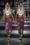 Un’ondata di accessori accompagnano i look scesi in passerella: gli occhiali si arricchiscono di strass pendenti agganciati alla parte inferiore della lente, compaiono i copricapi che si allacciano sul mento e il concetto di collana viene rivisitato cospargendola di perle e facendola passare dalle orecchie.