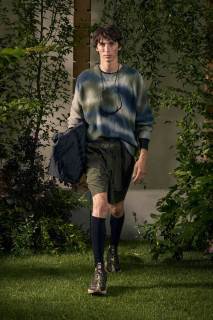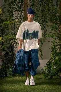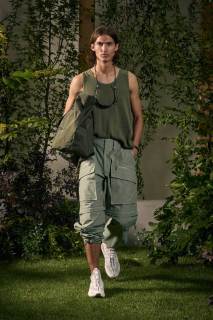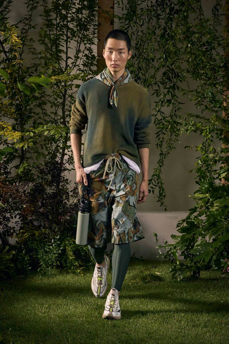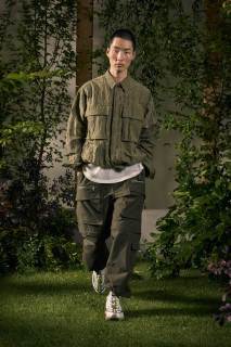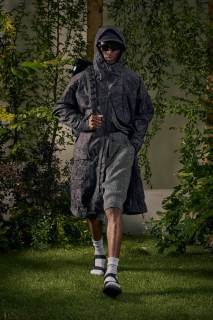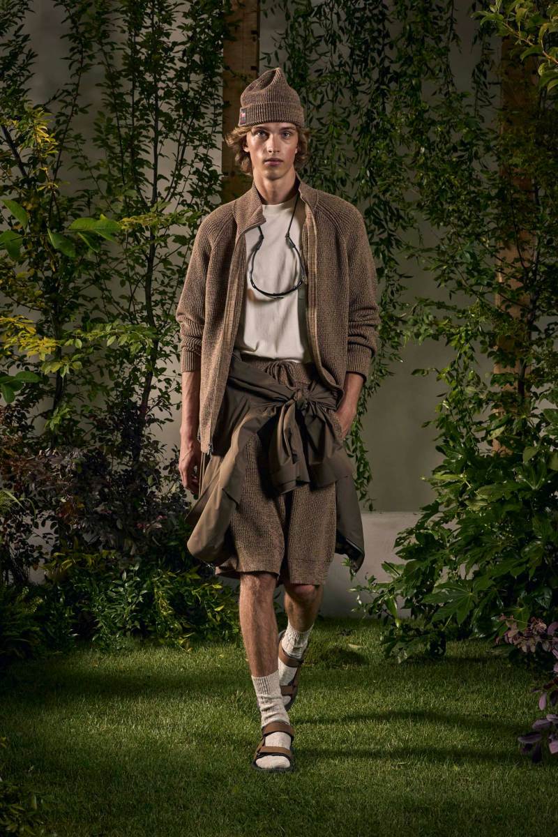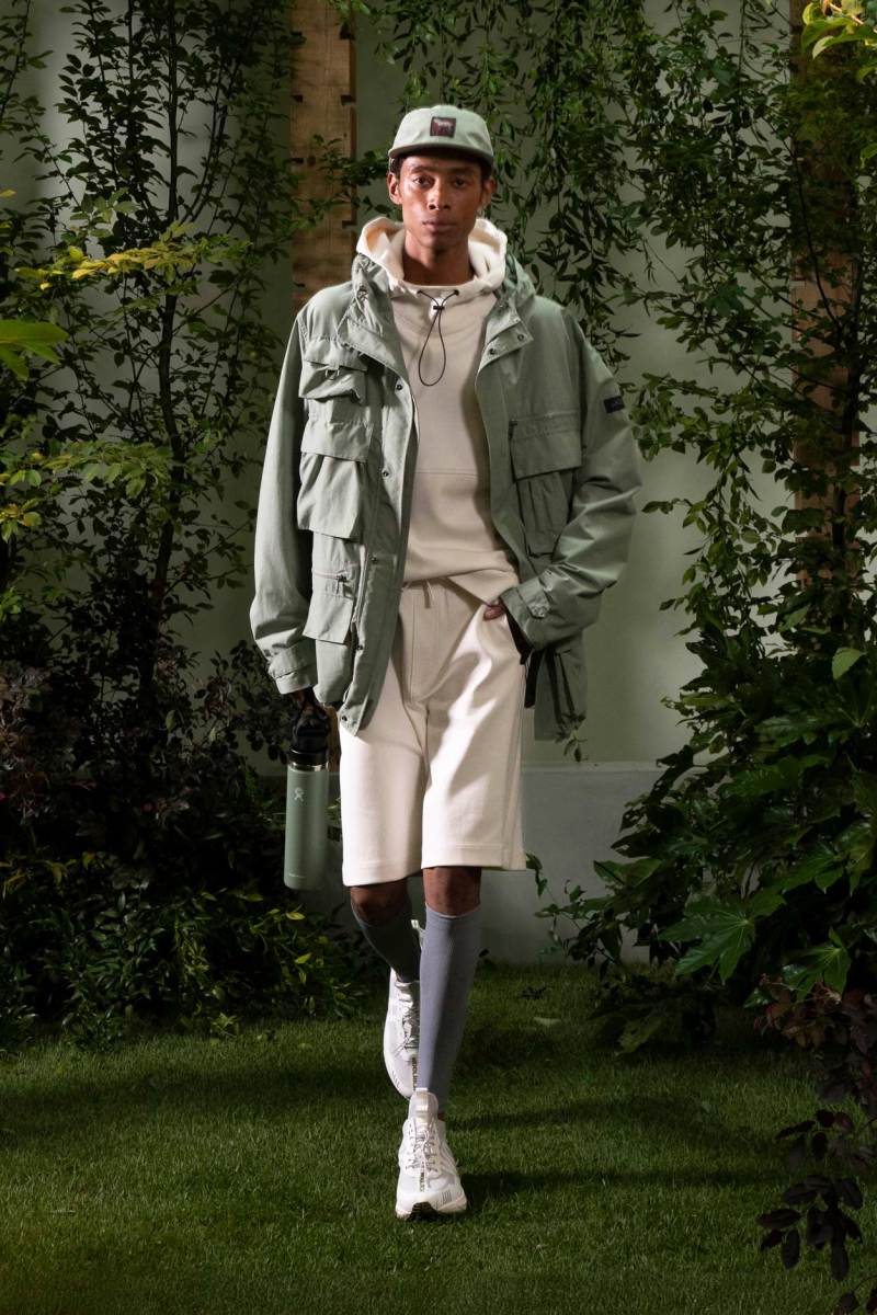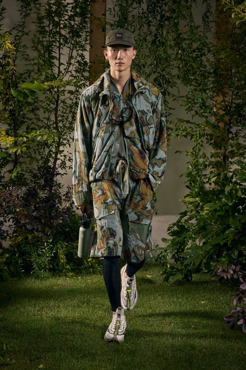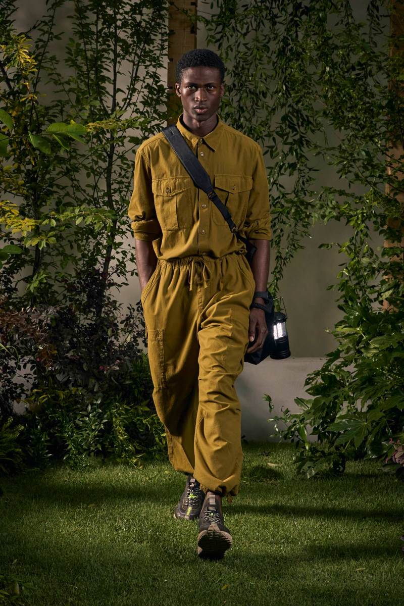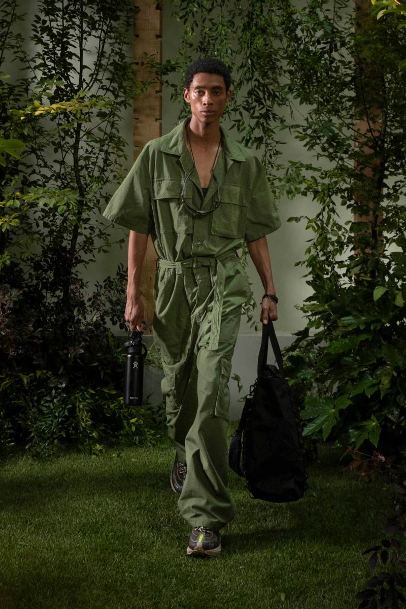 Woolrich propone una collezione di abbigliamento outdoor che rivede il suo heritage in chiave contemporanea. Con 60 capi presentati, la collezione include giacche da pesca, capi da trail running, pantaloncini da trekking e numerosi riferimenti sportivi. I tessuti tecnici e innovativi garantiscono praticità e versatilità. I colori spaziano dal verde militare a tonalità terrose, con accenti più vividi e accesi. Woolrich riesce a combinare estetica e funzionalità, reinventando capi tradizionali, come i pantaloni cargo in nylon che diventano shorts.