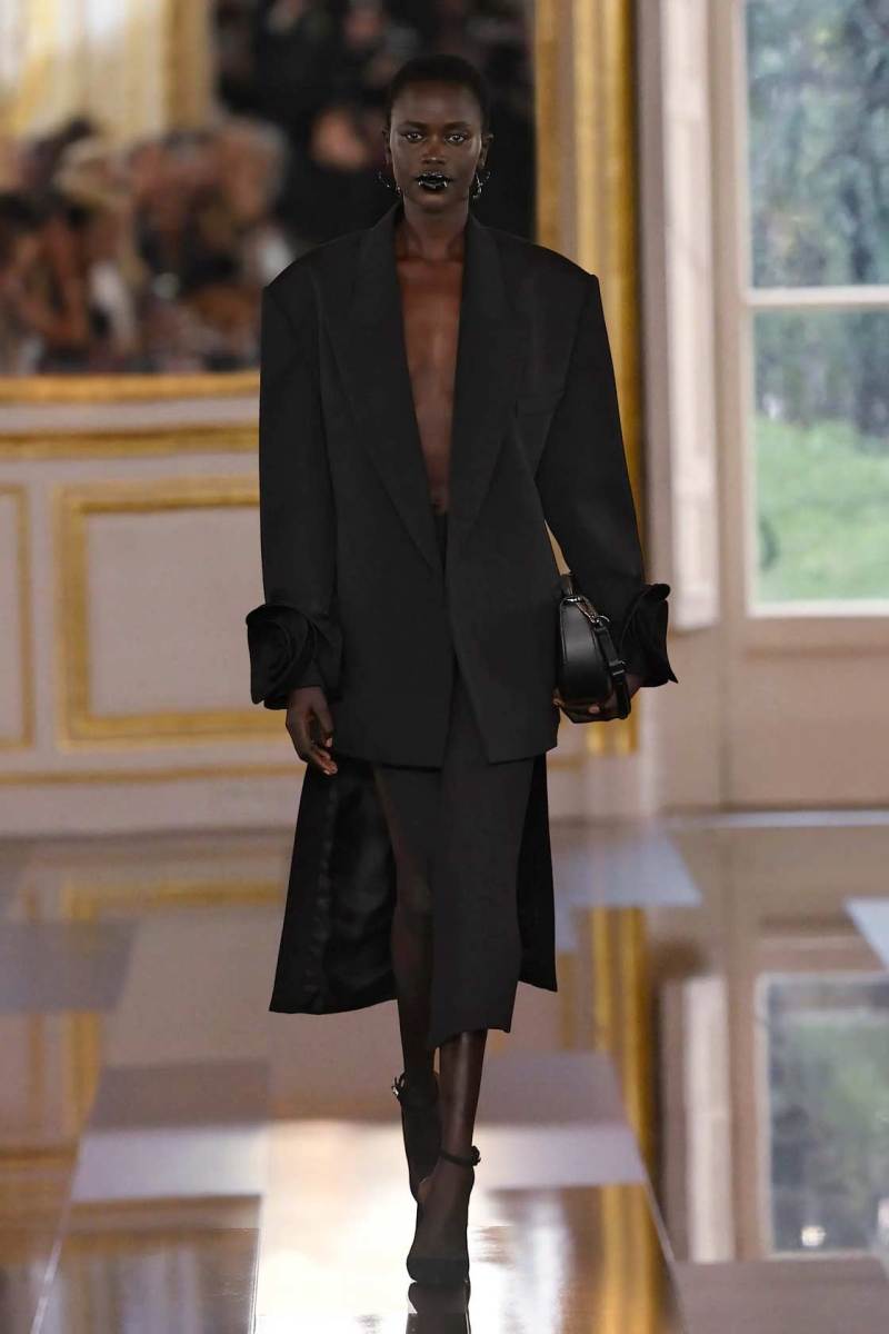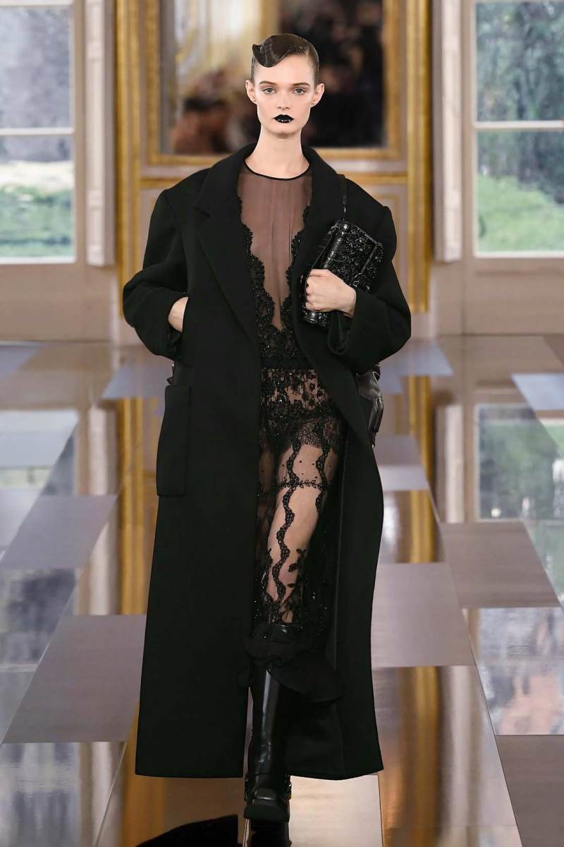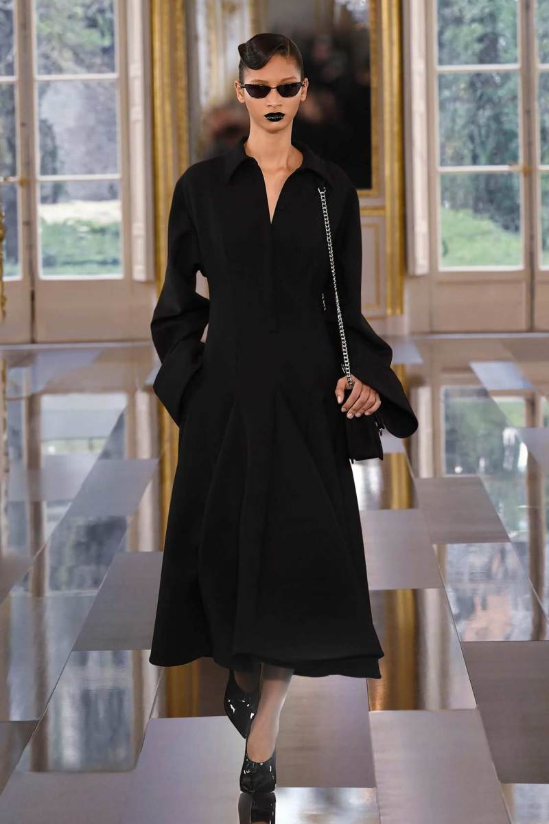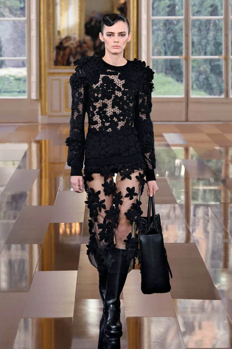 È così che una tuta a pantaloncino quasi workwear viene portata con lunghi guanti in pelle lucida, piume e paillettes discendono su capispalla oversize, grandi rose nere sbocciano sulle maniche di mini abiti dalle imponenti spalline anni ’80. Dai tailleur rigorosi la collezione fluisce come un fiume notturno verso abiti sognanti in cui si sovrappongono pizzo e chiffon, con fiori tridimensionali e cascate di pois che fanno capire quanto il colore più profondo di tutti possa in effetti essere foriero di spensieratezza e giovialità.
