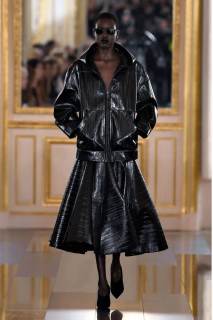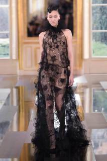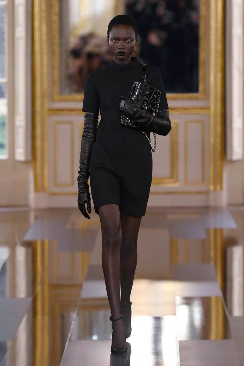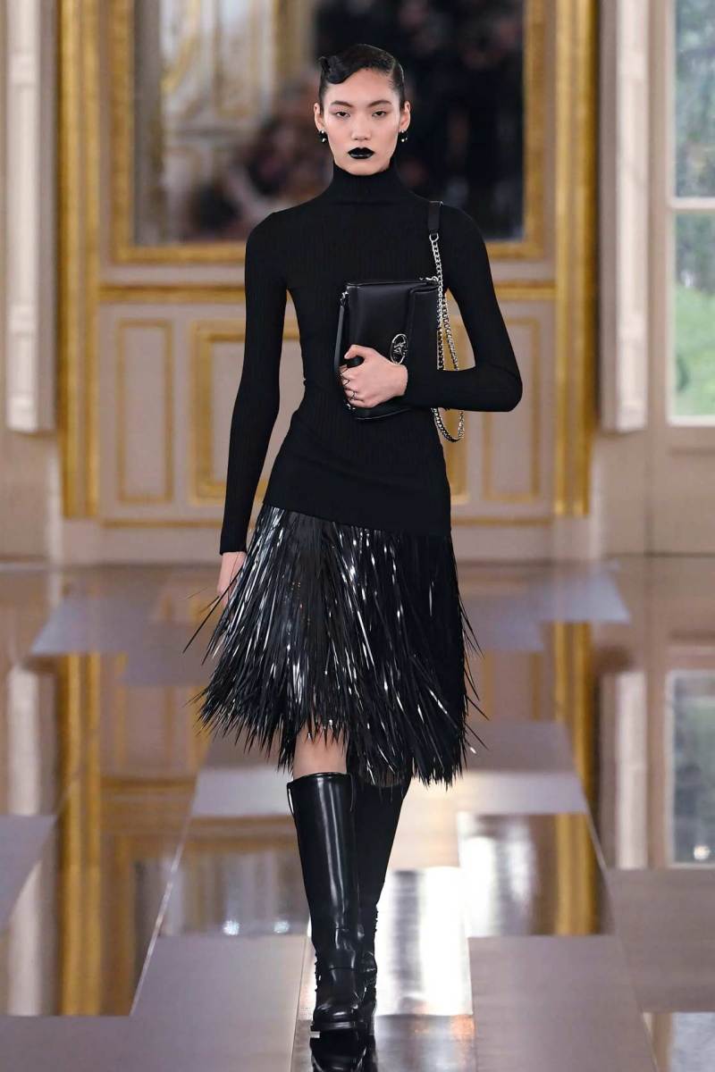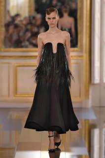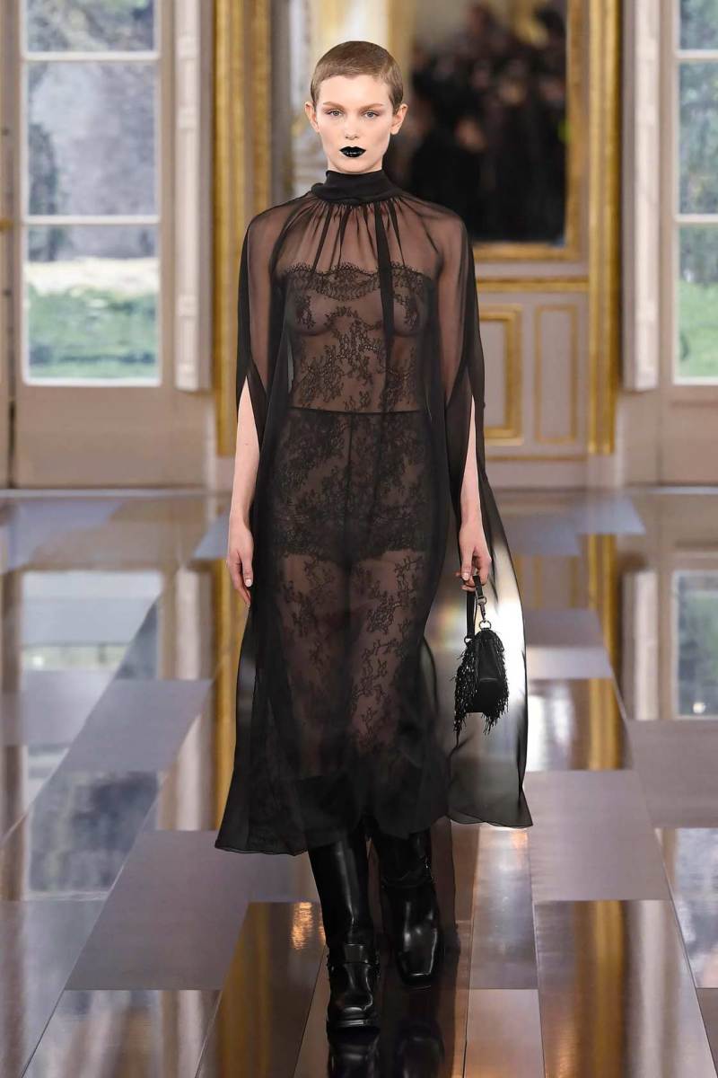 È così che una tuta a pantaloncino quasi workwear viene portata con lunghi guanti in pelle lucida, piume e paillettes discendono su capispalla oversize, grandi rose nere sbocciano sulle maniche di mini abiti dalle imponenti spalline anni ’80. Dai tailleur rigorosi la collezione fluisce come un fiume notturno verso abiti sognanti in cui si sovrappongono pizzo e chiffon, con fiori tridimensionali e cascate di pois che fanno capire quanto il colore più profondo di tutti possa in effetti essere foriero di spensieratezza e giovialità.