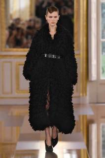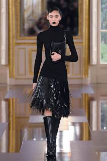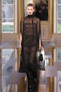 Il nero ricopre, come a questo punto è ovvio, anche gli accessori. Le décolleté sono a punta e molto accollate oppure allacciate alla caviglia, mentre gli stivali hanno la punta squadrata e un allure biker che dialoga piacevolmente con gonne lunghissime e stoffe semi trasparenti. Le borse sono a mano o a tracolla, in pelle classica o con esuberanti mini frange, perfetto complemento di una collezione in cui la femminilità fuoriesce da ogni pezzo come un fascio di luce dall’oscurità.