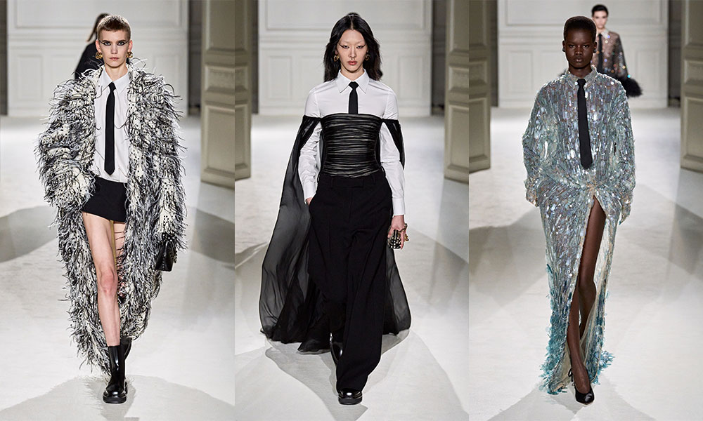 La nuova collezione presentata da Pierpaolo Piccioli domenica 6 marzo a Parigi rompe i confini tra abbigliamento maschile e femminile in nome di quella gender equality per cui tanto si lotta al giorno d’oggi. E questo è evidente nel larghissimo uso di cravatte indossate sia dai modelli che dalle modelle. Valentino dimostra quindi di restare al passo con la modernità rompendo i confini troppo fissi dei generi, ma al contempo non perde la qualità dei materiali e dei tessuti e la ricchezza di tecniche proprie della Maison.