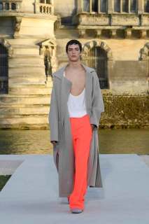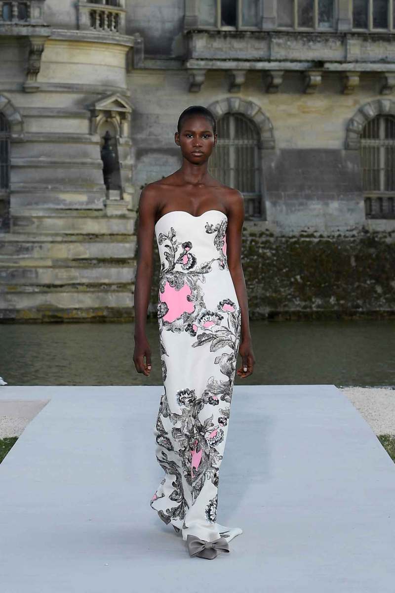 La maggior parte delle modelle ha sfilato su mules flat decorate da un grande fiocco, fatta eccezione per alti stivali bianchi indossati su gonne e abiti midi, riuscendo a scendere senza difficoltà la lunga scalinata che conduce ai giardini del maestoso Château de Chantilly. Principesse moderne che non rischiano di perdere alcuna scarpetta.