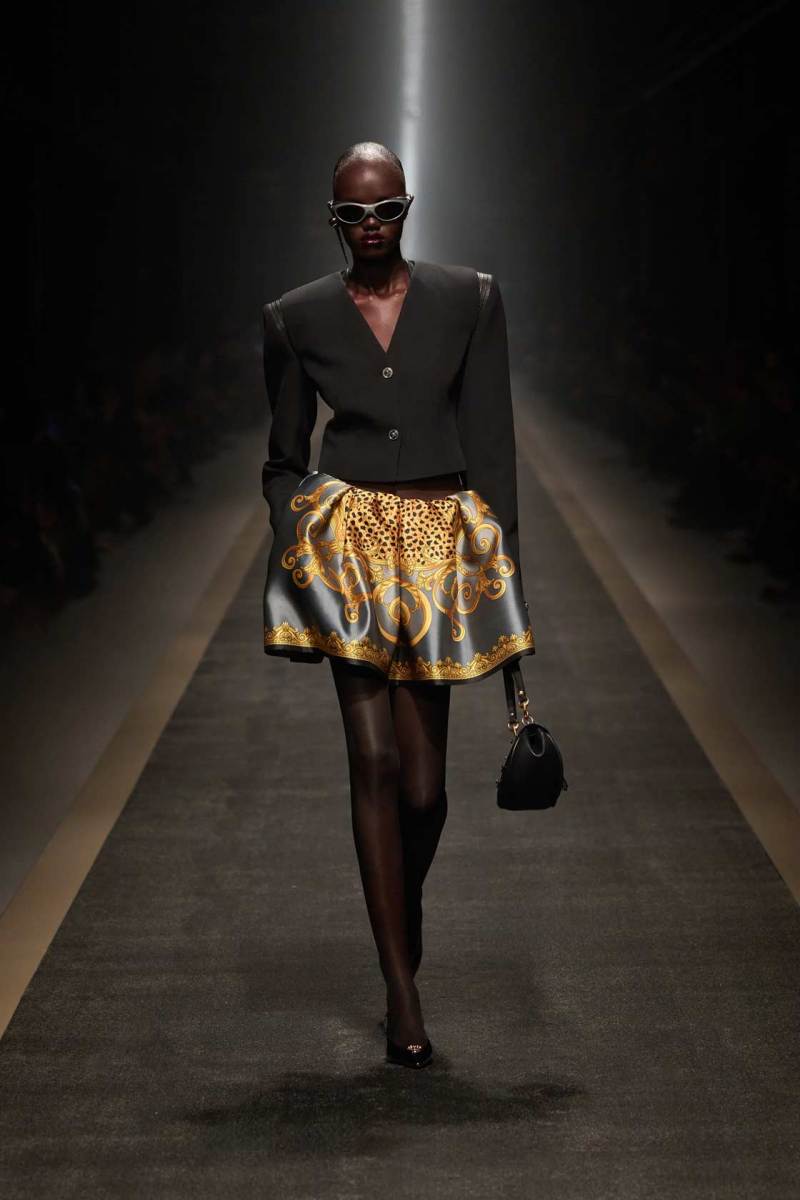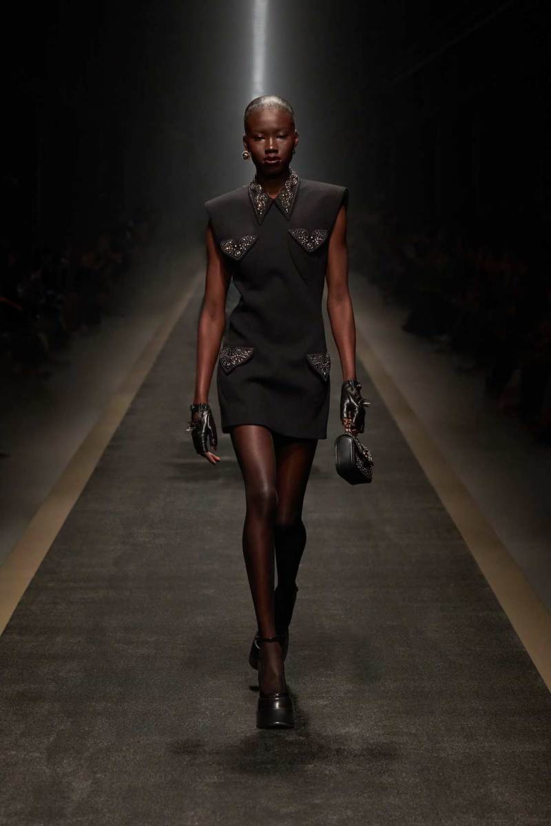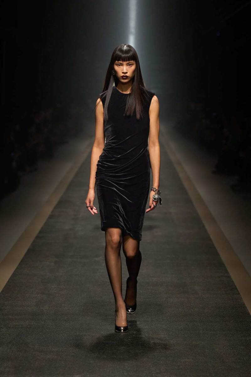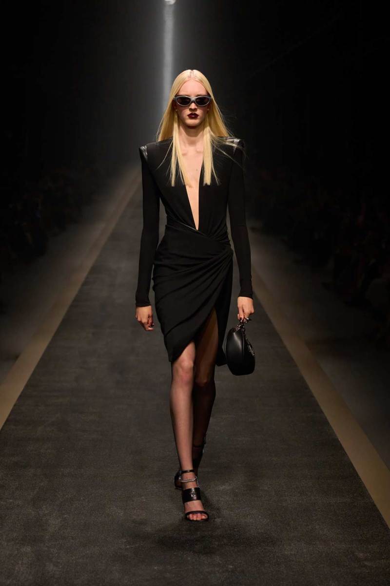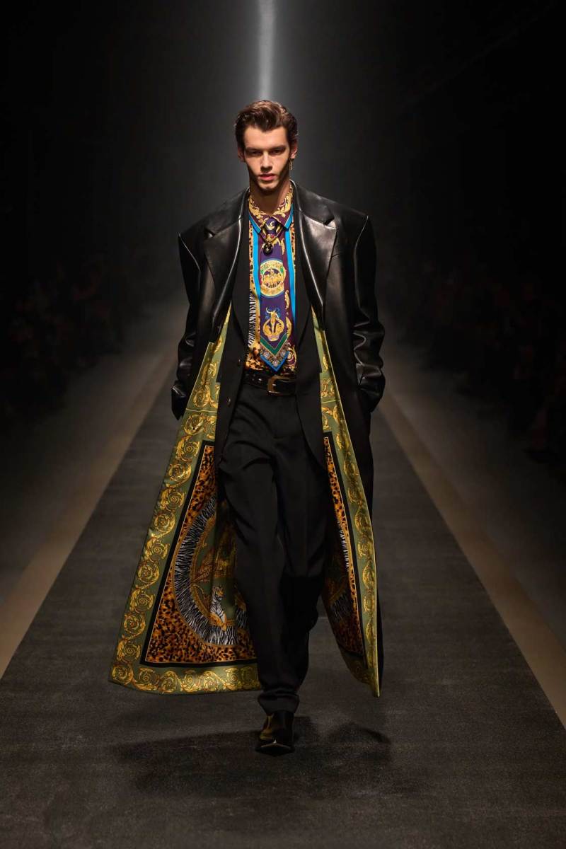 Il nero, protagonista incontrastato, non è solo un colore: è un manifesto. Da sfondo perfetto per esplosioni di stampe e dettagli vibranti a dichiarazione di potere assoluto, domina cappotti rigorosi, abiti dalle spalle marcate e body sensuali che esaltano la silhouette. Ma Versace non sarebbe Versace senza un tocco di ribellione: borchie affilate, richiami animalier e un sottile gioco tra velluto e pelle creano un mix esplosivo di energia e raffinatezza.