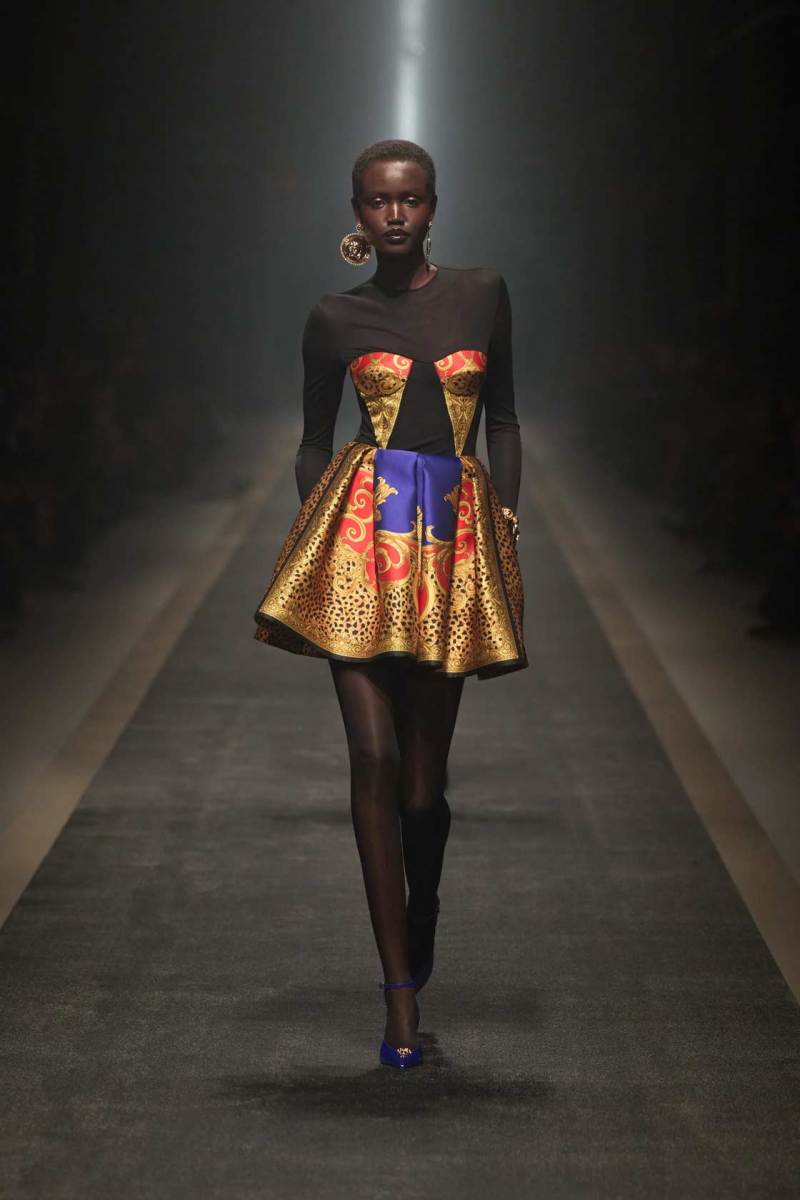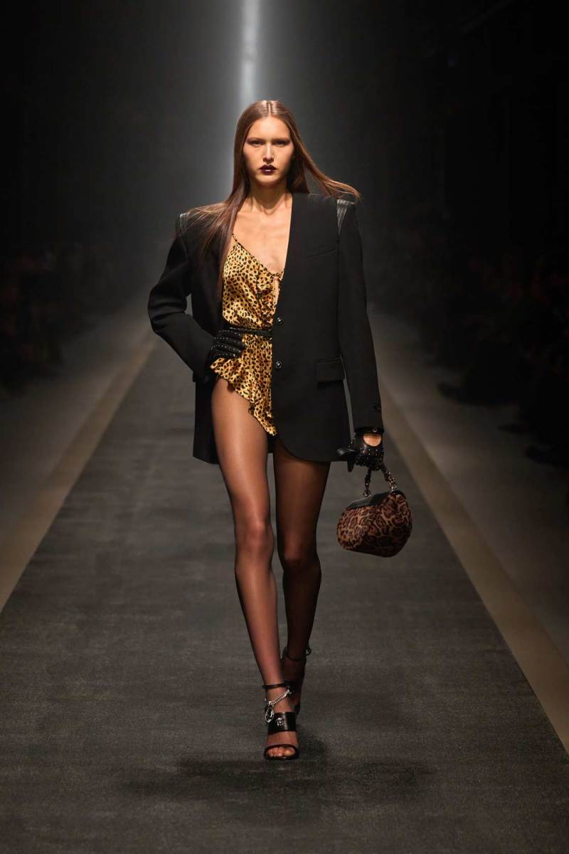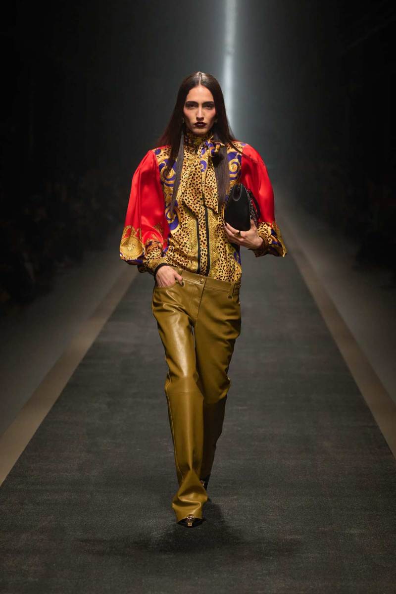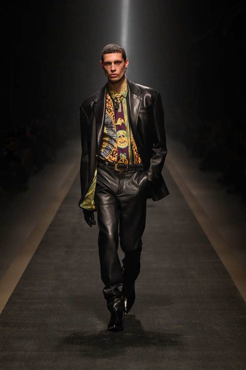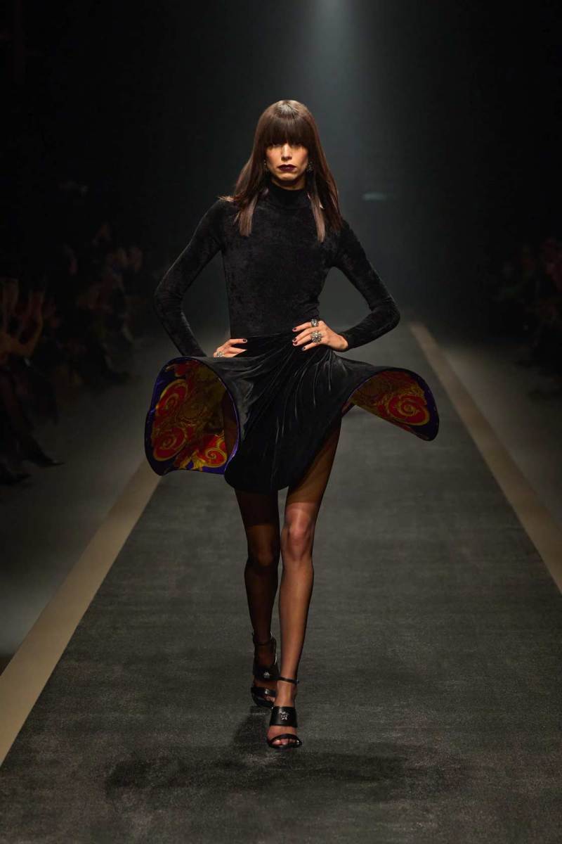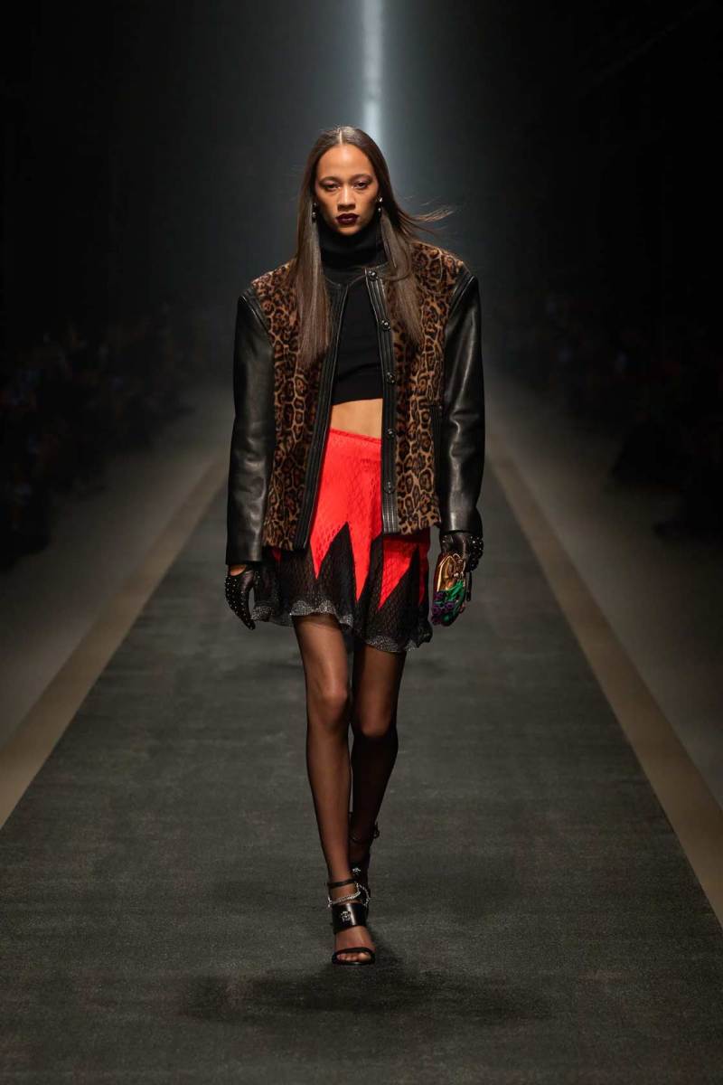 Il nero, protagonista incontrastato, non è solo un colore: è un manifesto. Da sfondo perfetto per esplosioni di stampe e dettagli vibranti a dichiarazione di potere assoluto, domina cappotti rigorosi, abiti dalle spalle marcate e body sensuali che esaltano la silhouette. Ma Versace non sarebbe Versace senza un tocco di ribellione: borchie affilate, richiami animalier e un sottile gioco tra velluto e pelle creano un mix esplosivo di energia e raffinatezza.