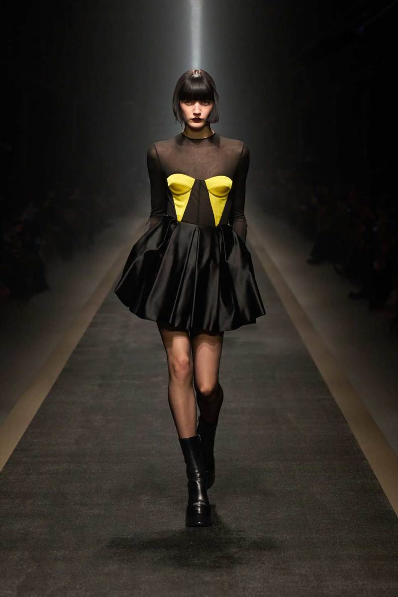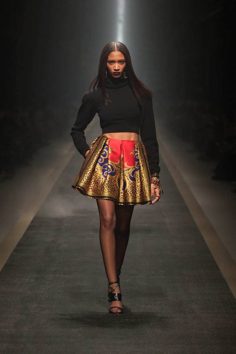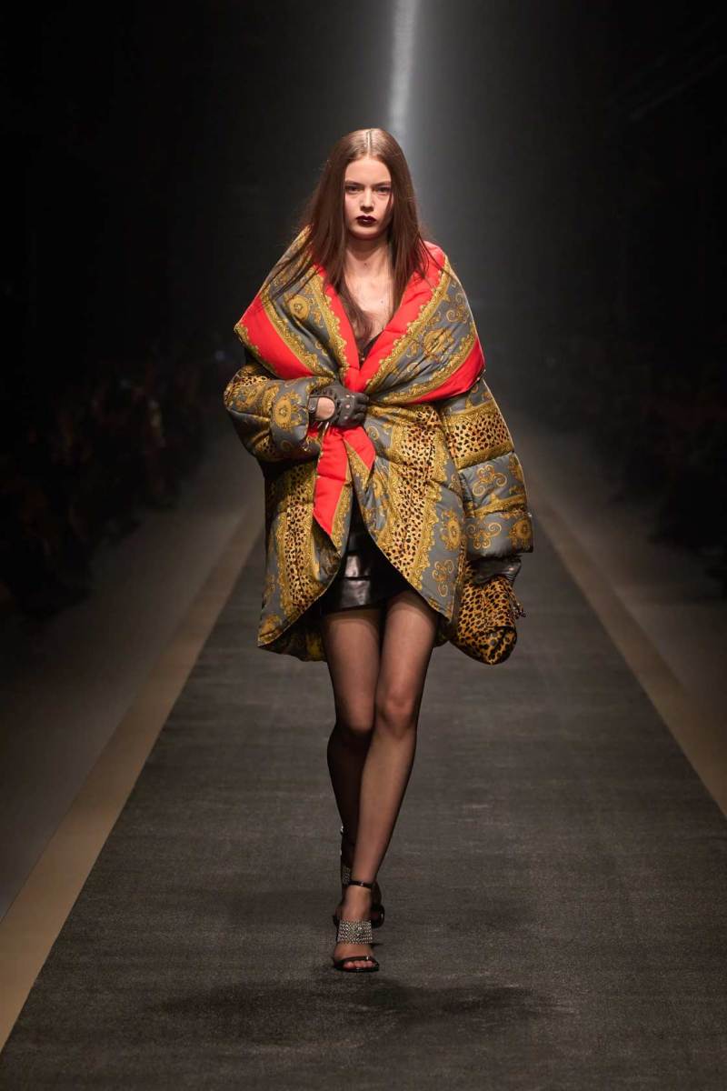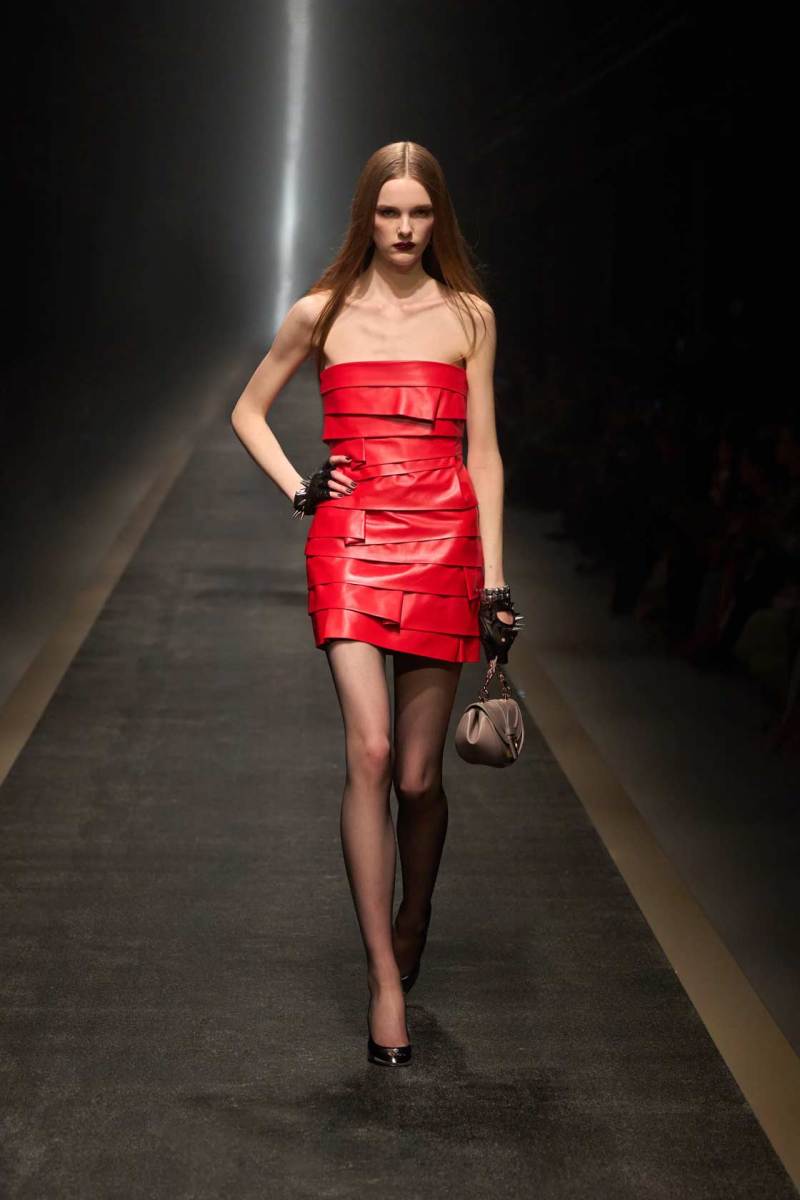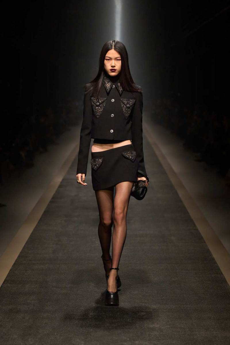 Il nero, protagonista incontrastato, non è solo un colore: è un manifesto. Da sfondo perfetto per esplosioni di stampe e dettagli vibranti a dichiarazione di potere assoluto, domina cappotti rigorosi, abiti dalle spalle marcate e body sensuali che esaltano la silhouette. Ma Versace non sarebbe Versace senza un tocco di ribellione: borchie affilate, richiami animalier e un sottile gioco tra velluto e pelle creano un mix esplosivo di energia e raffinatezza.