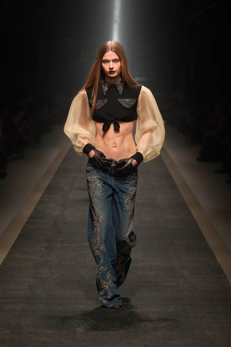 L’ultimo atto dello show è pura seduzione: abiti in maglia metallica scivolano sulle curve, mentre ruches impalpabili e dettagli dal sapore western aggiungono un twist inaspettato. Ogni look è un frammento di un racconto più grande, quello di una maison che non smette mai di reinventarsi.