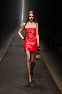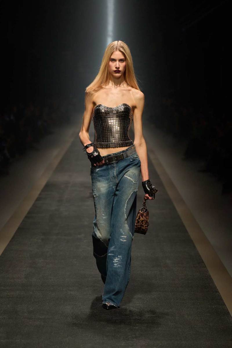 Nel cuore pulsante della città, tra i binari di un imponente deposito di tram, Versace ha inscenato il suo spettacolo di lusso e potenza. La passerella, un’infinita distesa di quasi 150 metri, ha accolto una collezione che reinterpreta i codici della casa con una freschezza disarmante. Il primo atto è un viaggio negli anni ‘90, quando Gianni Versace scriveva la storia del glamour. Piumini imbottiti dall’iconico pattern barocco si trasformano in mini abiti strutturati, mentre bustier scolpiti e gonne scultoree strizzano l’occhio ai costumi da balletto disegnati dal fondatore.