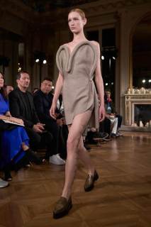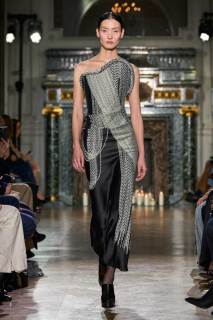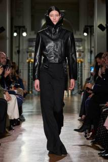 I blazer rivelano schiene scoperte, gli abiti mini diventano tridimensionali creando un gioco pazzesco di prospettive. Non mancano capispalla rivoluzionari, giacche biker, colli esagerati, pantaloni a palazzo, smanicati in lana. Un guardaroba sofisticato ma eccentrico che si colora di tonalità piuttosto sobrie, tra cui il verde bottiglia, il rosa baby e il blu notte. La palette si dipinge di nuances neutre, di blu notte, verde bottiglia e rosa baby.