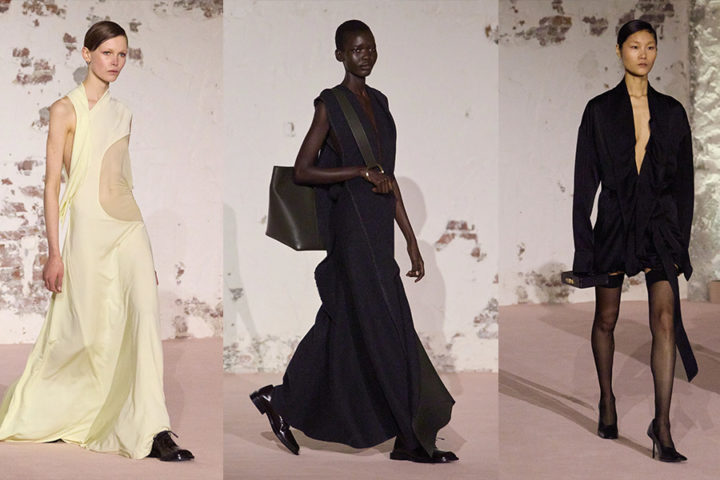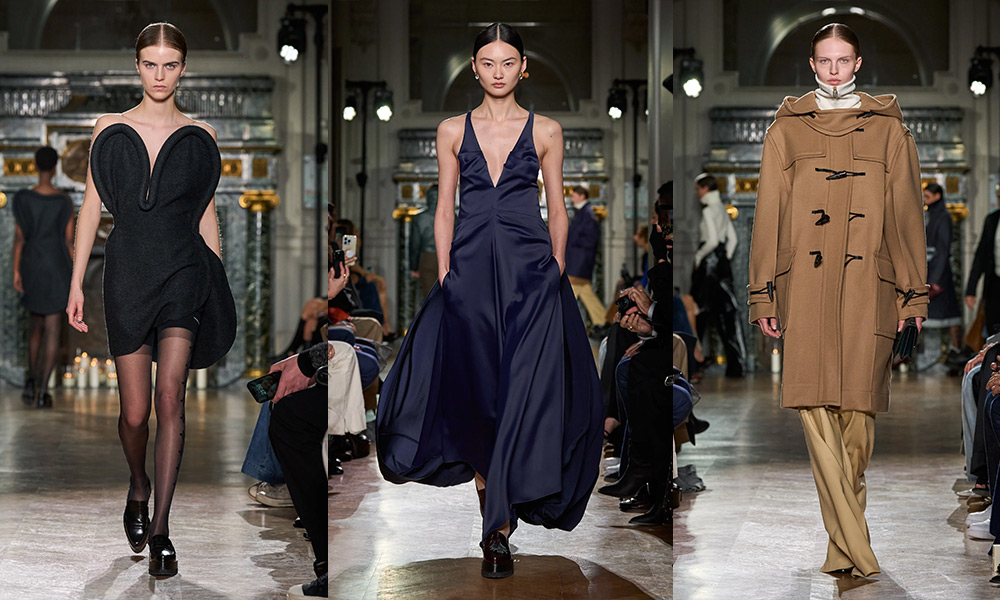 Abiti con scollo a cuore, giacche che si appoggiano sui corpi, con il rever semi staccato, abiti fluidi che sembrano staccarsi e slegarsi dai corpi. Un guardaroba che risulta un capolavoro originale, super stiloso. Una collezione che vuole sperimentare, andare oltre e creare qualcosa di davvero originale, sbarazzino e innovativo. I contrasti si vedono nei capi che risultano sì funzionali, ma complessi nella loro costruzione formale. Gli elementi iconici e classici restano fedeli a quelli di sempre, ma vengono sovrapposti e arricchiti da una nuova visione.