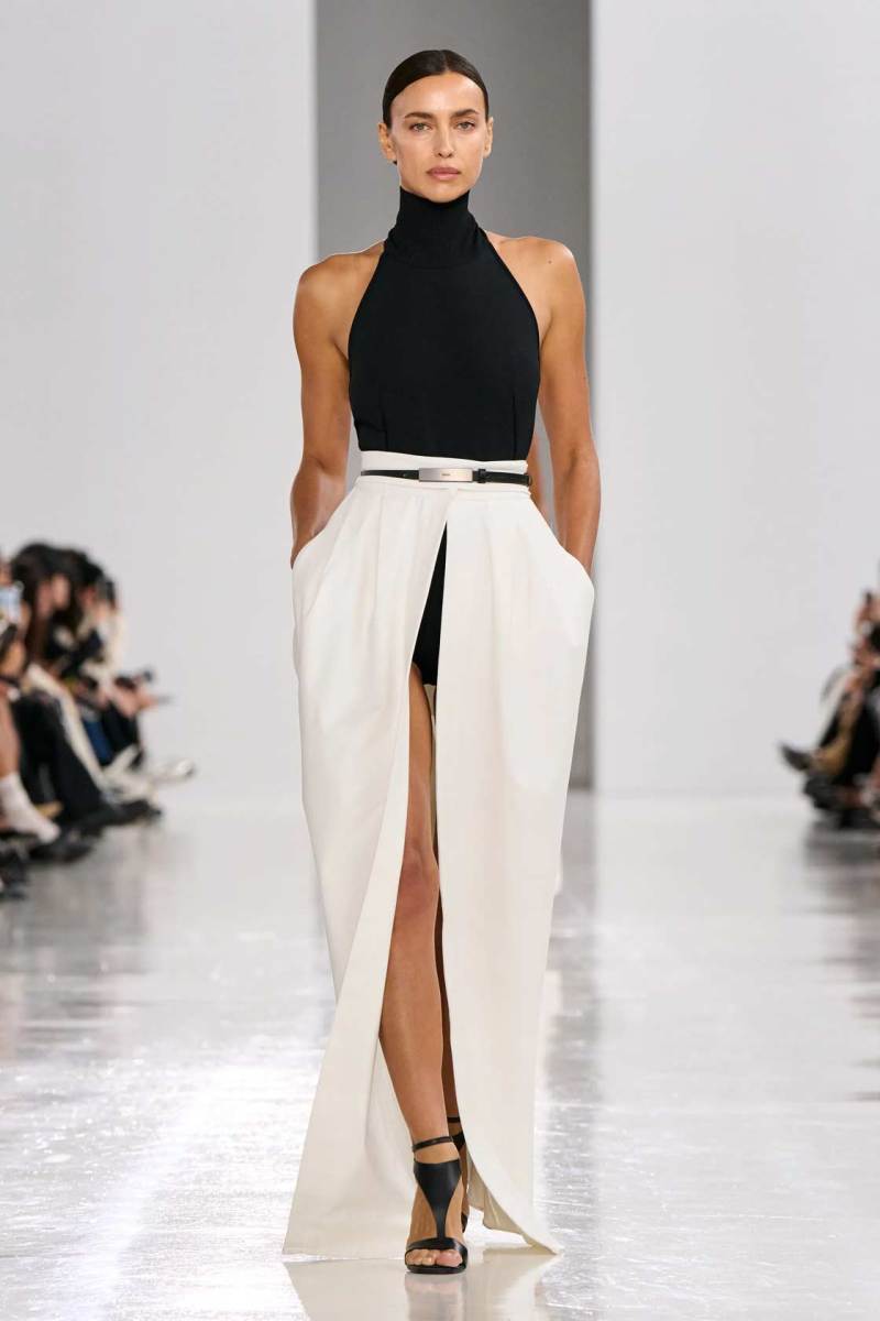 La palette cromatica attinge ai colori dei laboratori scientifici, creando un’atmosfera quasi mistica. Le cuciture dei trench e dei capi sartoriali richiamano i segni grafici della trigonometria, mentre i drappeggi si trasformano in asimmetrie moderne, esprimendo un’eleganza senza tempo. Le coulisse ellittiche rivelano dettagli inaspettati che valorizzano il corpo femminile. La sfilata si distingue per la sua versatilità: cappotti cammello con zip e gonne a colonna sono i pilastri di un guardaroba moderno, pensato per essere indossato in ogni occasione.