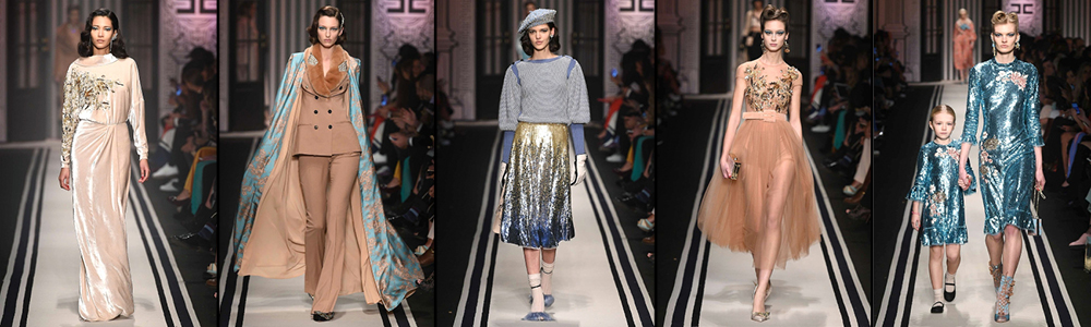 Gli abiti fluidi segnano delicatamente la silhouette delle modelle, evidenziando il punto vita e lasciando che le gonne ondeggino naturalmente. Il gessato si impone sulle giacche e sui lunghi pantaloni, mentre la pelliccia, rigorosamente sintetica, incornicia il collo, le maniche e la scollatura. Per la prossima stagione anche Elisabetta Franchi lancia la moda del floreale, riproducendo questi elementi naturali, come anche l’airone, sui luccicanti long dress, sulle cinture e sui soprabiti.