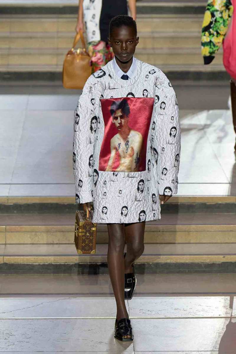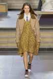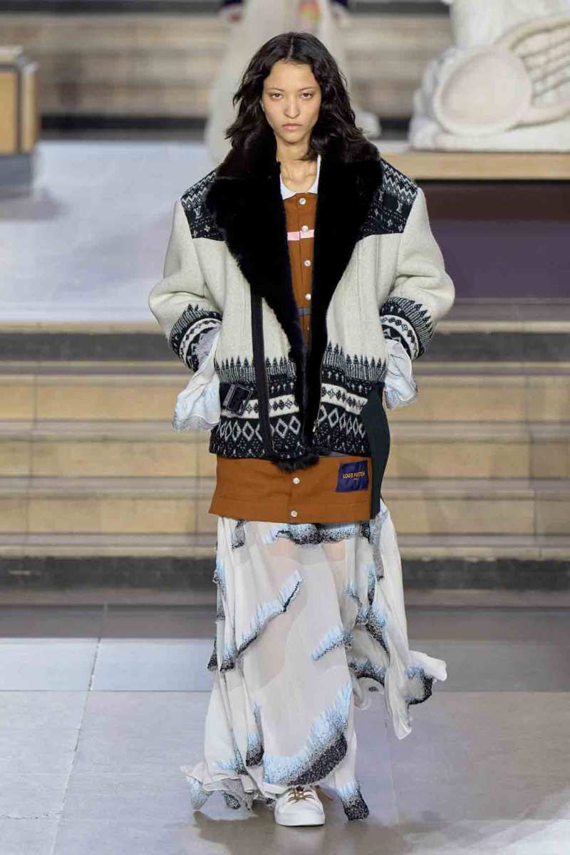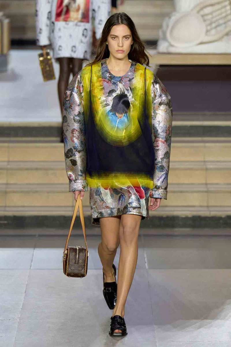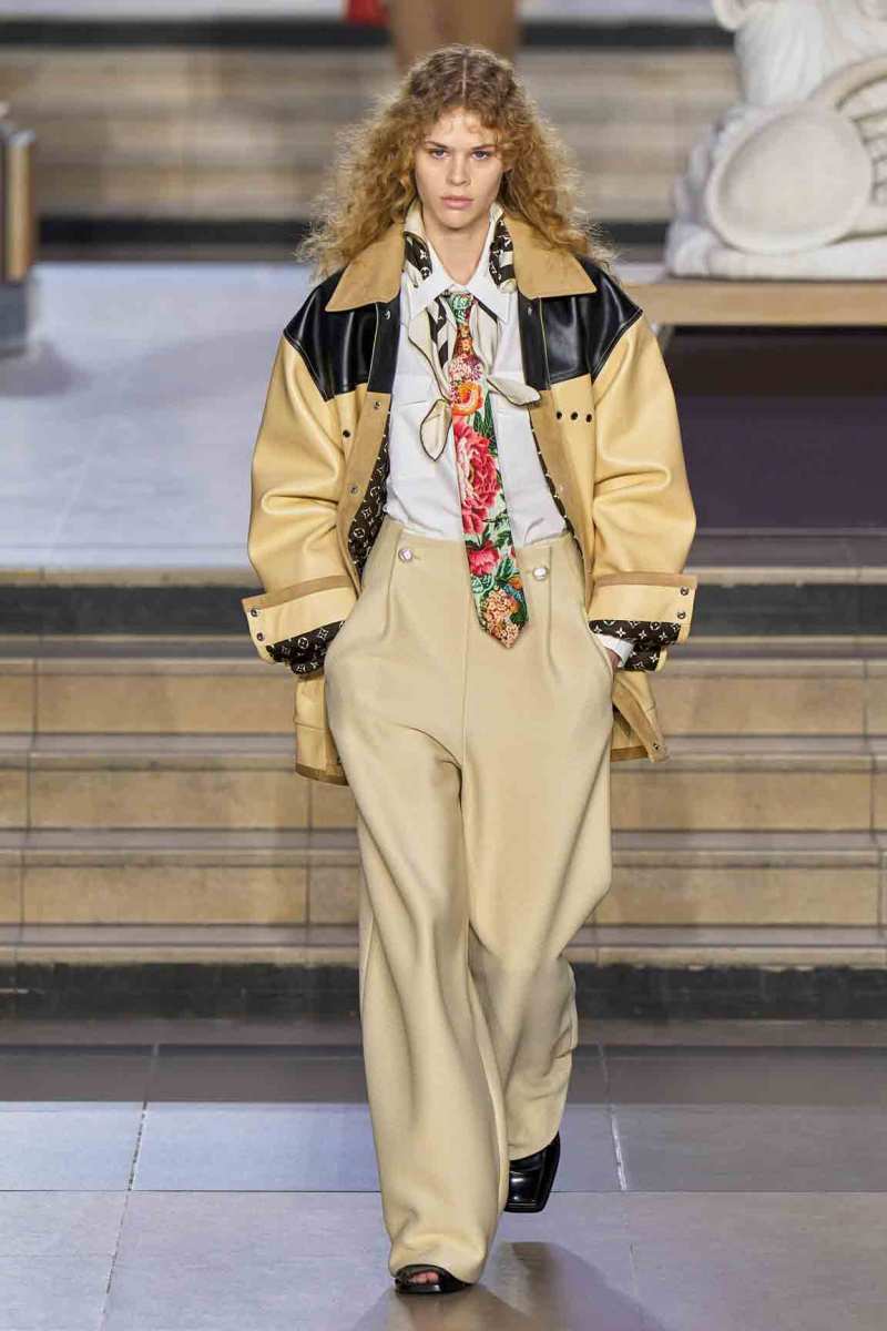 Completi dai colori pastello, ma anche spezzati eleganti e morbidi impreziositi da bottoni o mini cinture. I tessuti per questi capi variano dalla pelle alla lana dal taglio sartoriale. I cappotti proposti, dallo stampo oversize, sono tutti in pelle; dal color caffè al beige, con interni foderati dalla stampa LV. Ma anche trench e blazer che, come nuova proposta, stupiscono in passerella cingendo la vita delle modelle per poi ampliarsi, scendendo sino a creare due lembi di una sciarpa.