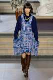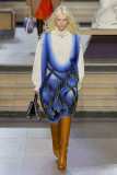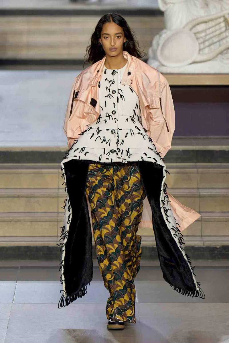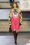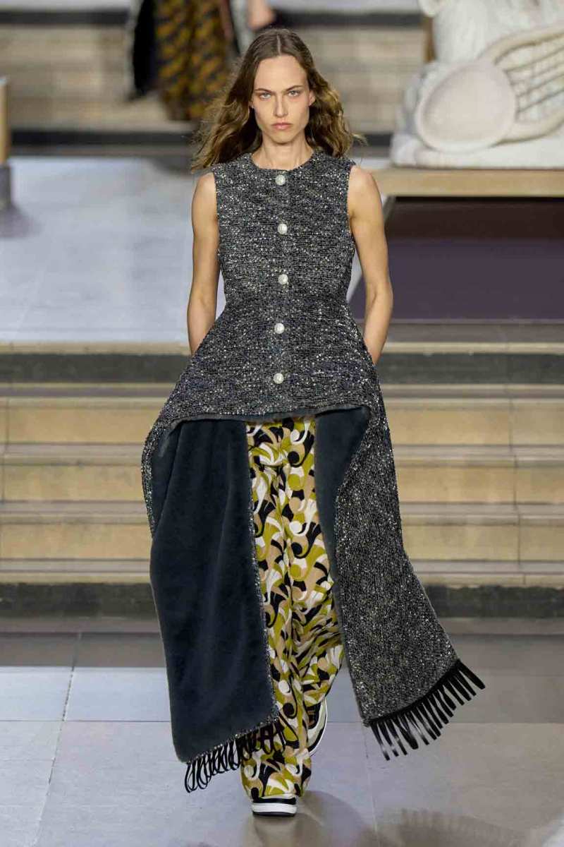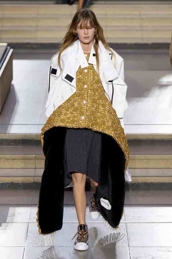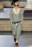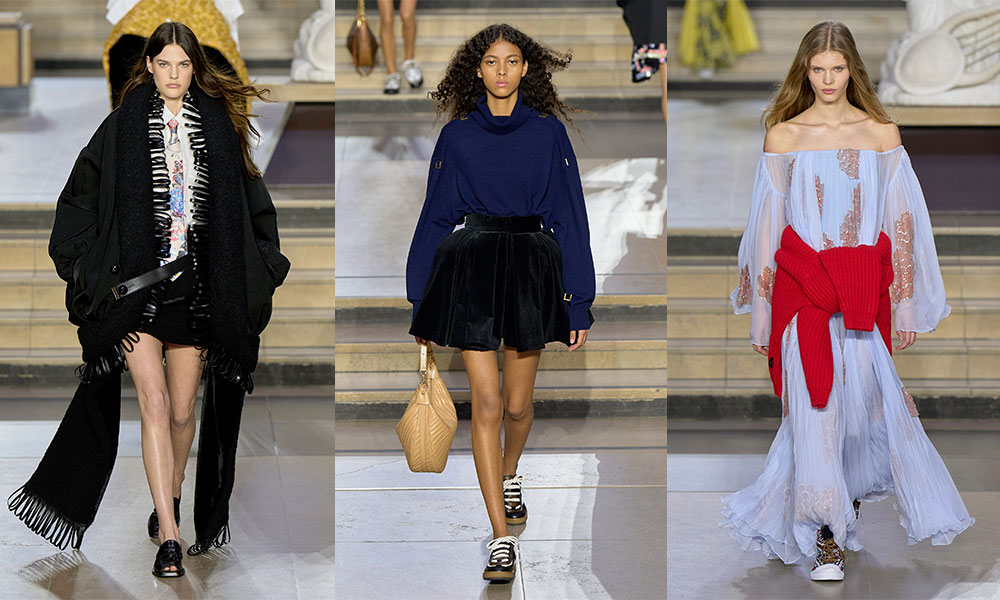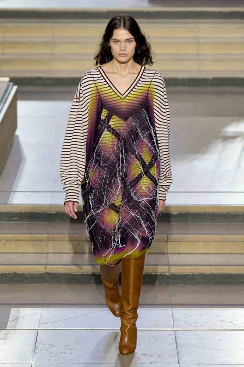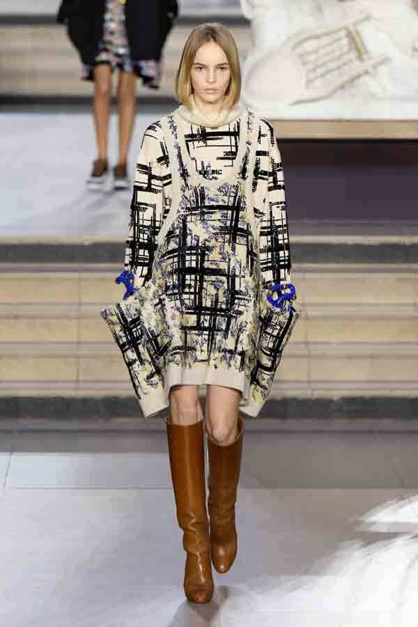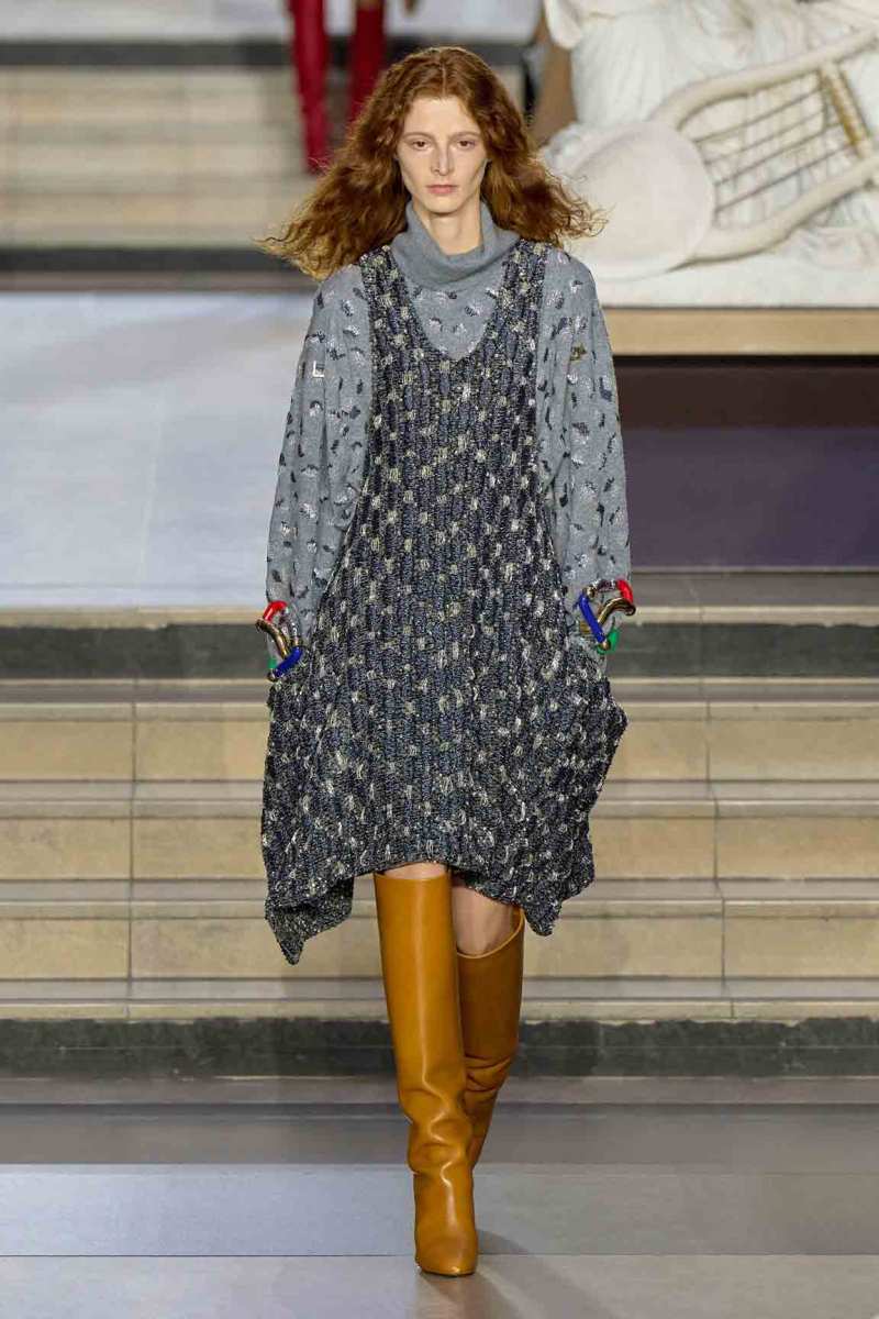 Gli abiti si presentano quasi eterei, delicate stoffe avvolgono la figura femminile sino ai piedi e vengono accompagnati da maglioni oversize di varie fantasie, restituendo un’immagine quasi immateriale della donna. Non mancano texture e stampe variegate. Una maglieria vasta, dai colli a lupetto allo scollo a V, senza escludere pullover abbinati a gonne a palloncino e vestiti.