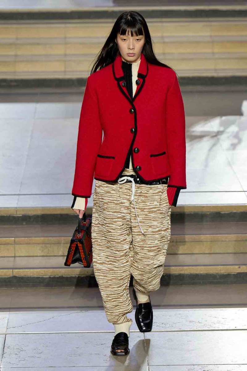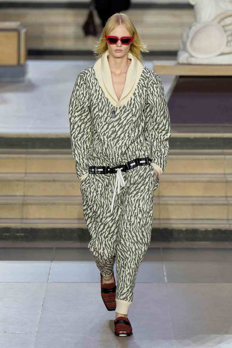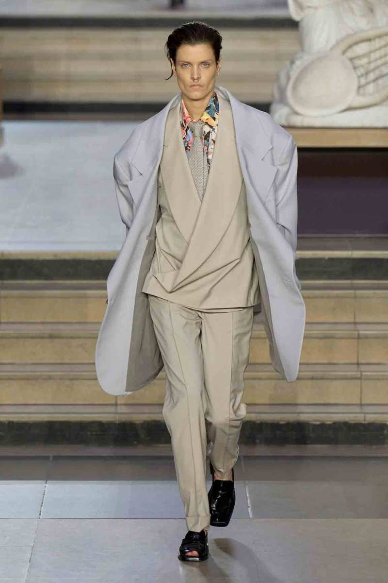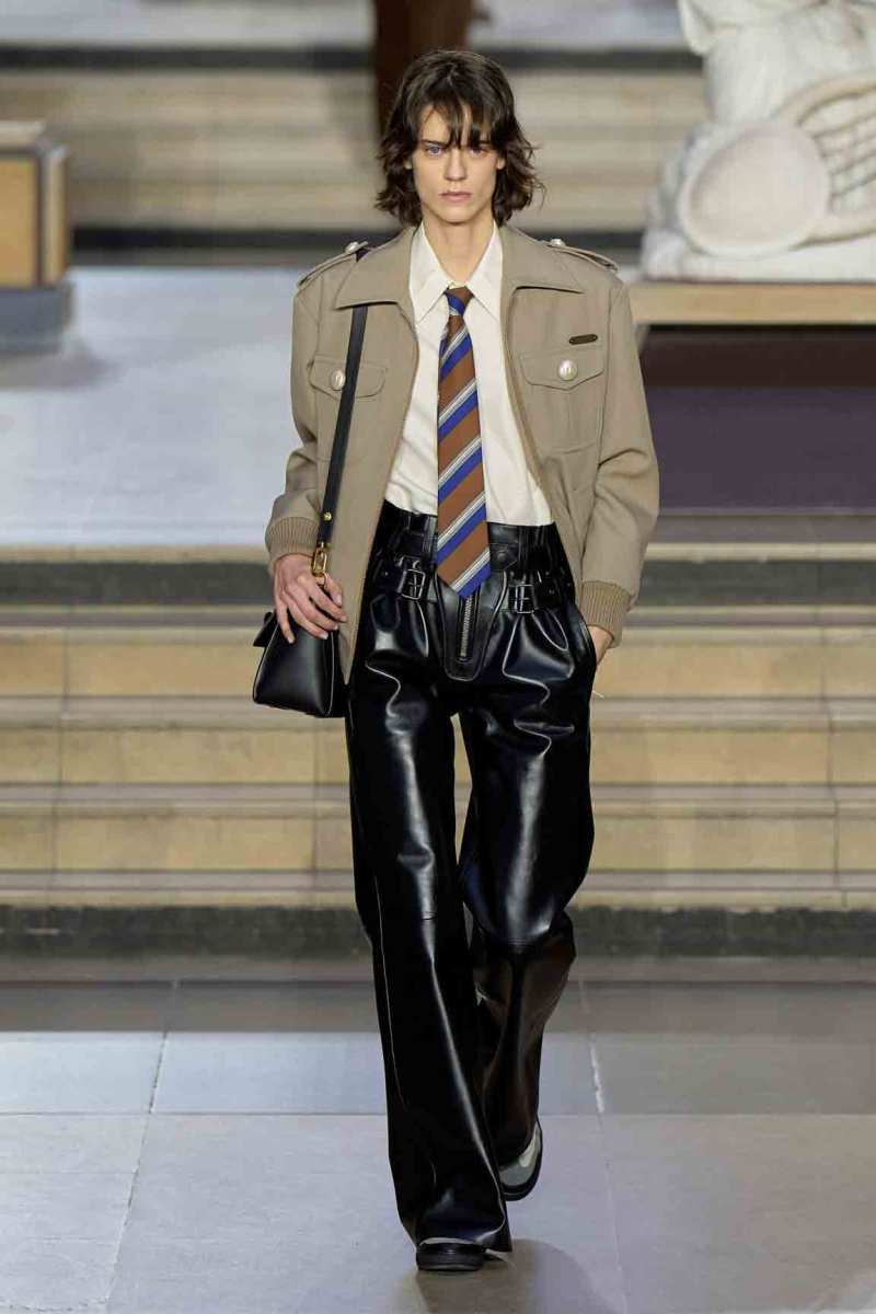 Vengono proposti capi maxi dallo stile baggy accompagnati da sneakers, sandali o mocassini in pelle entrambi dalla punta forata. L’unico tacco ammesso è quello degli stivali silhouette, alti fino al ginocchio e dal taglio morbido, in pelle marrone rossa o cammello. Accessorio che non può mancare è la cravatta, abbinata ai foulard in seta più disparati della maison francese, intrecciati nei colletti delle camicie per un look chic.
