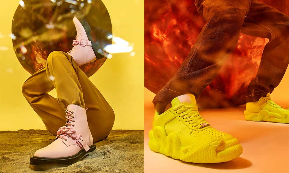 Non da meno anche la collezione uomo, che presenta modelli in bilico tra passato e futuro. I mocassini Euro Loafer dai vivaci abbinamenti cromatici sulla pelle verniciata, trattata per ottenere un effetto gommato opaco; i combat boots nei colori pastello con maxi catena. Tra le sneakers troviamo invece le Zenas, arricchite dall’iconica placca metallica del marchio, in un motivo zebrato impreziosito da un tocco giallo fluo; in ultimo, ma non per importanza, le nuove sneakers Cobras svelano un serpente 3D che avvolge il piede, creando una silhouette sinuosa e di sicuro impatto.