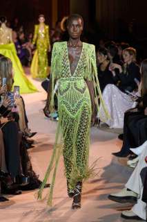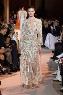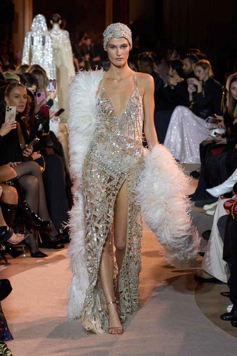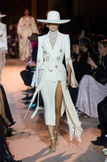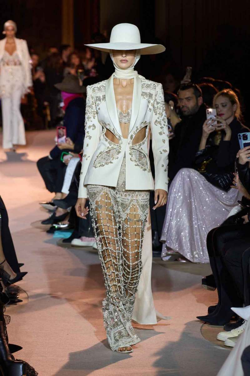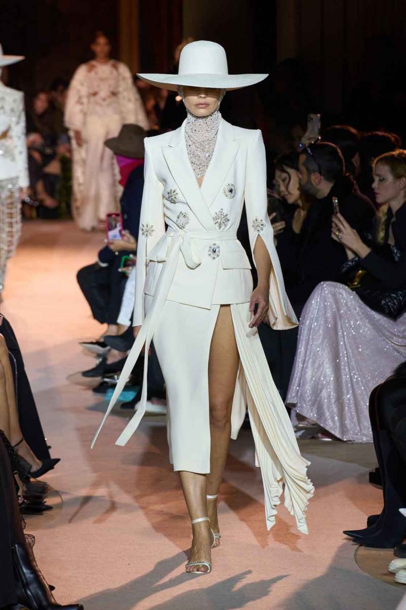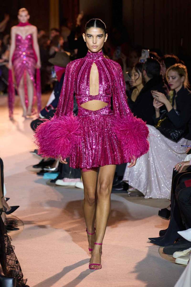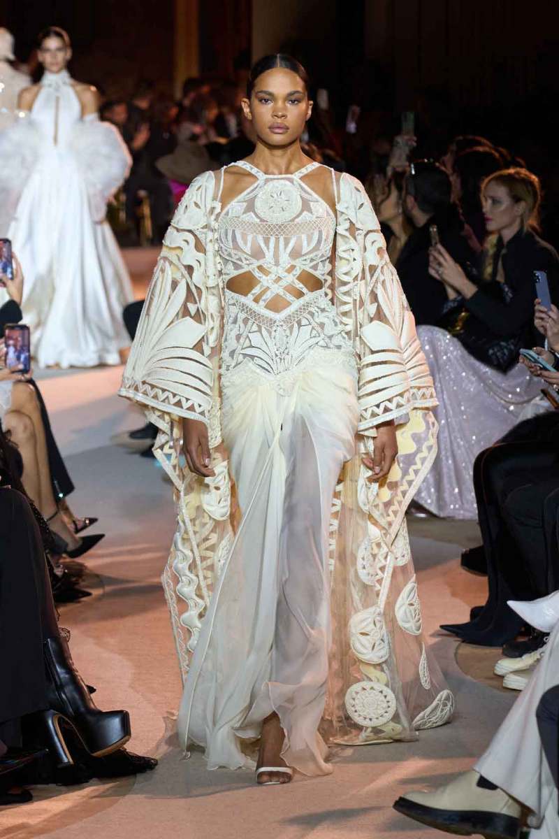 Le silhouette, invece, ricordano gli anni ’70, con una languida sensualità, parte di una fioritura estetica dell’epoca. Le tonalità degli abiti sono accesee variegate; passano dal rosa al fucsia, dall’arancio al giallo, dal verde a sfumature del blu, fino ad arrivare al bianco. Per chiudere la sfilata, che ha avuto la bellezza firmata Sofia Tilbury, lo stilista libanese ha presentato la sua versione da sposa. La modella indossa un abito realizzato interamente in pizzo, con una mantella dello stesso tessuto, un cappello e un velo di tulle, che, oltre a essere trascinato in passerella, copriva anche la testa della modella. L’abito, realizzato senza cristalli o lucentezza, ma con molti ricami macramè, è stato uno dei capi che rimarrà nella storia dello stilista.