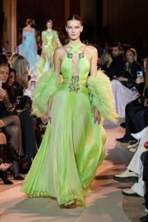 Murad, famoso per aver vestito celebrità come Beyoncé e Jennifer Lopez per i red carpet delle premiazioni, ha iniettato leggerezza, lucentezza e tanto colore nella presentazione dei suoi pezzi. Ispirata alla Belle Epoque, la casa di moda libanese reinventa l’eleganza e lo splendore dei giorni di gloria della Costa Azzurra degli anni ’70, evocando lo spirito gioioso di quei tempi. “Era un periodo di feste, bei festeggiamenti e colori del tramonto”. Nelle note dello spettacolo, il designer ha fatto un cenno a “una nuova generazione di ereditiere [che] riportano in vita la loro eredità familiare”, con riferimento agli anni ’20 e “la libertà dei giorni azzurri e dorati pieni di risate, segreti e sensualità ( …) il residuo della vita notturna di un’epoca passata”.