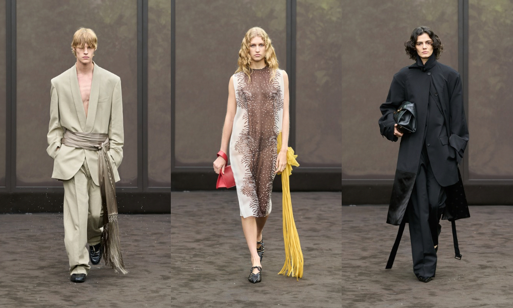 Il capitolo accessori e calzature mostra la capacità di Ferragamo di innovare rimanendo fedele alla propria tradizione. Le scarpe sono vere e proprie sculture da indossare: tacchi a esse che reinterpretano con forza il celebre tacco a F, pump con catene Gancini che diventano gioielli per il piede, mule da boudoir in raso impreziosite da ricami floreali. Ogni modello racconta un equilibrio tra memoria e novità. Le borse, invece, ampliano l’iconografia della maison: la Hug Bag si rinnova in materiali inediti come vernice e nabuk intrecciato, mentre modelli con piume leggere o con fibbie Gancini raccontano storie di eleganza sussurrata. Non mancano versioni maschili dalle linee sobrie e artigianali, a dimostrazione che Ferragamo riesce sempre a tenere insieme tradizione sartoriale e immaginazione creativa, offrendo un lusso che evolve senza mai perdere la sua identità.