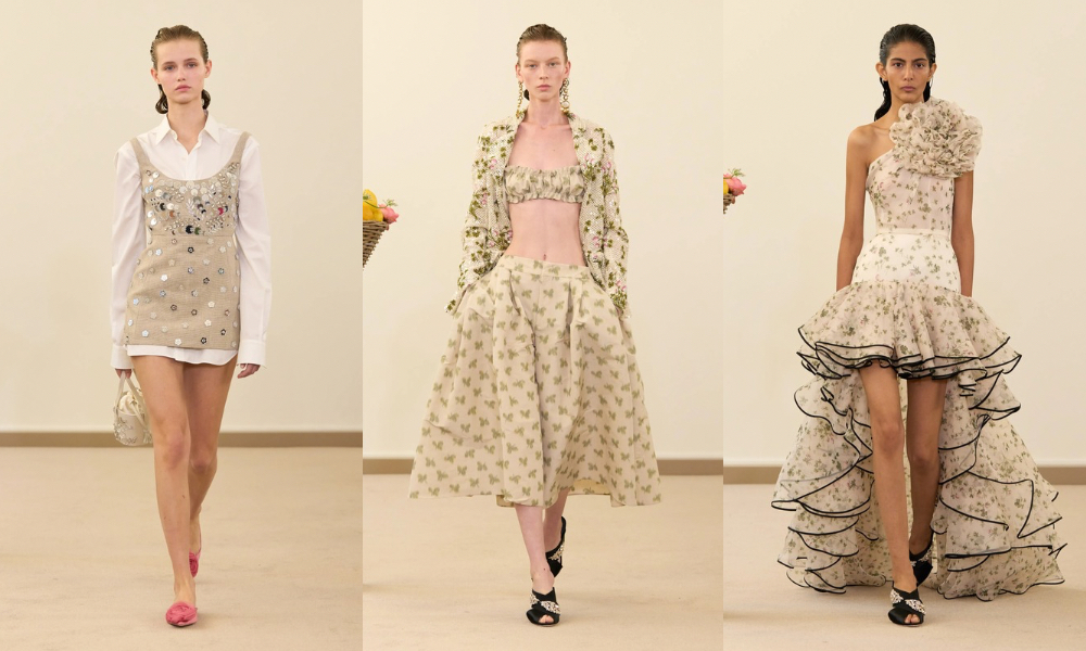 I capi si muovono tra struttura e leggerezza: miniabiti in canvas rigido si alternano ad abiti lunghi vaporosi, maniche balloon e gonne fluttuanti che sembrano sospese nel tempo. Le stampe evocano fiori dimenticati in un vaso, frutti maturi colti nella penombra di un interno olandese. La tavolozza cromatica è intima, avorio, cipria, crema, oro pallido, mentre i tagli si semplificano per lasciar spazio alla purezza delle linee. È un’eleganza che non cerca lo stupore, ma la sincerità: quella di un gesto che nasce dall’emozione e non dalla tendenza.